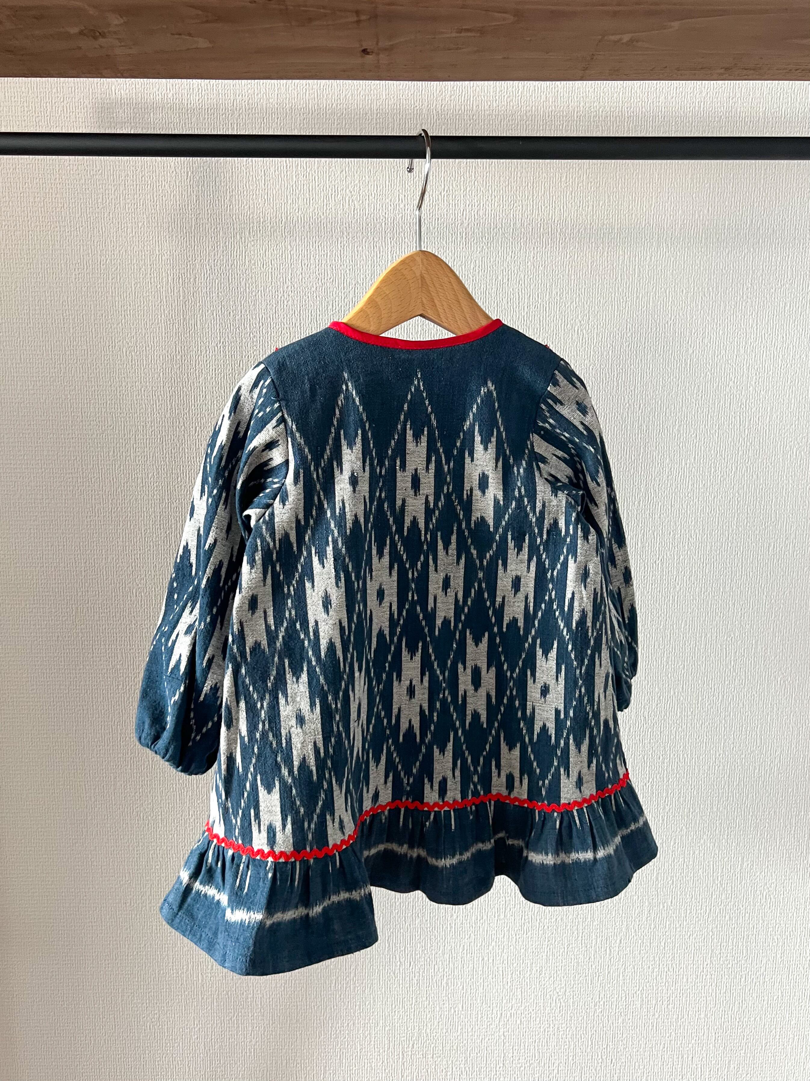 タイの手織りで作られた、かすり柄の生地で製作したワンピース。indigoの渋さの中に、パキッとした赤を効かせて、かっこよさの中にも、可愛らしさもある1着です。胸元のヨーク部分はインド綿を使用し、薄く綿を入れ、ひと針ひと針ハンドステッチを施し、キルティング加工にしています。ハンドステッチならではの味わいもプラスされて、とても良い雰囲気に仕上がりました。