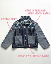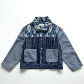 タイの手織りで作られた、かすり柄の生地に合わせたのは刺し子生地。この刺し子の生地は藍染でも珍しい、糸に染めてない部分を作りムラ感を表現した綛(かせ)染め。子供服ではなかなか見つけられない