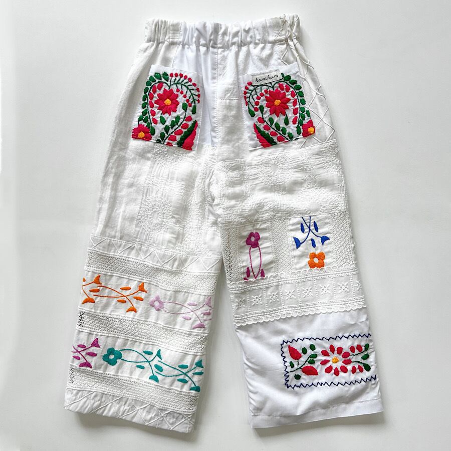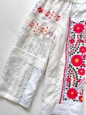 usedのㅤㅤㅤㅤㅤㅤㅤㅤメキシコ刺繍のワンピースやブラウスから生地を取った、発色がとても綺麗な花柄刺繍をポイントに。レース生地やレースリボン、色々なWhiteの生地をパッチワークして製作した、patchwork easy pants。同じ白でも、生地の風合いや色味がそれぞれ違う、個性豊かな生地の組み合わせが、魅力の1着です。インナーにペチコートをつけているので、透けずに着ていただけます。