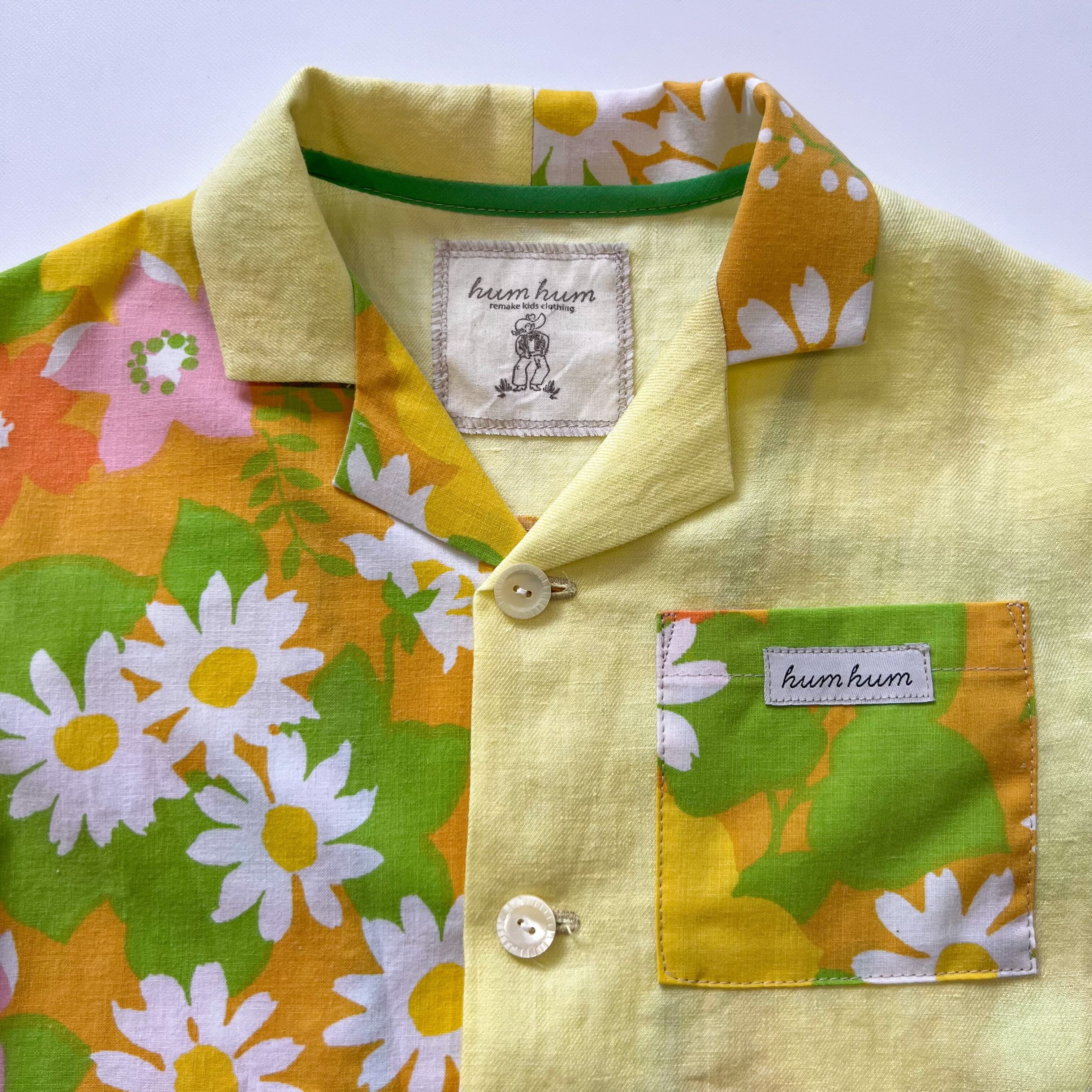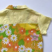 カラフルな花柄のvintage生地と、サラッとしたリネン生地をミックスして、100サイズの開襟シャンを製作しました。発色が綺麗な生地合わせがとても魅力です。細かいディテールにも拘り、前見頃、襟、後見頃のヨーク部分に、2つの生地が良い感じにミックスするように、それぞれ切り替えました。