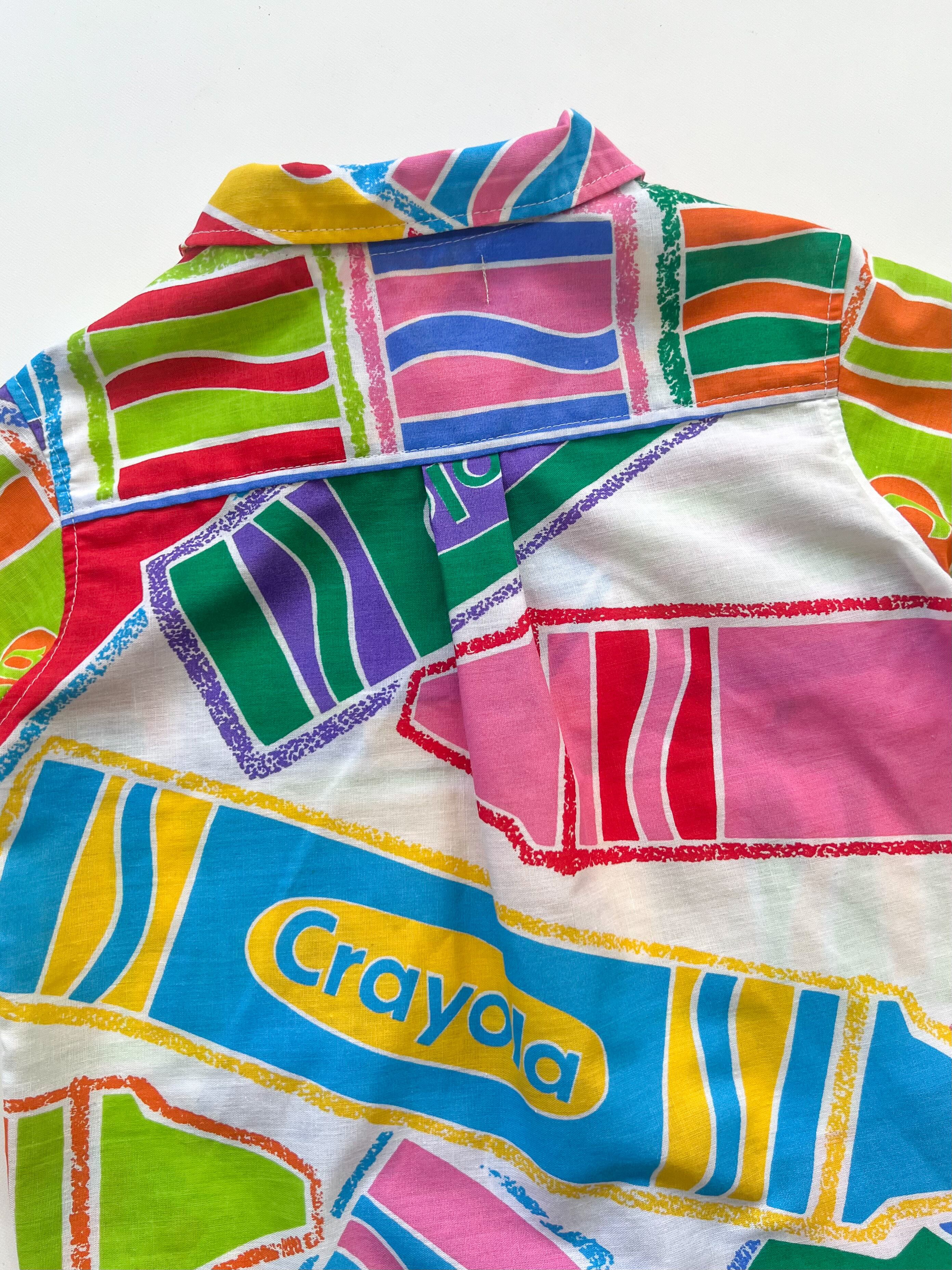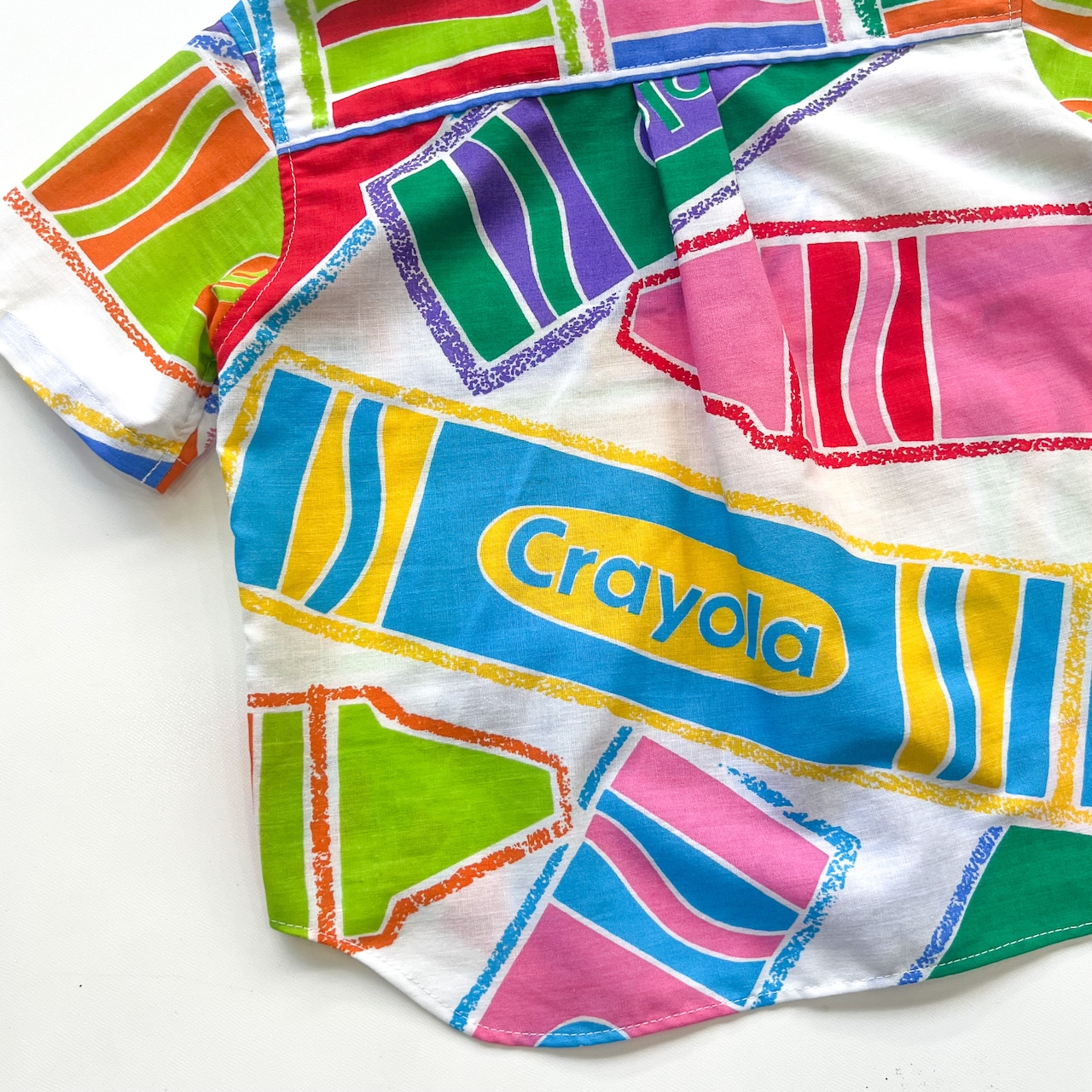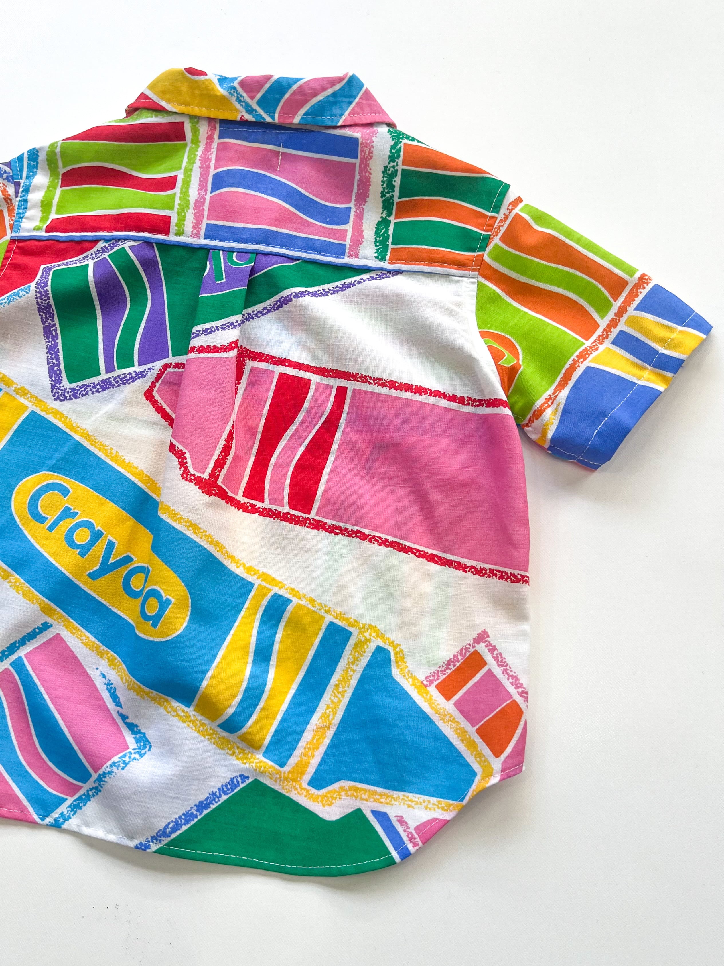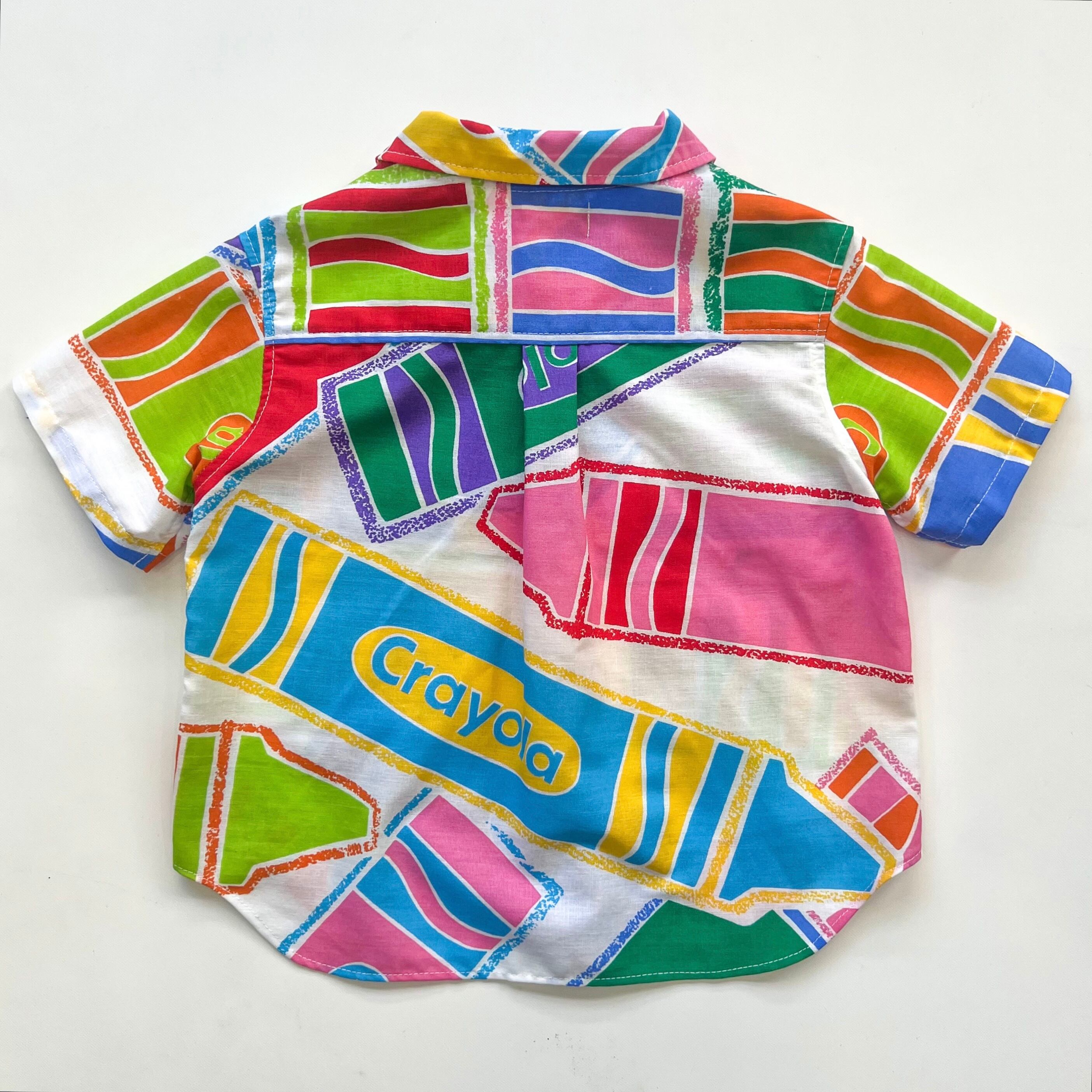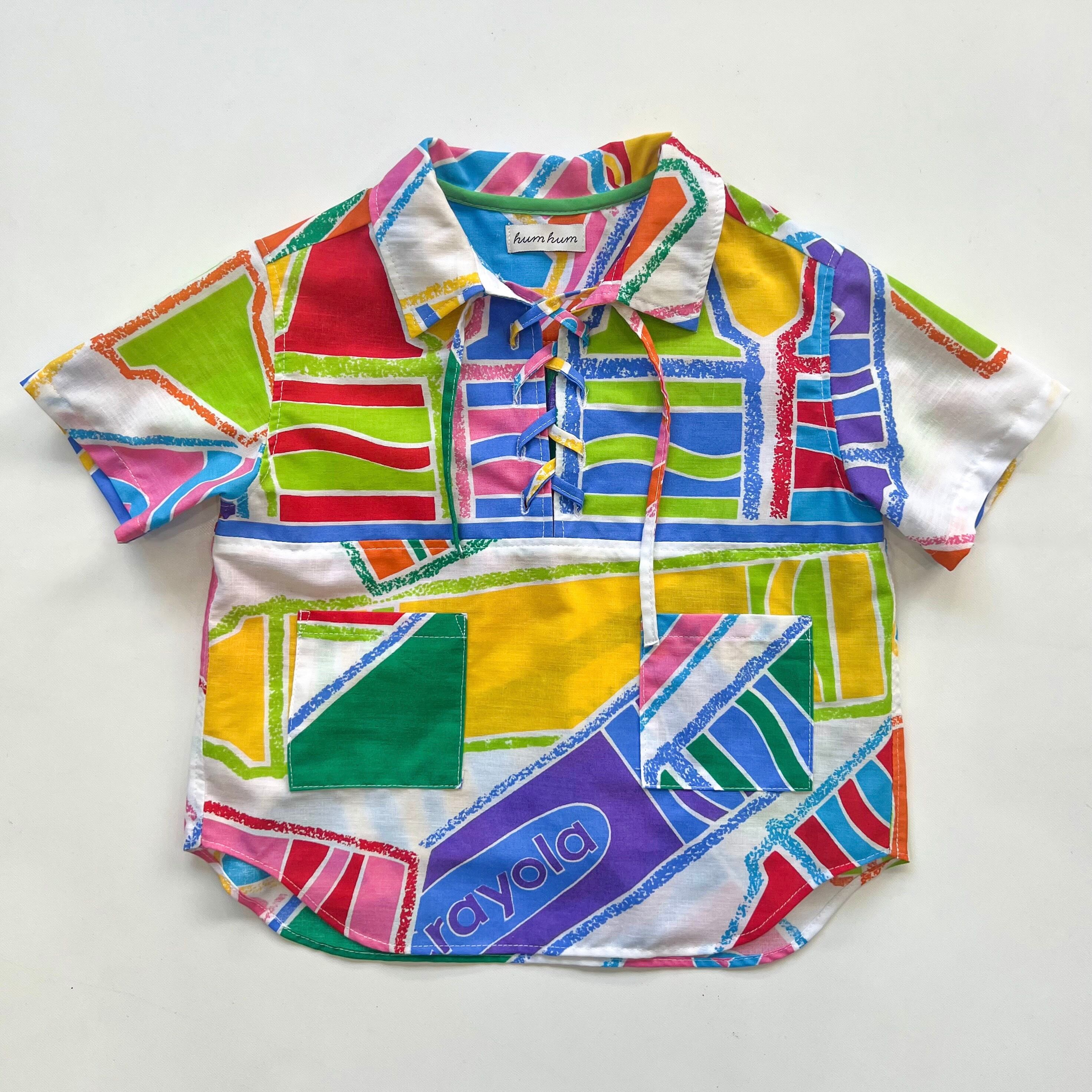 ポップで色彩がとても綺麗なクレヨン柄のvintage生地を、キッズサイズのレースアップシャツにリメイクしました。ディテールにも拘り、胸元はレースアップで抜け感を出しつつ、裾はラウンドカットにしました。このラウンドカットによってショートパンツでも太めのパンツでもバランス感が良く、どんなボトムスでも合わせやすいです。
