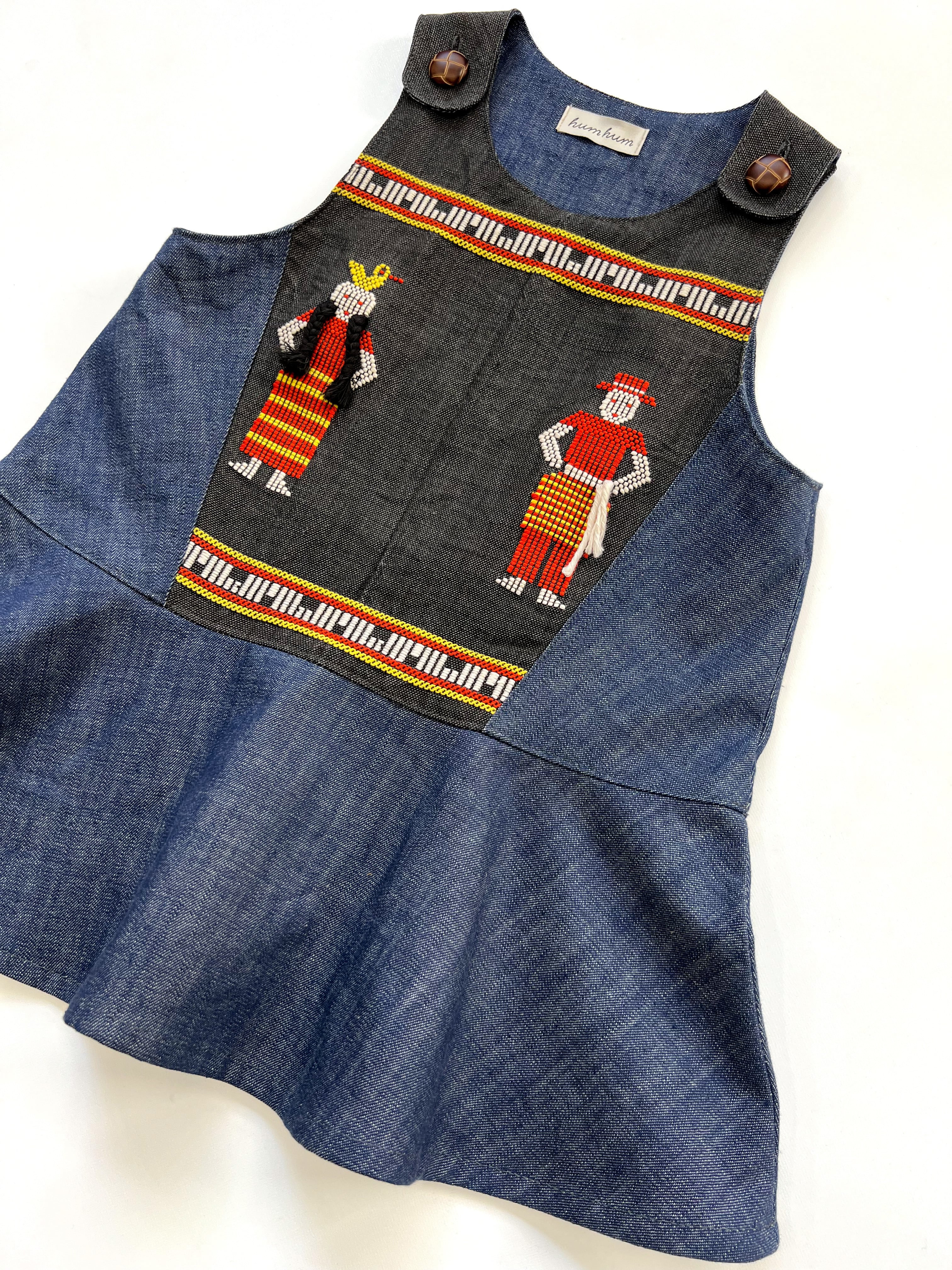 グアテマラの一つ一つ手作業で織られる伝統的な手織りの生地。その生地にパリッとした濃紺のデニムを合わせて、ジャーパースカートを製作しました。グアテマラ生地はカラフルな色味も多いなか。たまらない渋めのスミ黒。