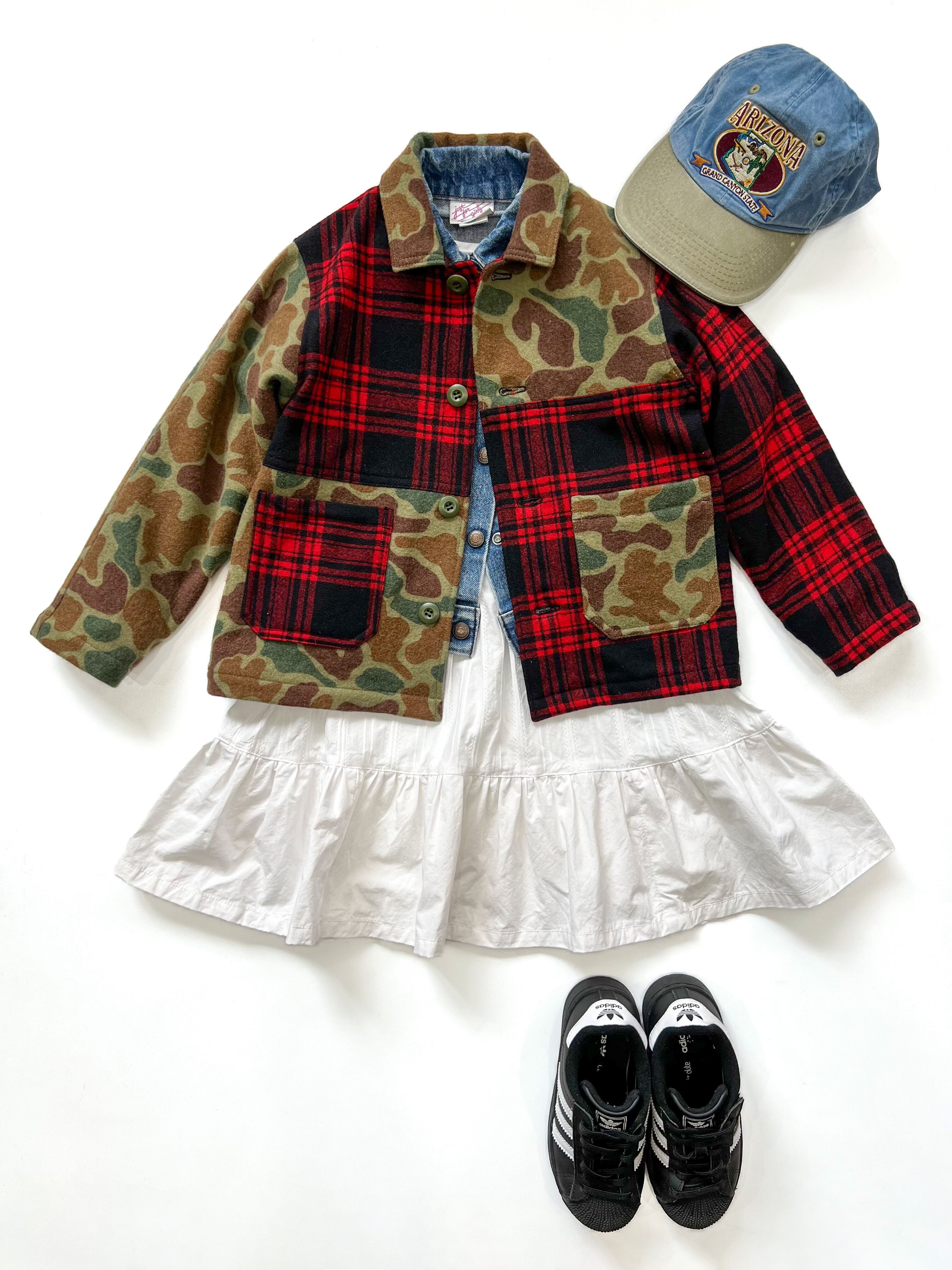 70年代のPENDLETONのウールチェックシャツと。90年代のWOOLRICHのカモフラージュ柄ウールシャツを一度解体して、キッズサイズのカバーオールに再構築した。スペシャルアイテムです。2つの個性の違った生地が絶妙にミックスされ、大人顔負けの渋さに仕上がっております。ミリタリーボタンも雰囲気をプラス。