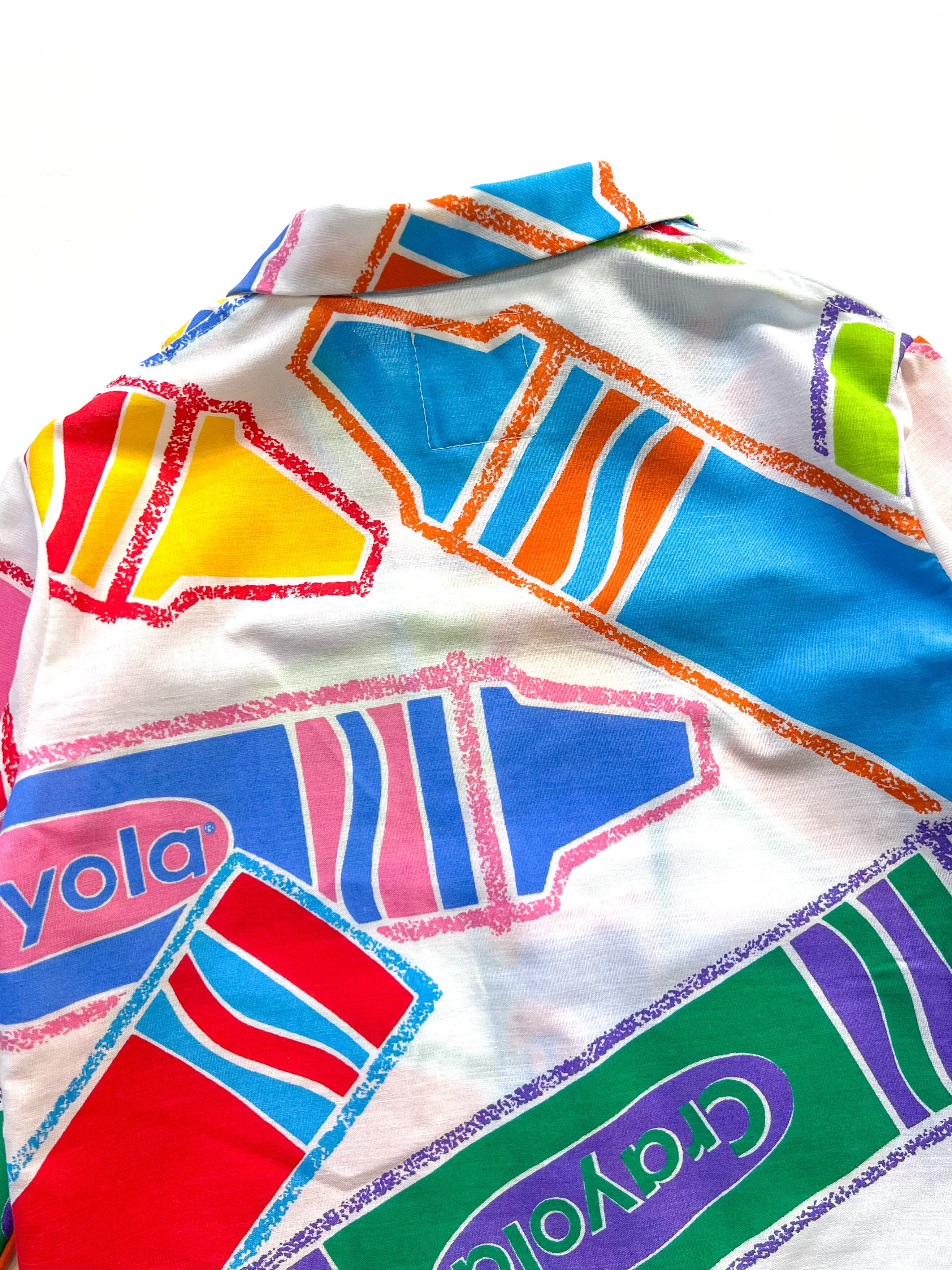ポップで色彩がとても綺麗なクレヨン柄のvintage生地をキッズサイズの長袖の開襟シャツにリメイクしました。なかなか見つけることのできない、ユニークなプリントもvintage生地の魅力のひとつでもあります。