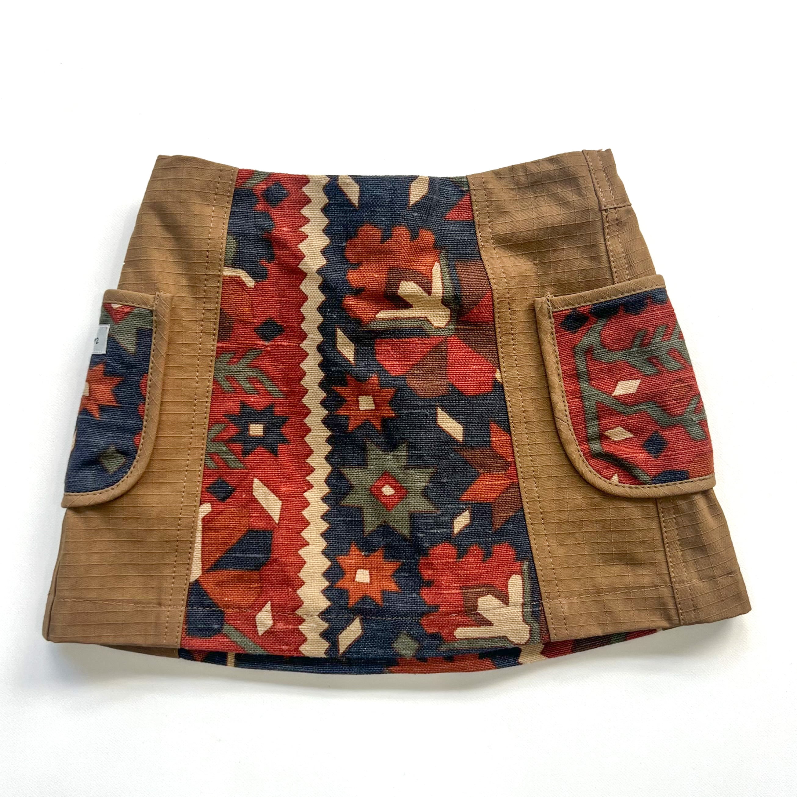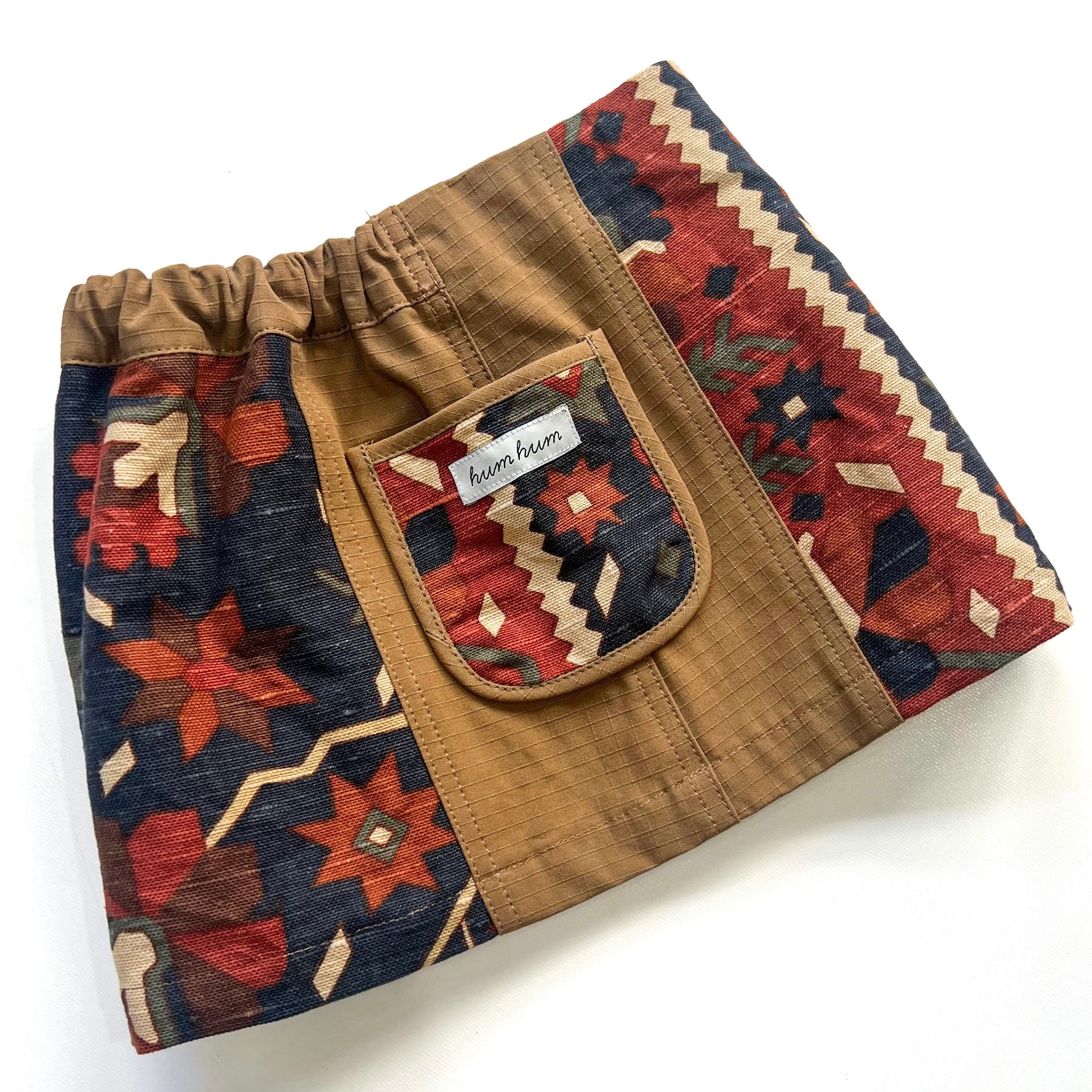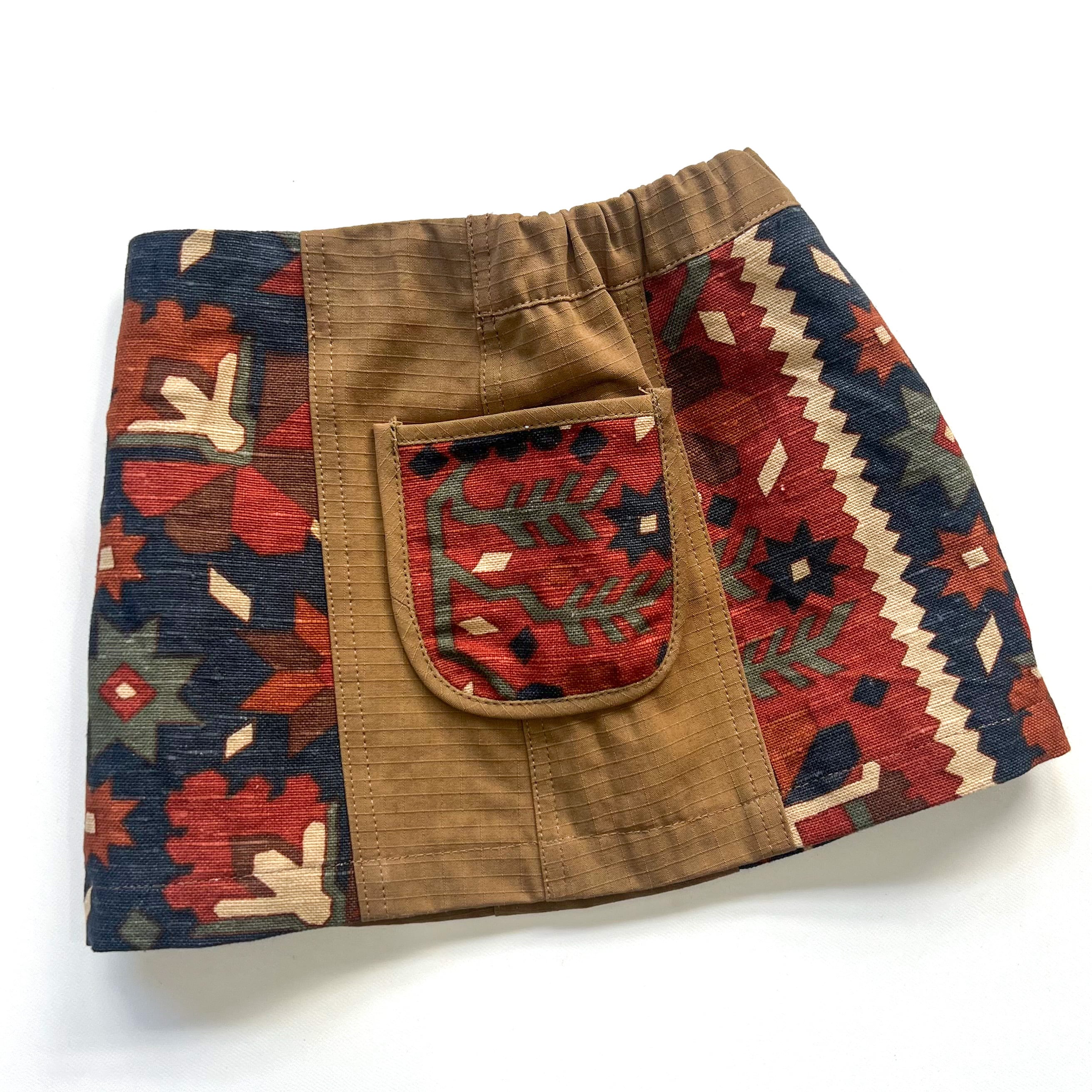 90'sのイギリス製vintageの花柄生地と、アウトドアウェアでもよく使われる、破れにくく強度の高いリップストップナイロン生地を組み合わせて、ウエストがゴムでとても穿きやすいミカスカートを製作しました。