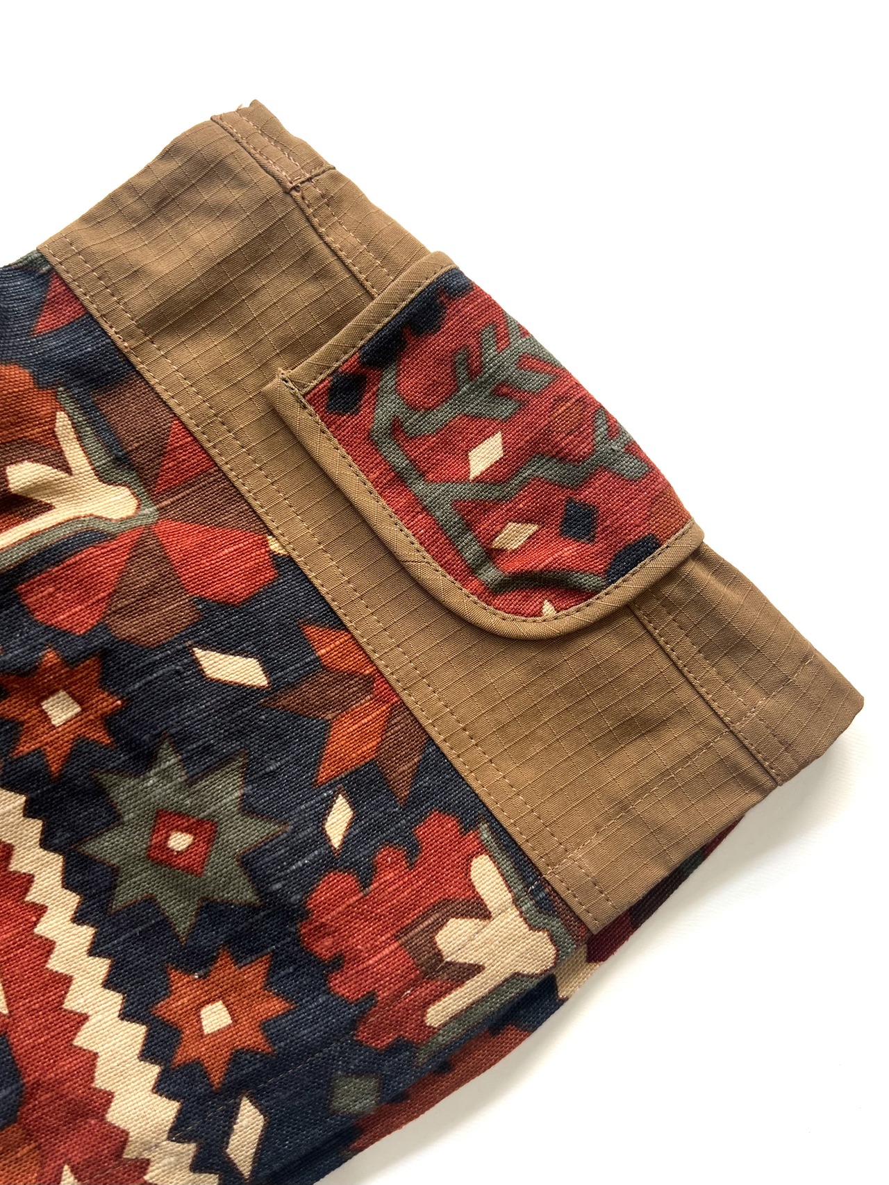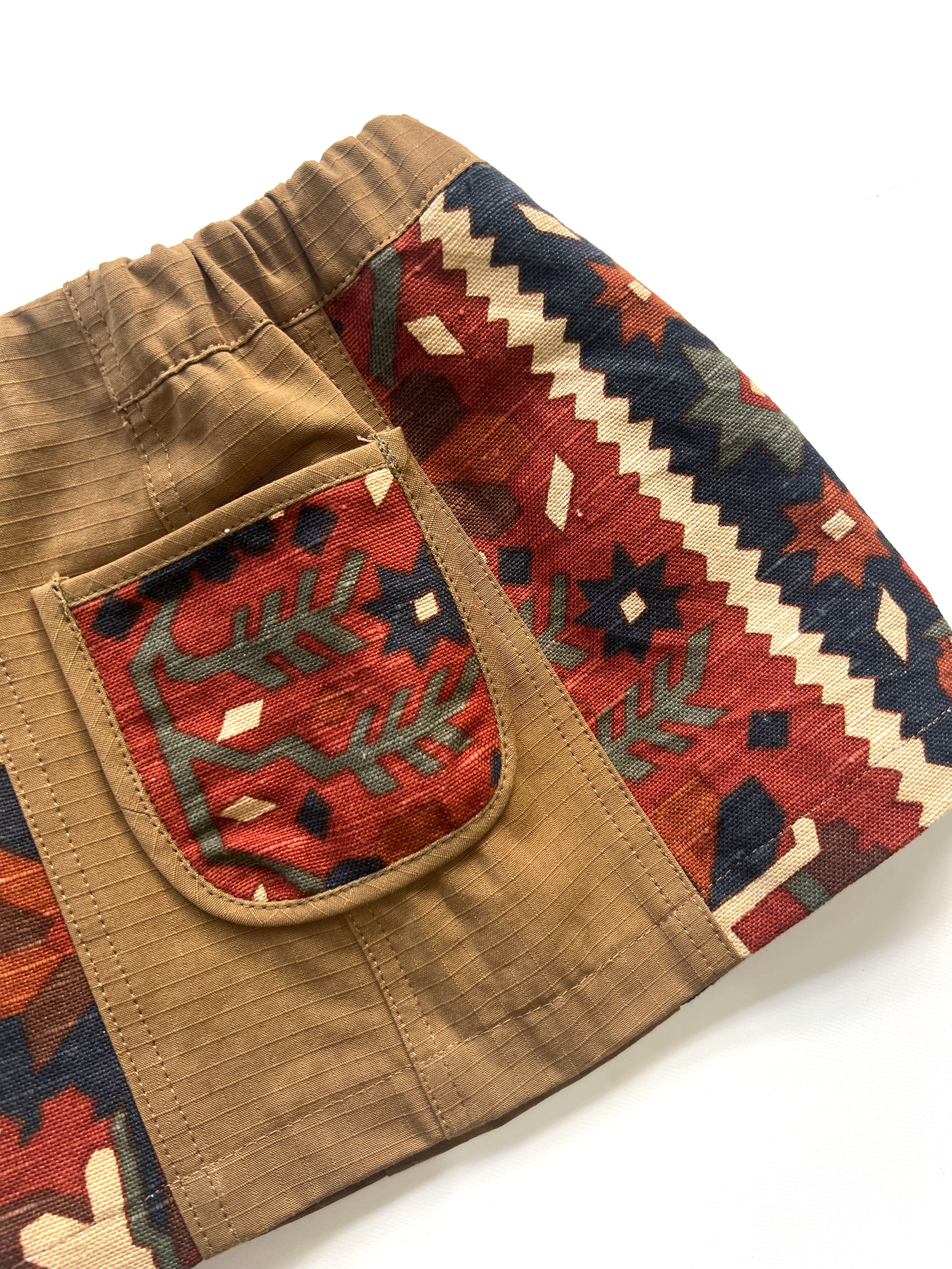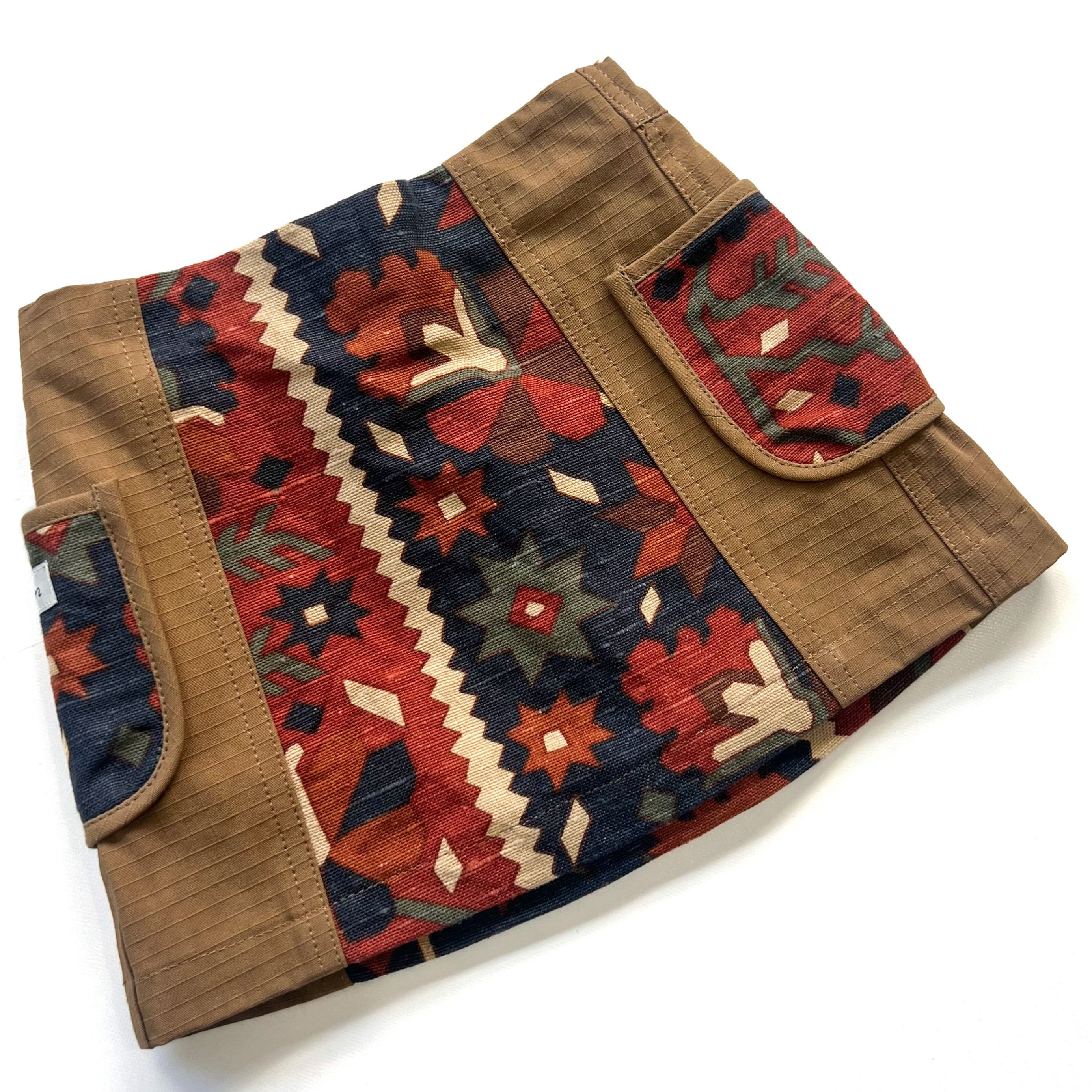 90'sのイギリス製vintageの花柄生地と、アウトドアウェアでもよく使われる、破れにくく強度の高いリップストップナイロン生地を組み合わせて、ウエストがゴムでとても穿きやすいミカスカートを製作しました。
