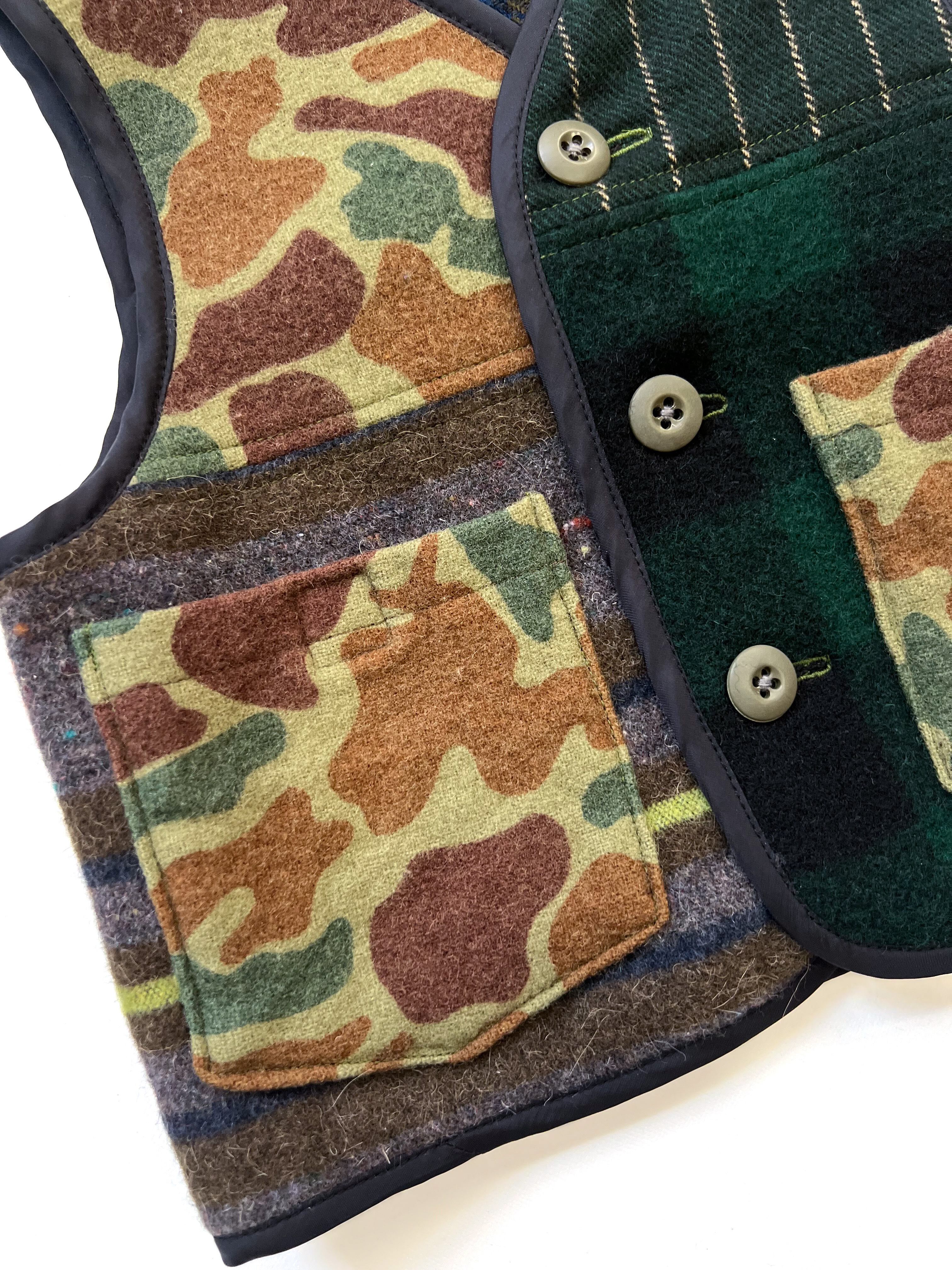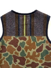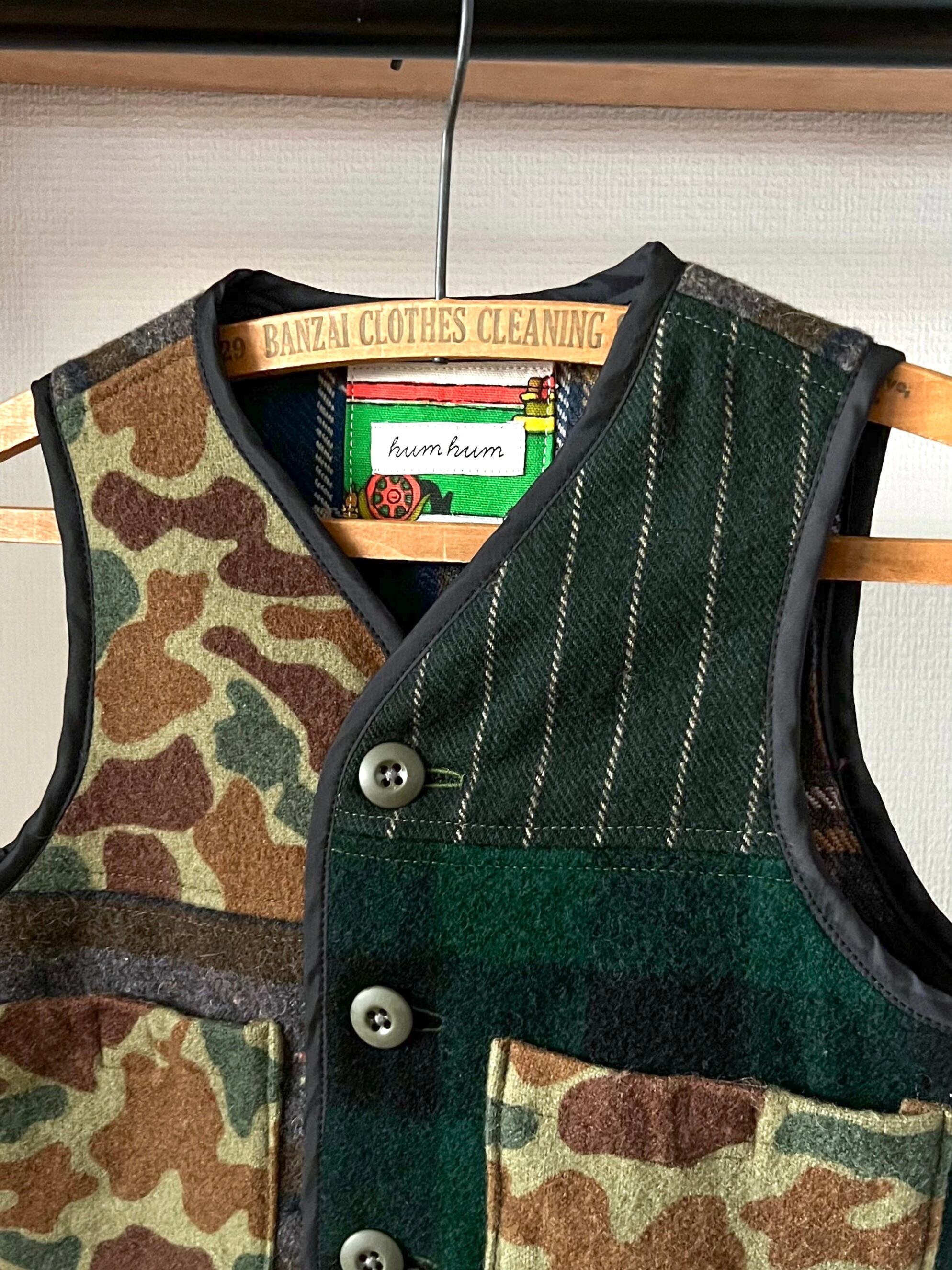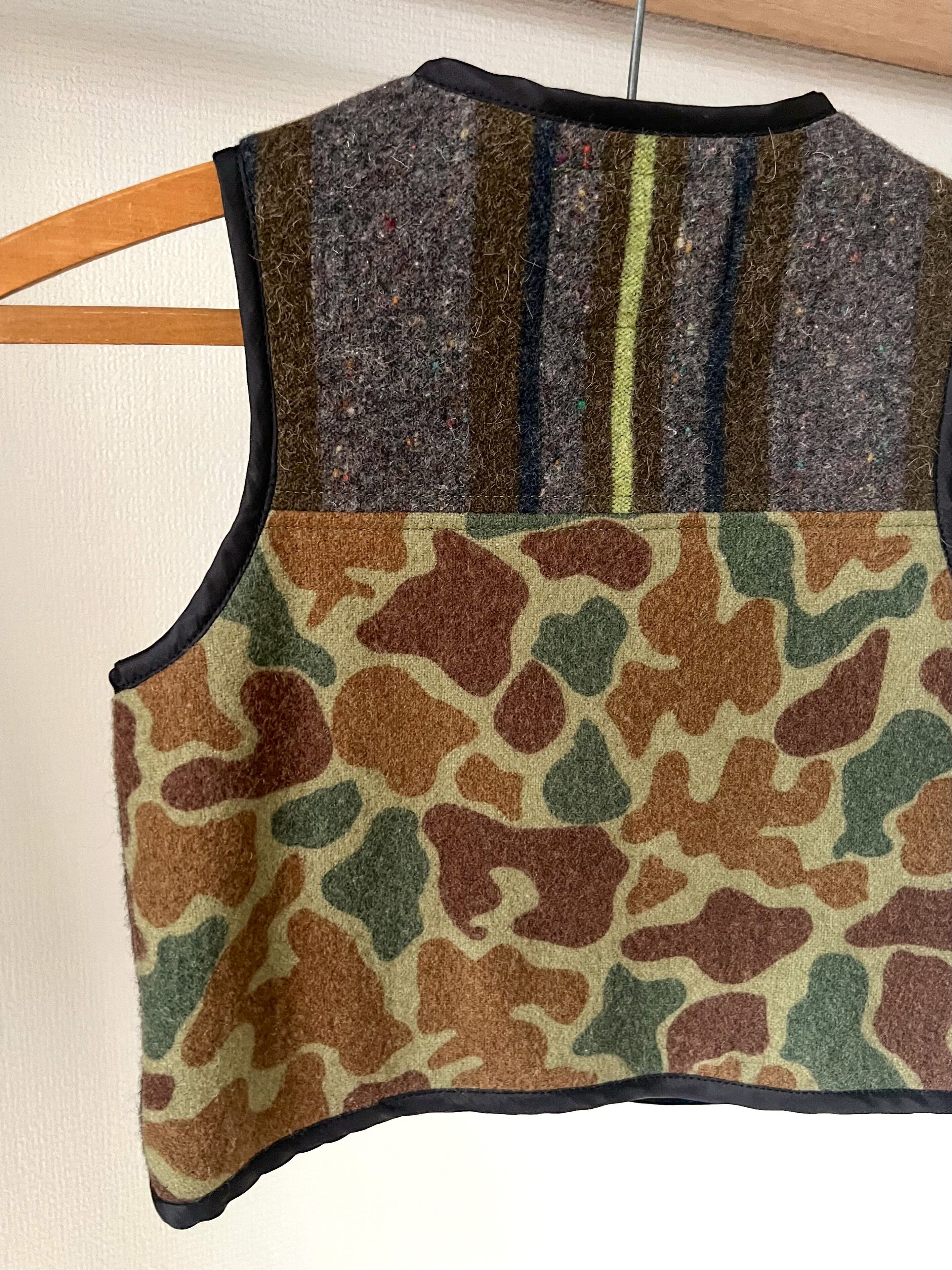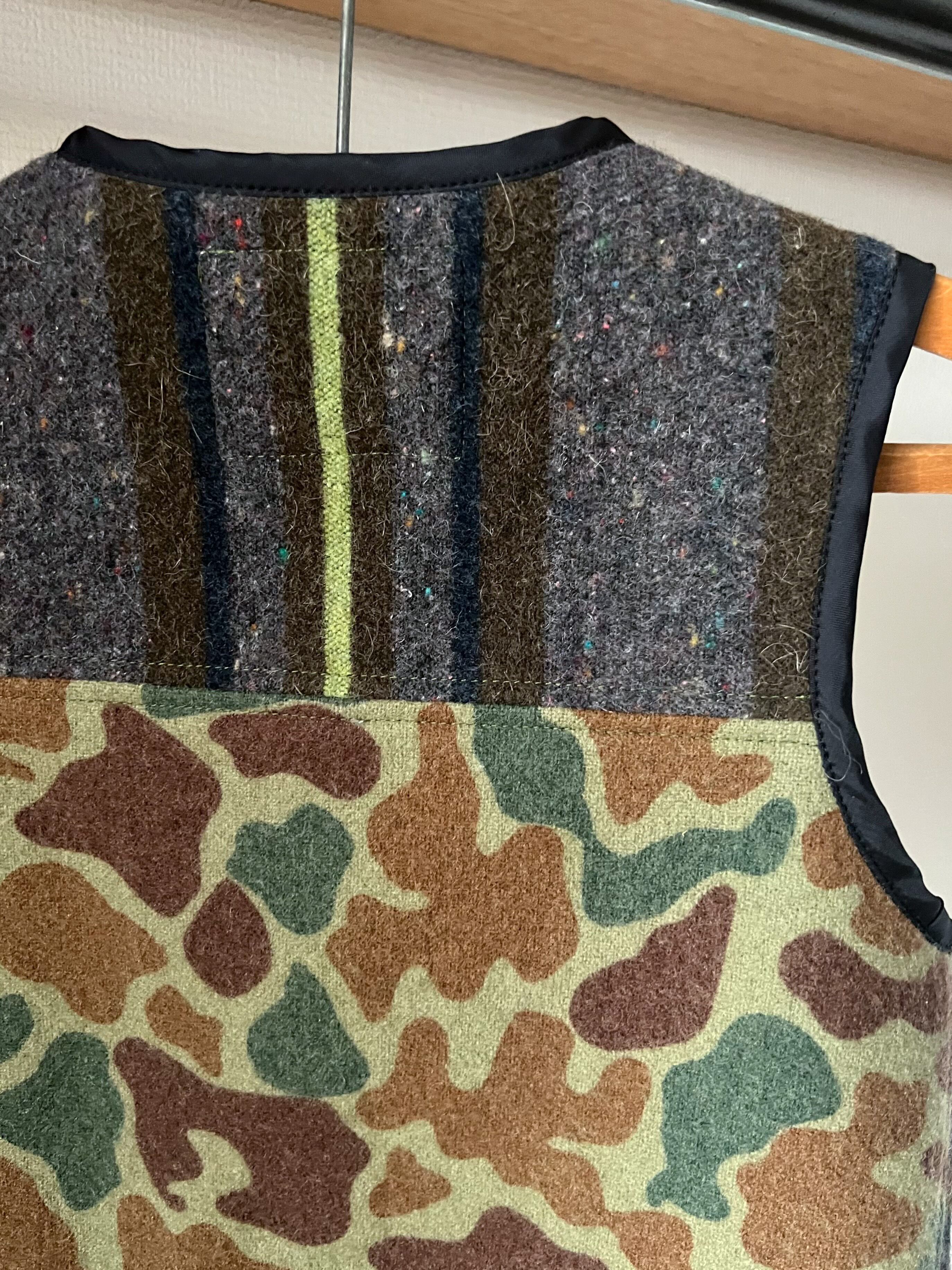 90年代WOOLRICHのカモフラ柄のウールシャツ。ボーダーのウールブランケットや、バッファローチェックの生地。同系色の個性の違った4種類のウール生地をパッチワークしたスペシャルなベストです。柄の絶妙な配置もぜひ楽しんでいただきたい1着です。