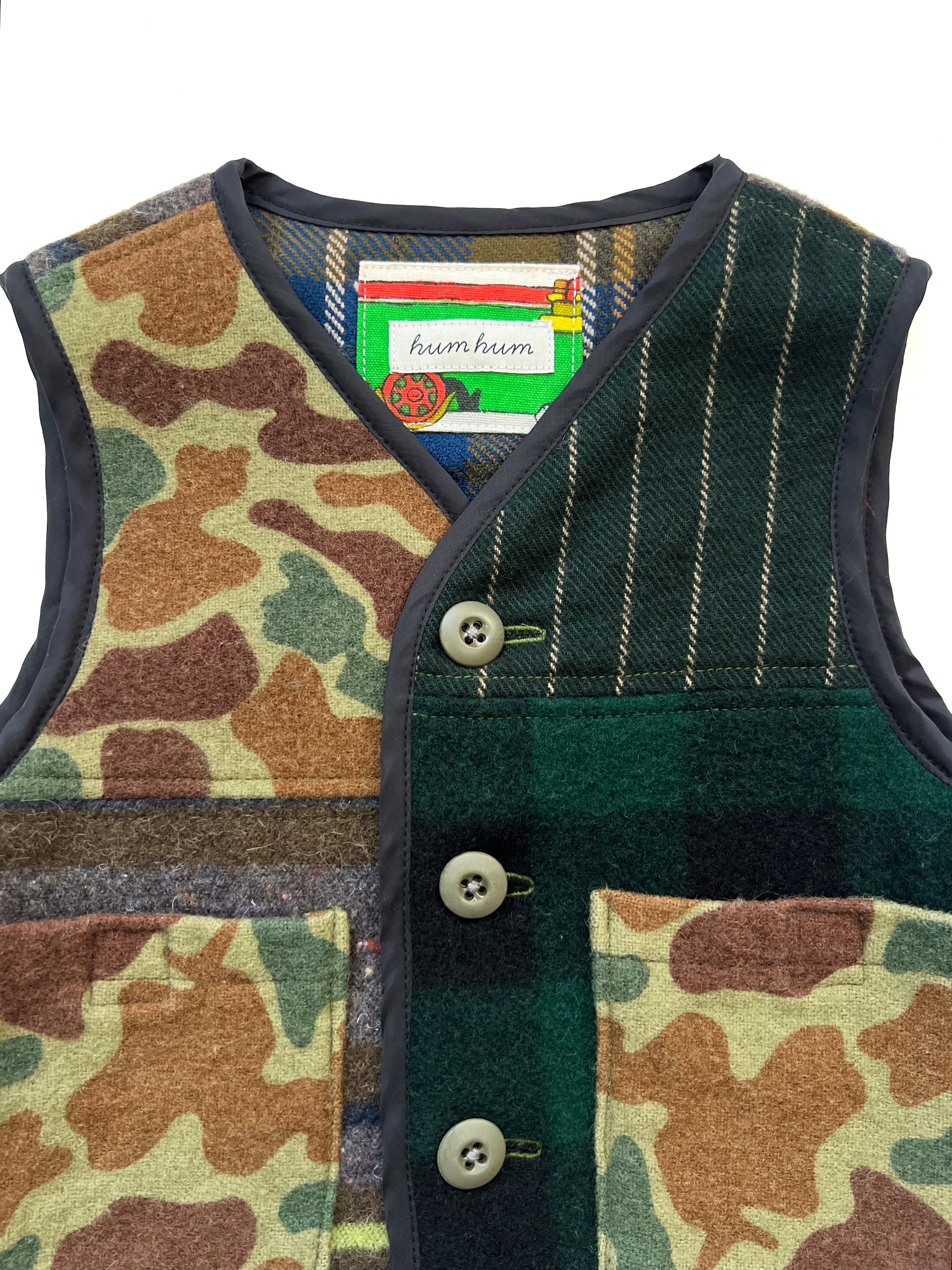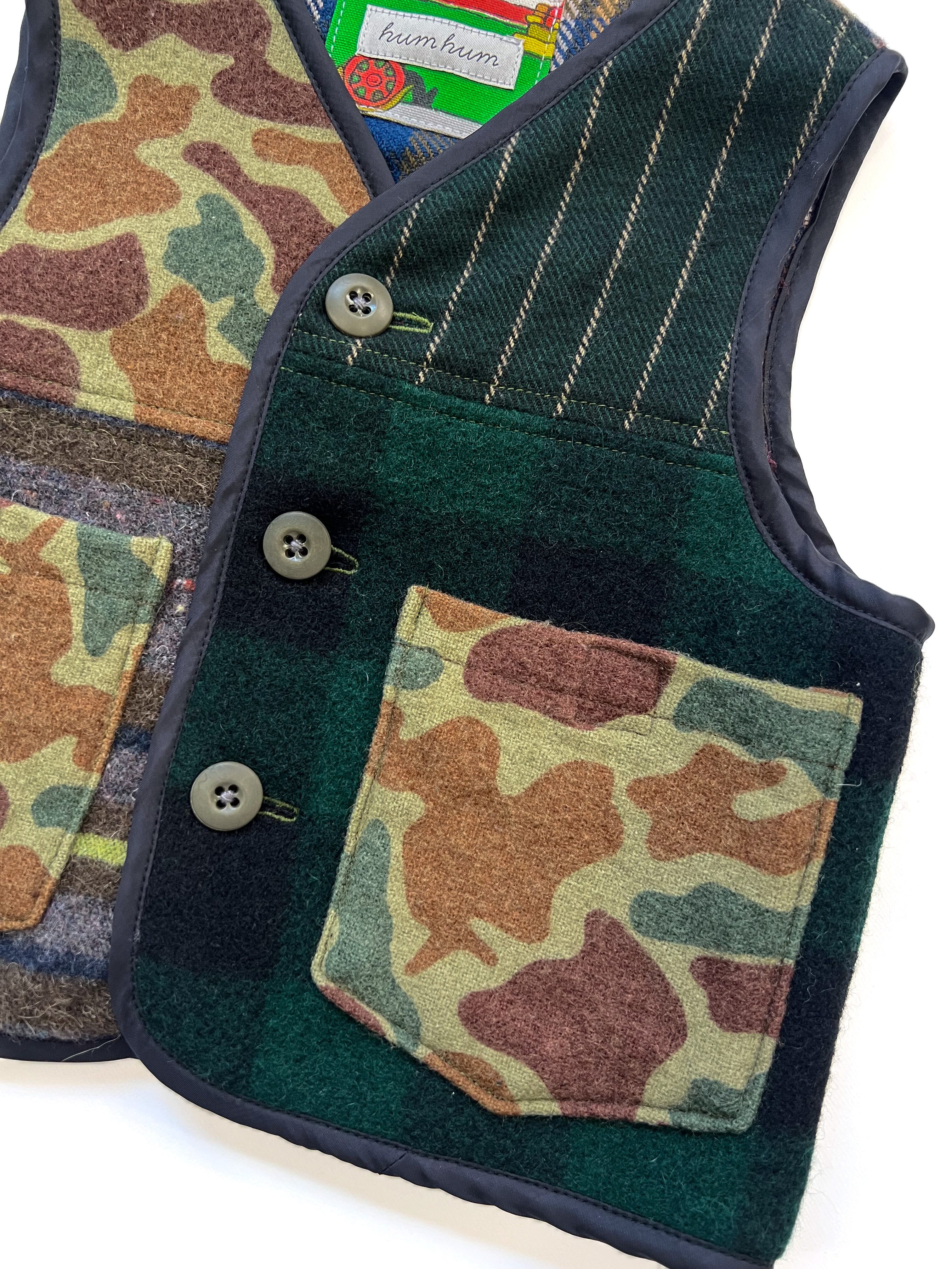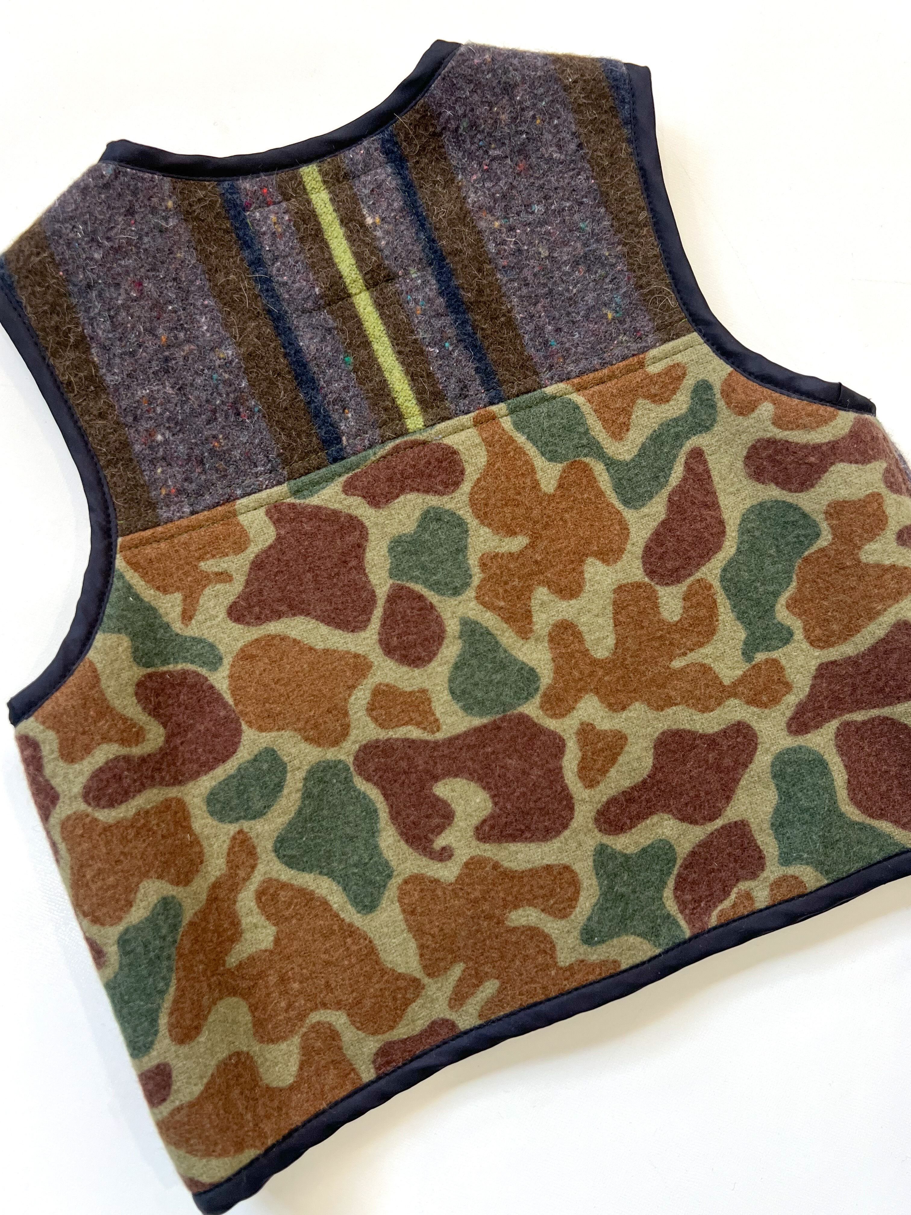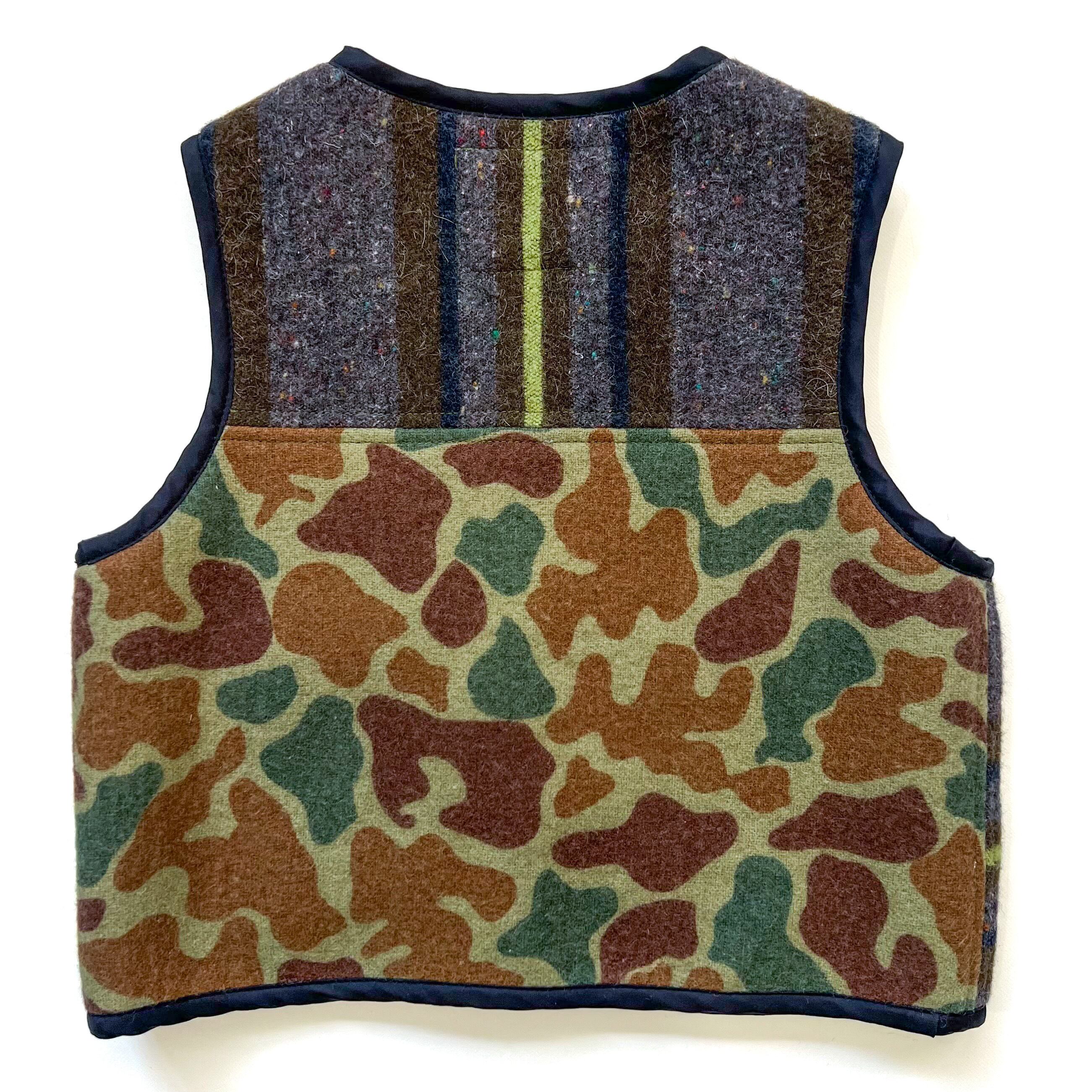 90年代WOOLRICHのカモフラ柄のウールシャツ。ボーダーのウールブランケットや、バッファローチェックの生地。同系色の個性の違った4種類のウール生地をパッチワークしたスペシャルなベストです。柄の絶妙な配置もぜひ楽しんでいただきたい1着です。