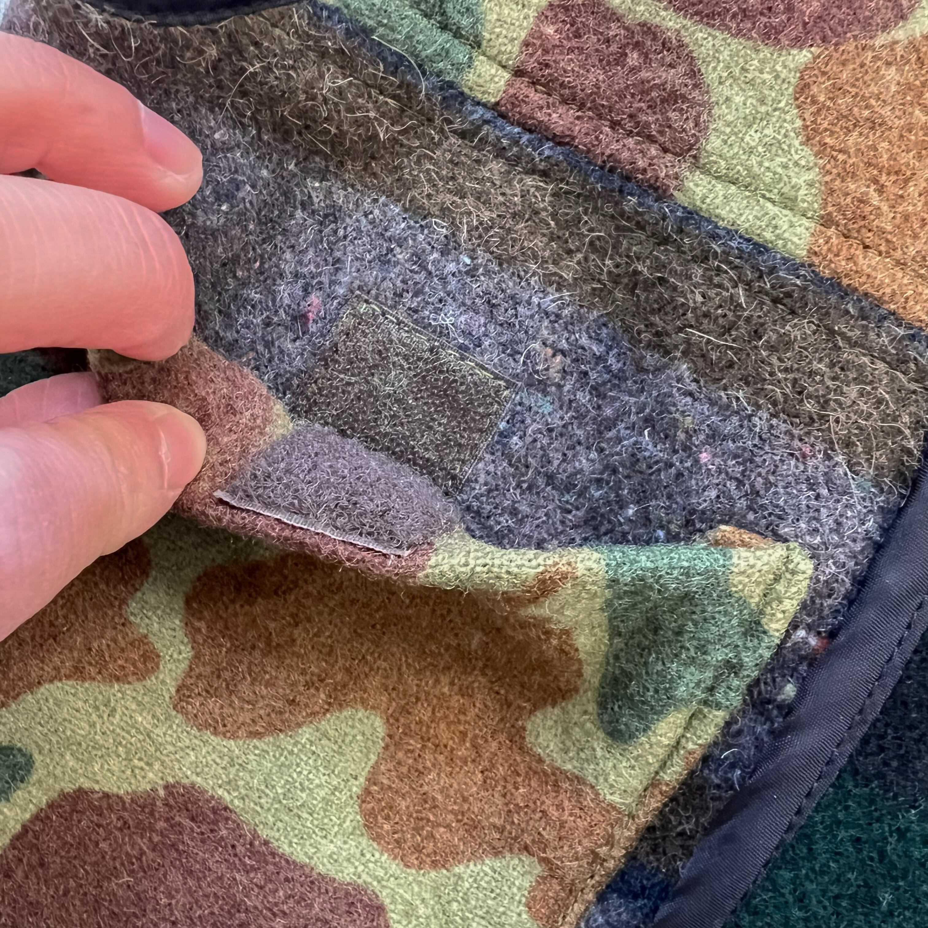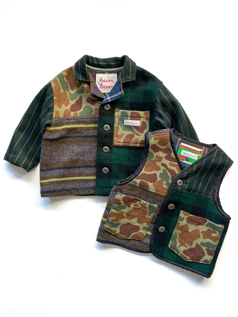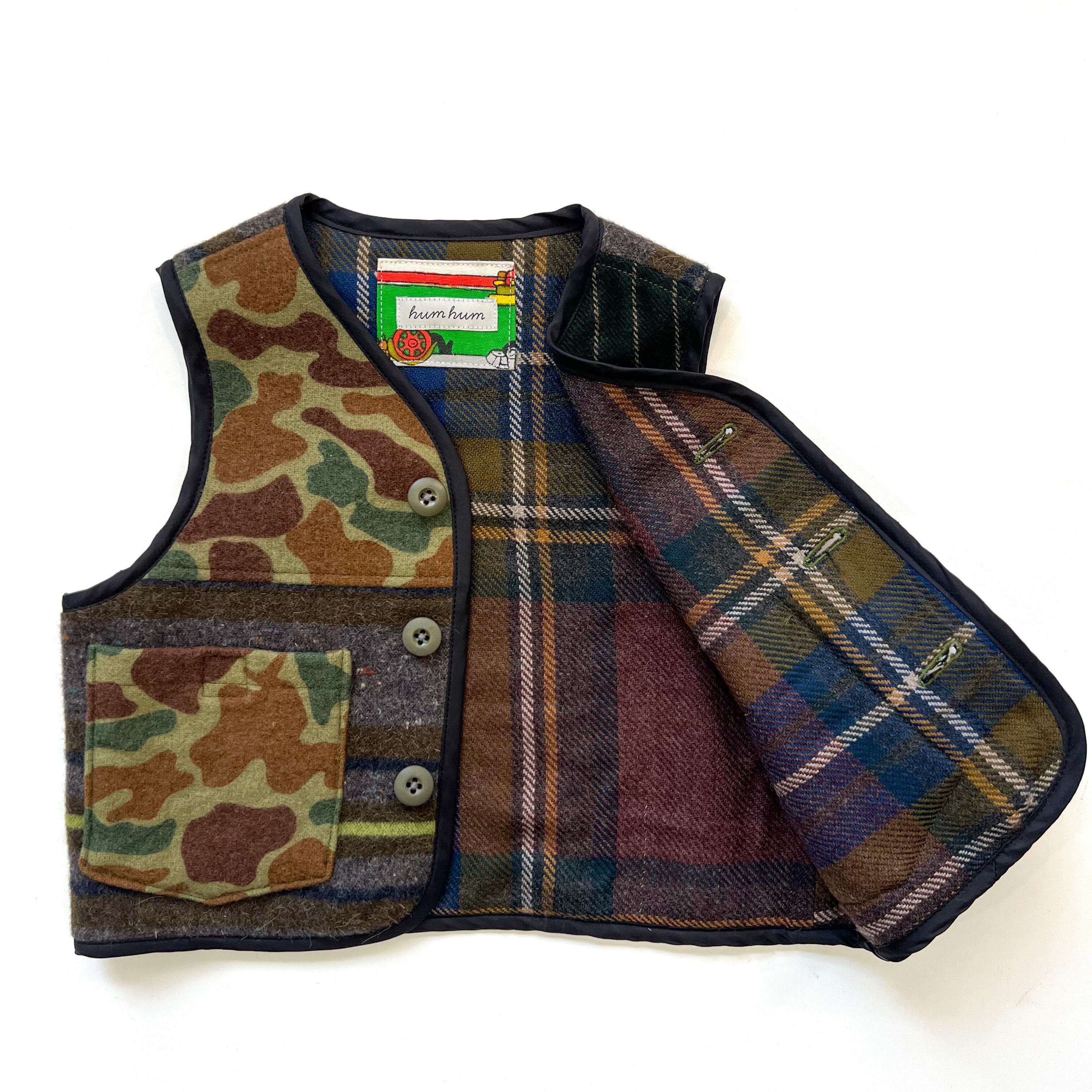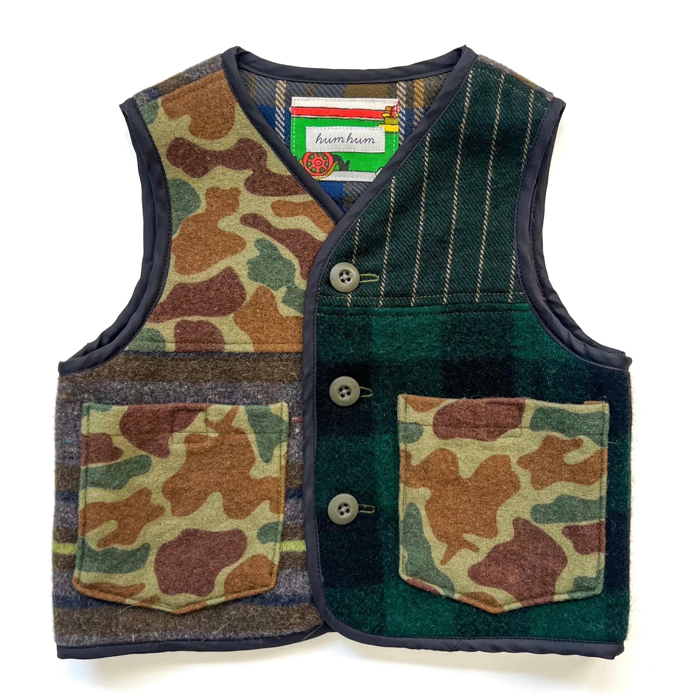 90年代WOOLRICHのカモフラ柄のウールシャツ。ボーダーのウールブランケットや、バッファローチェックの生地。同系色の個性の違った4種類のウール生地をパッチワークしたスペシャルなベストです。柄の絶妙な配置もぜひ楽しんでいただきたい1着です。