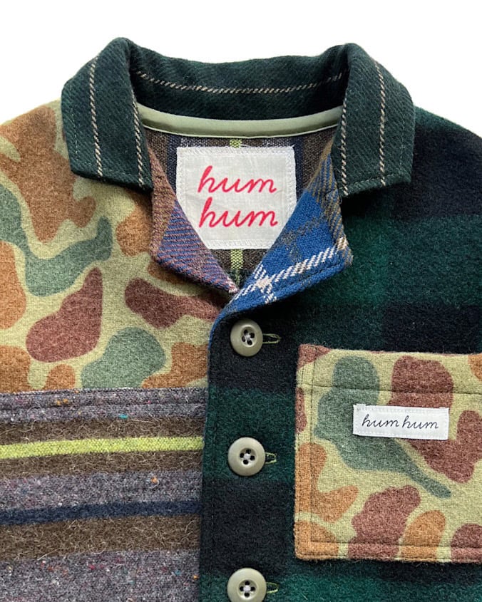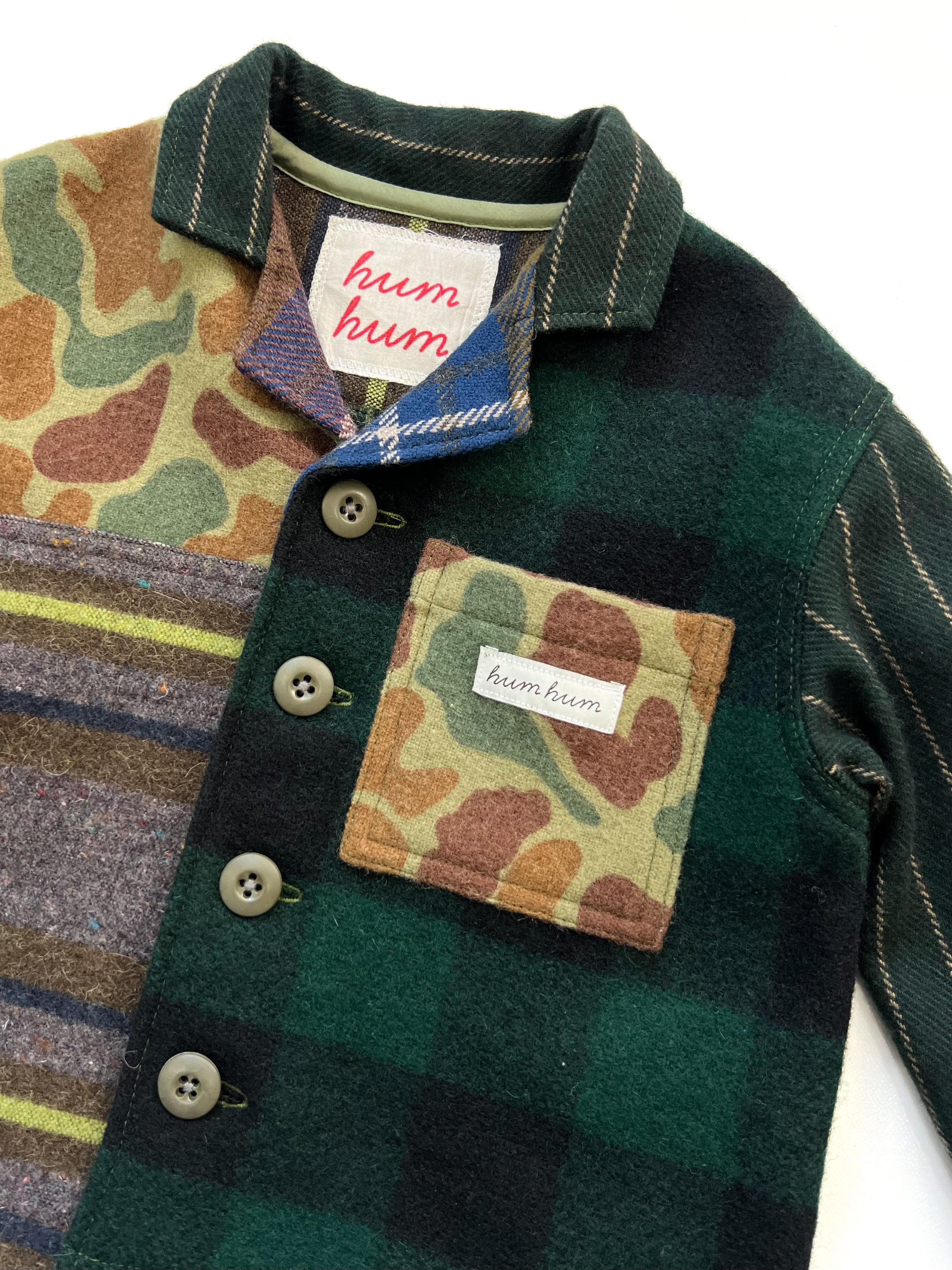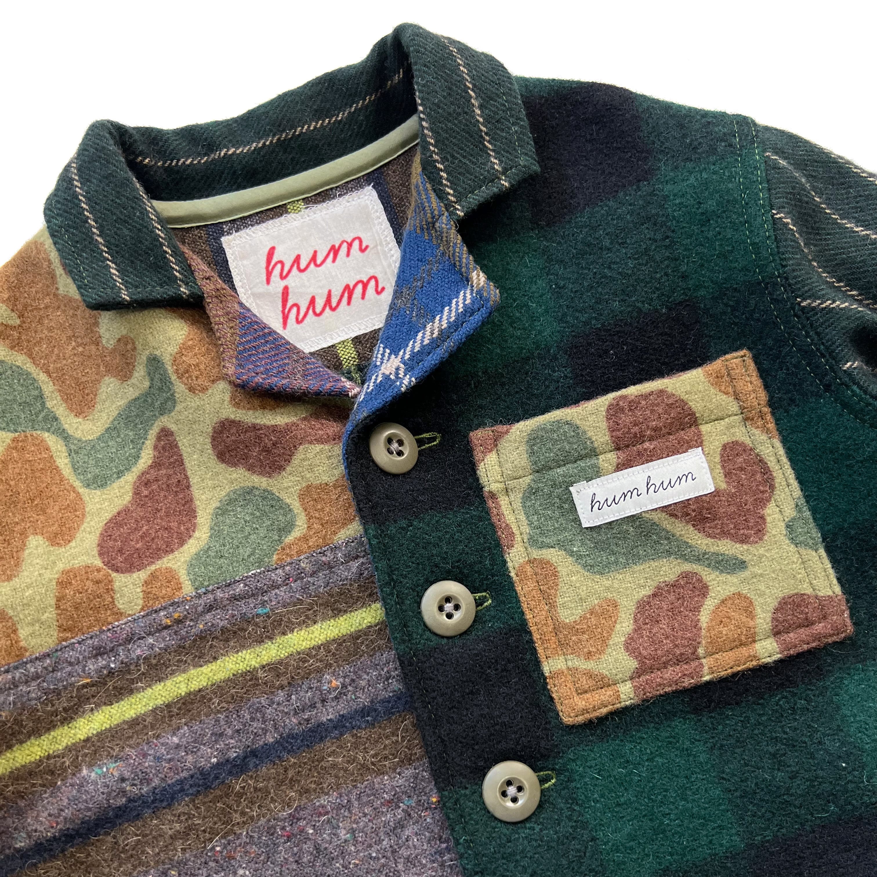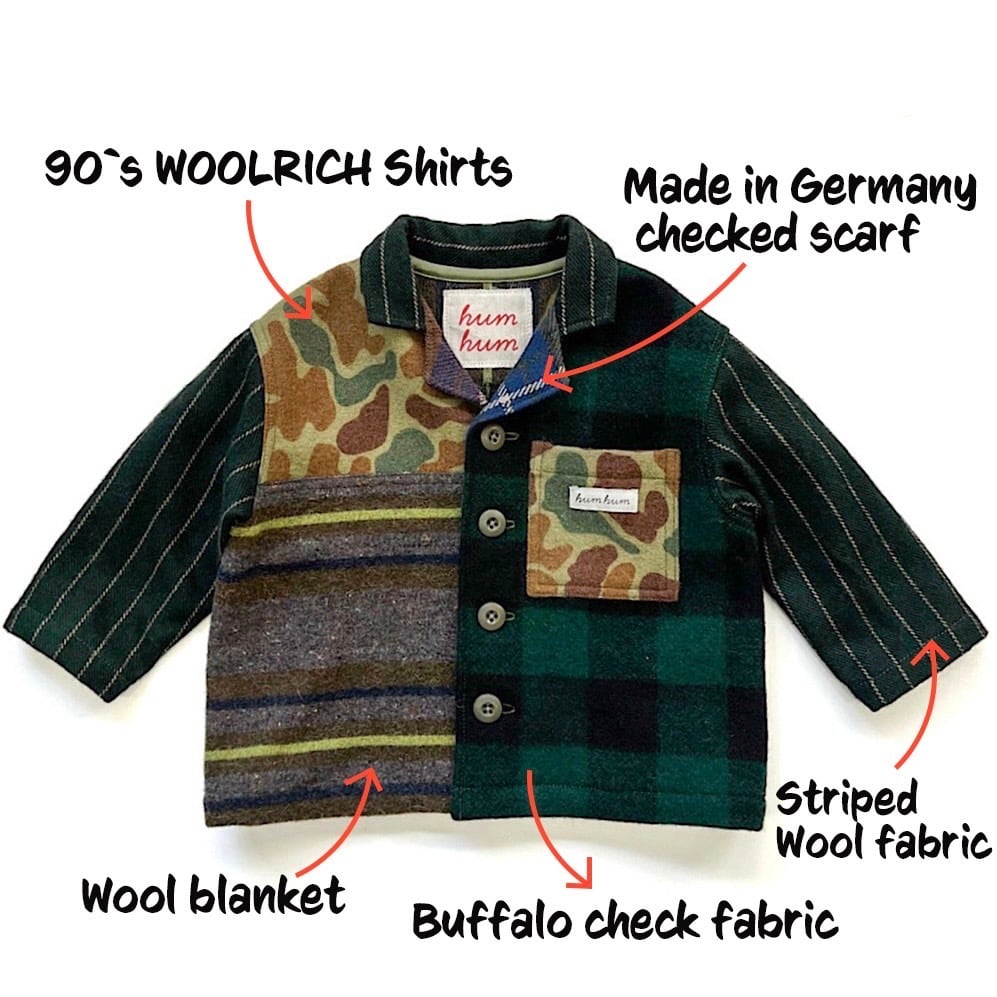 90年代WOOLRICHのカモフラ柄のウールシャツ。ボーダーのウールブランケットや、バッファローチェックの生地。同系色の個性の違った5種類のウール生地をパッチワークしたスペシャルなシャツジャケットです。柄の絶妙な配置もぜひ楽しんでいただきたい1着。