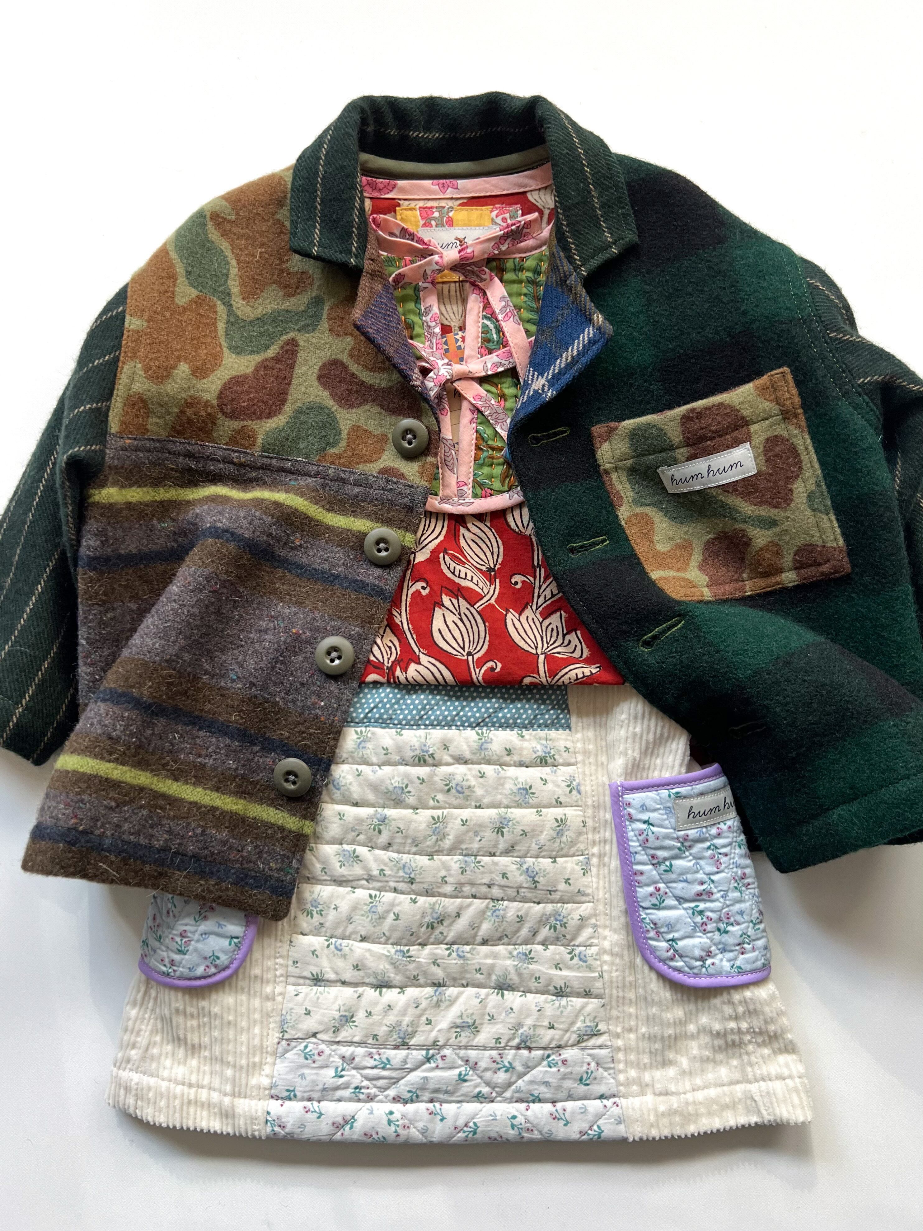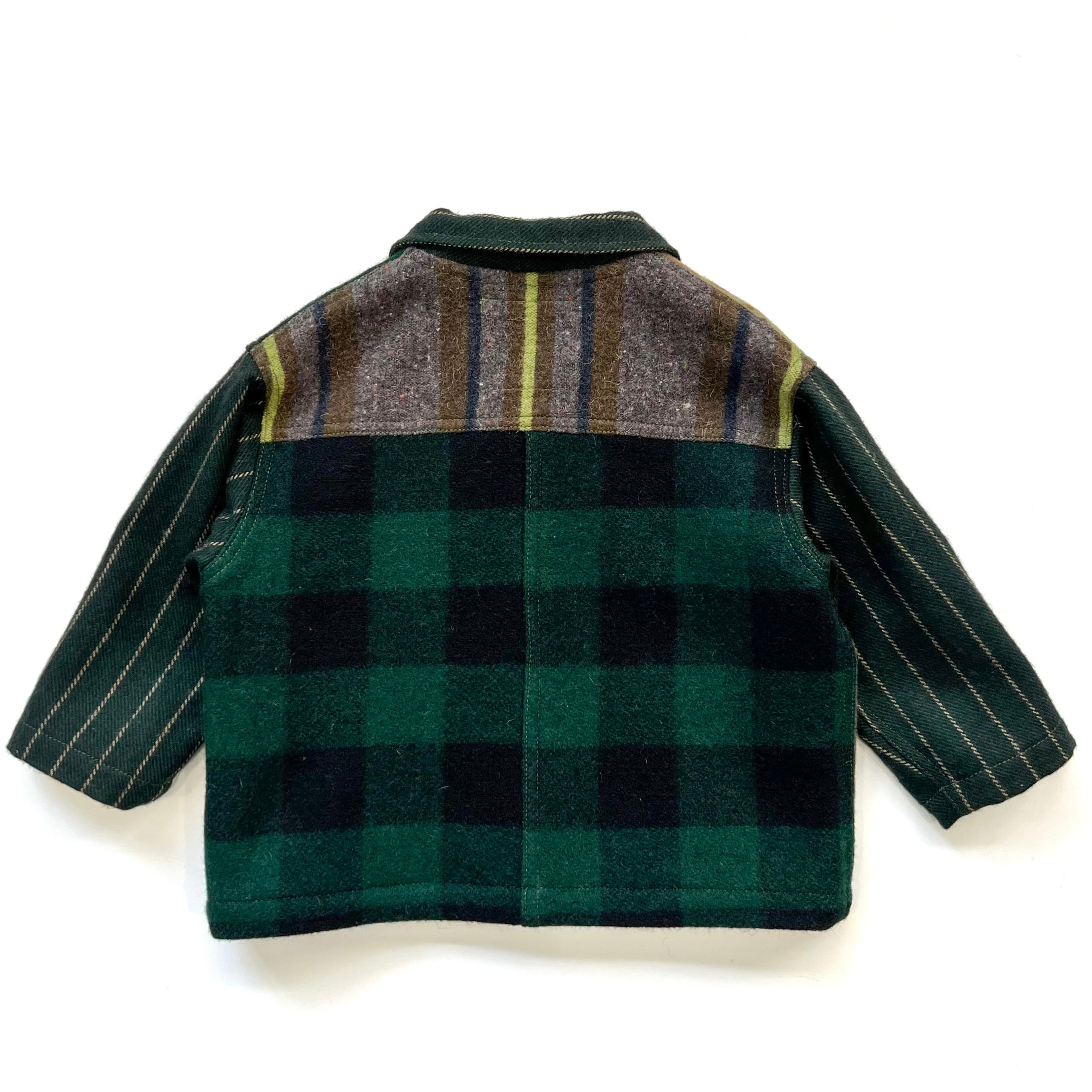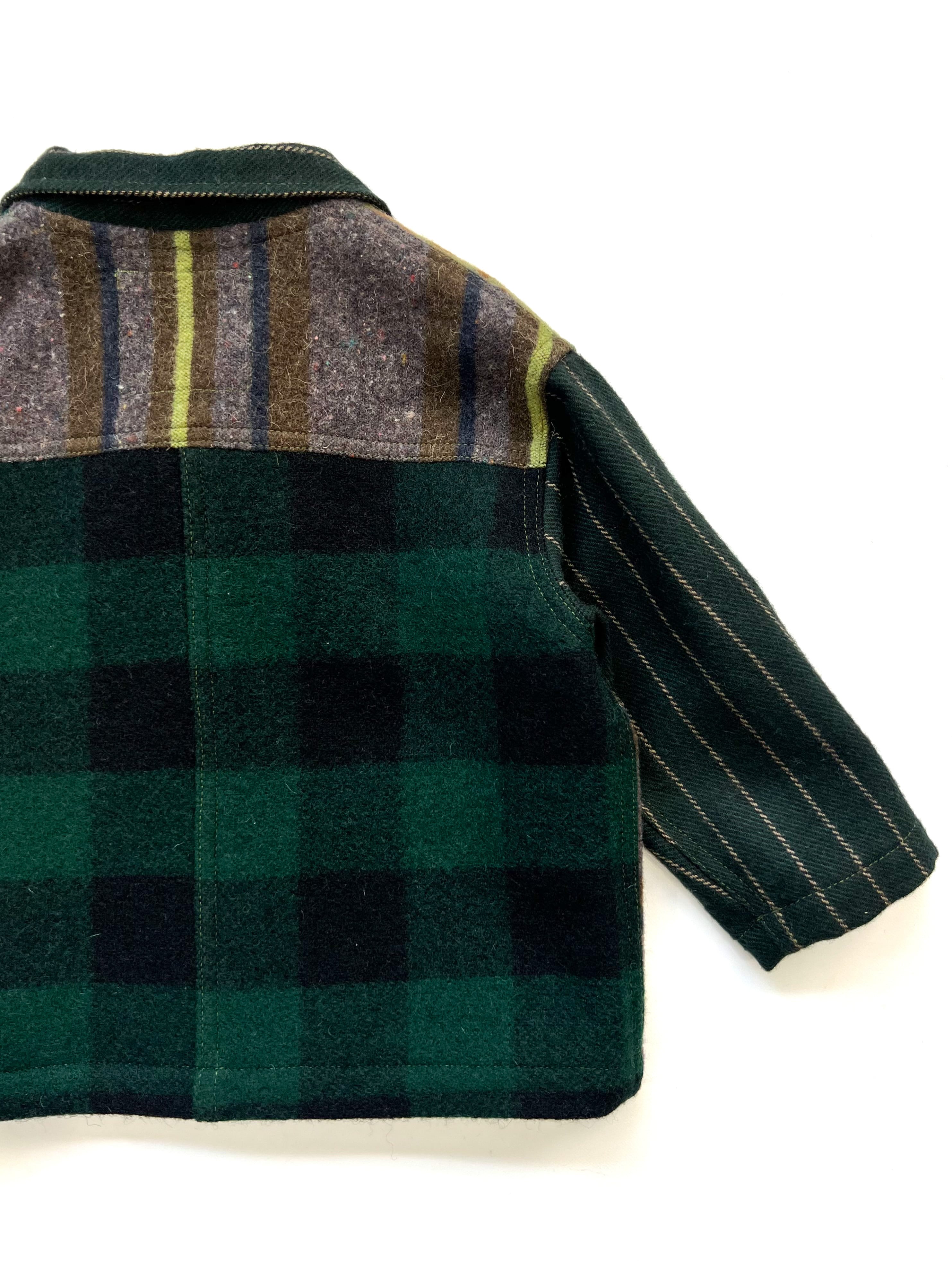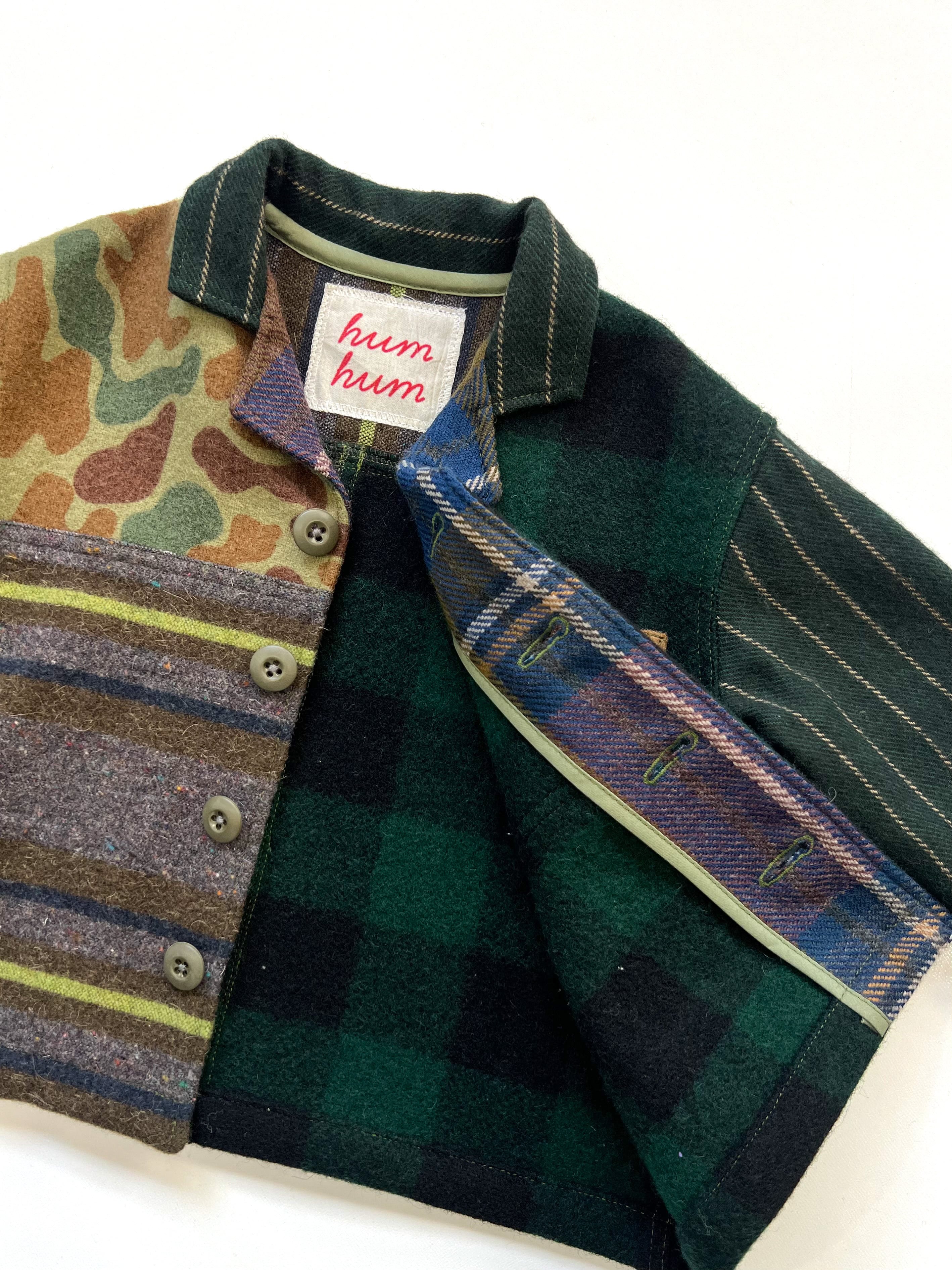 90年代WOOLRICHのカモフラ柄のウールシャツ。ボーダーのウールブランケットや、バッファローチェックの生地。同系色の個性の違った5種類のウール生地をパッチワークしたスペシャルなシャツジャケットです。柄の絶妙な配置もぜひ楽しんでいただきたい1着。