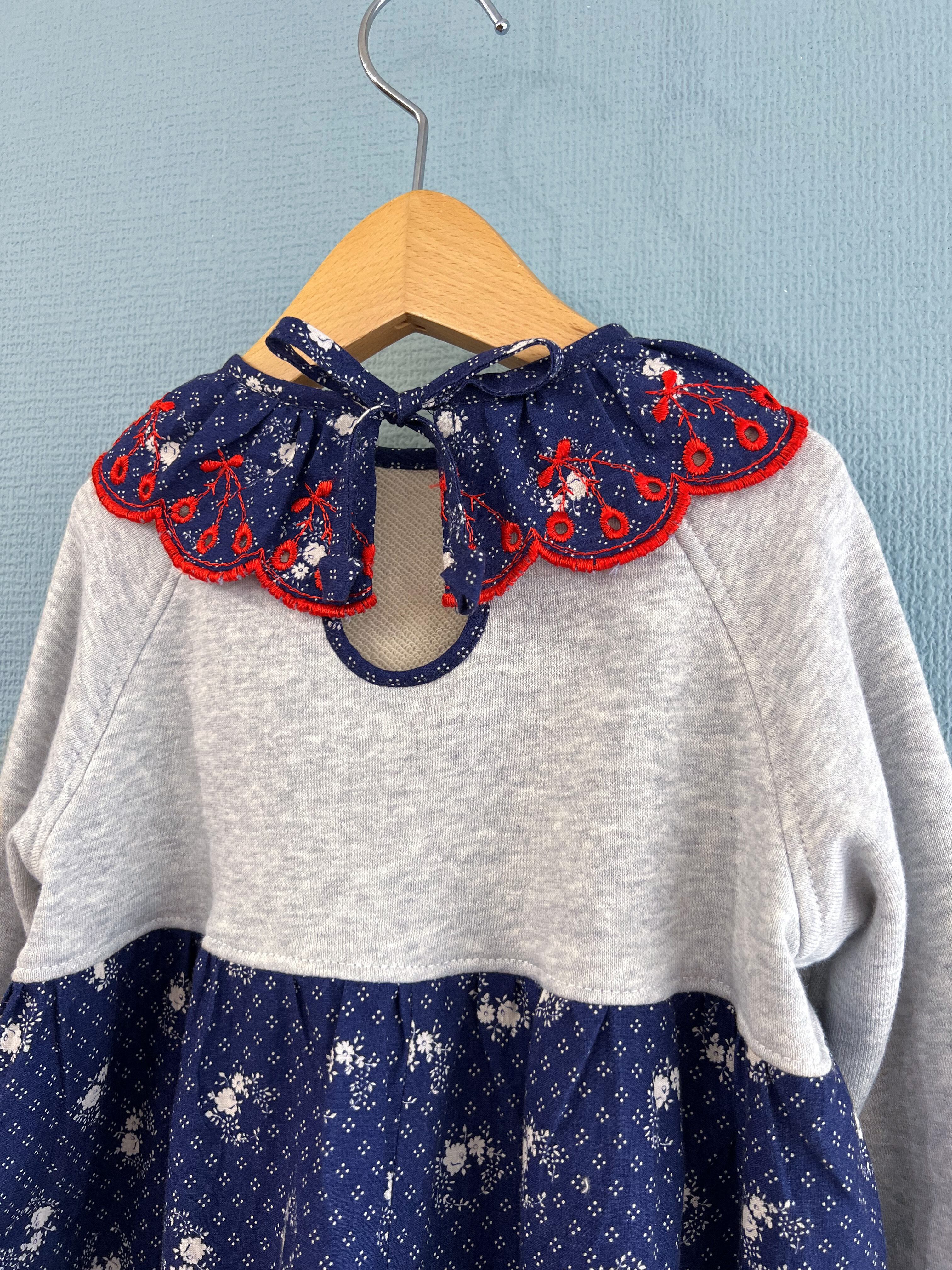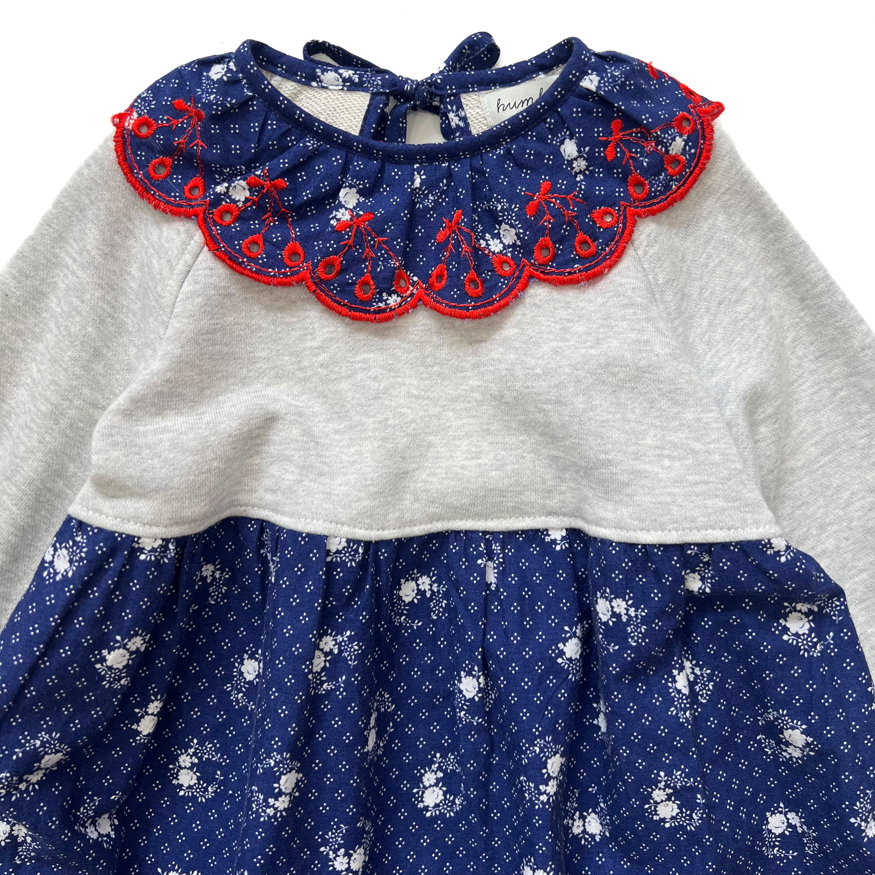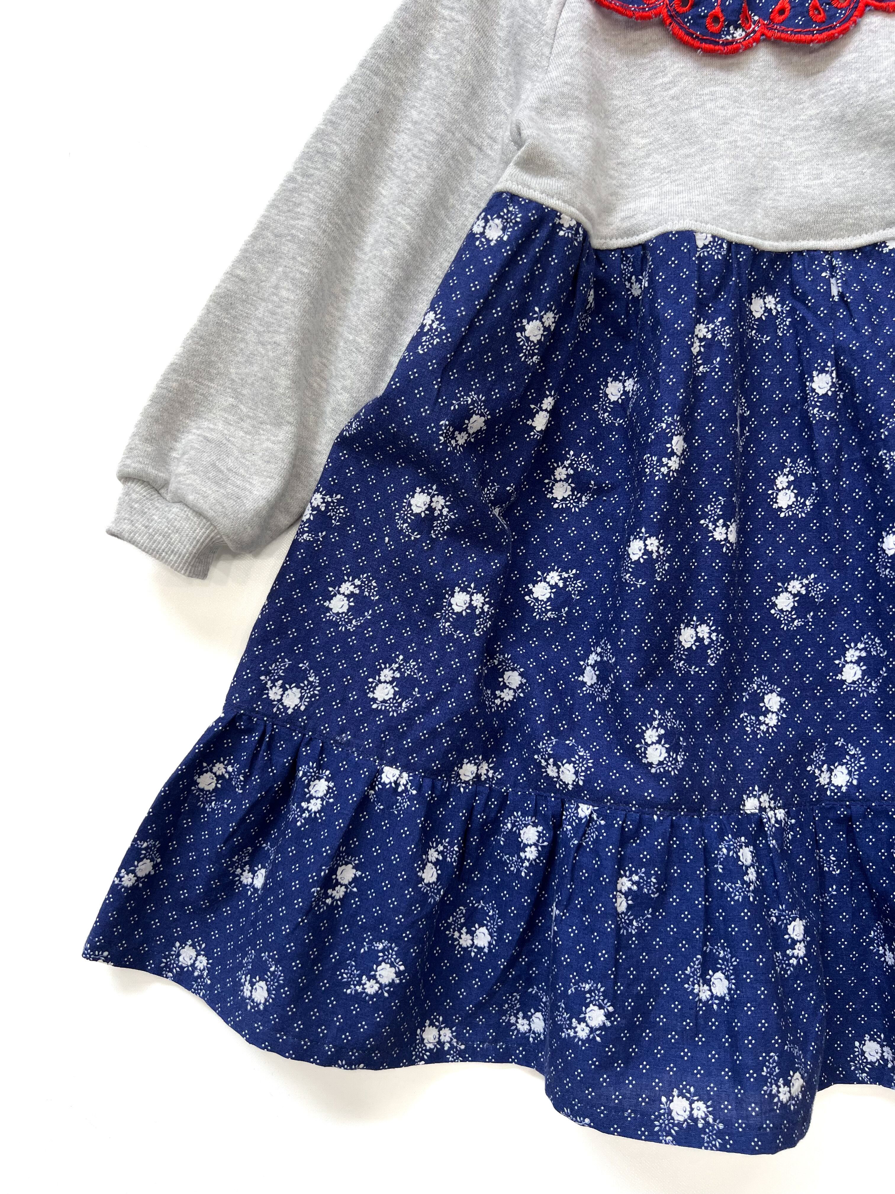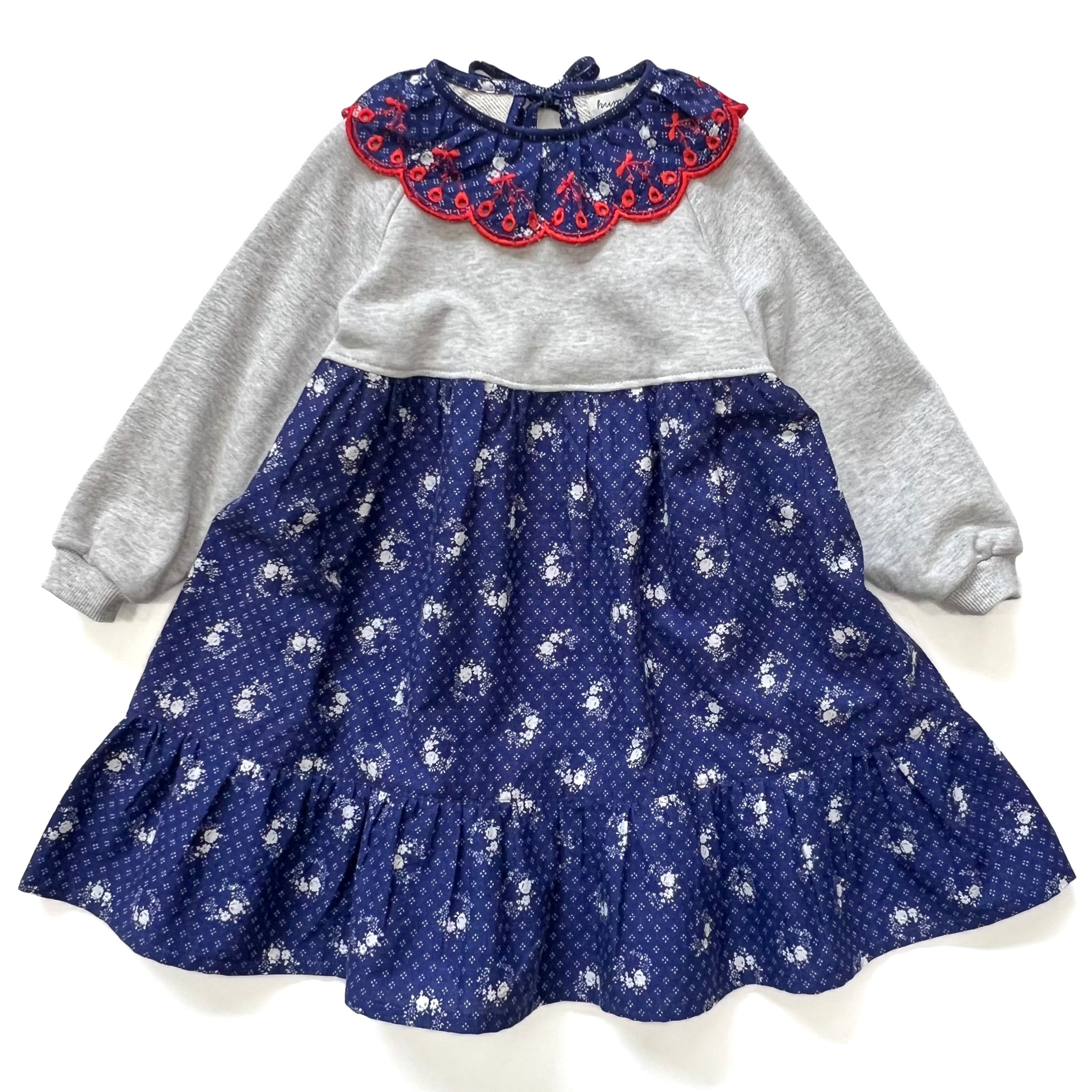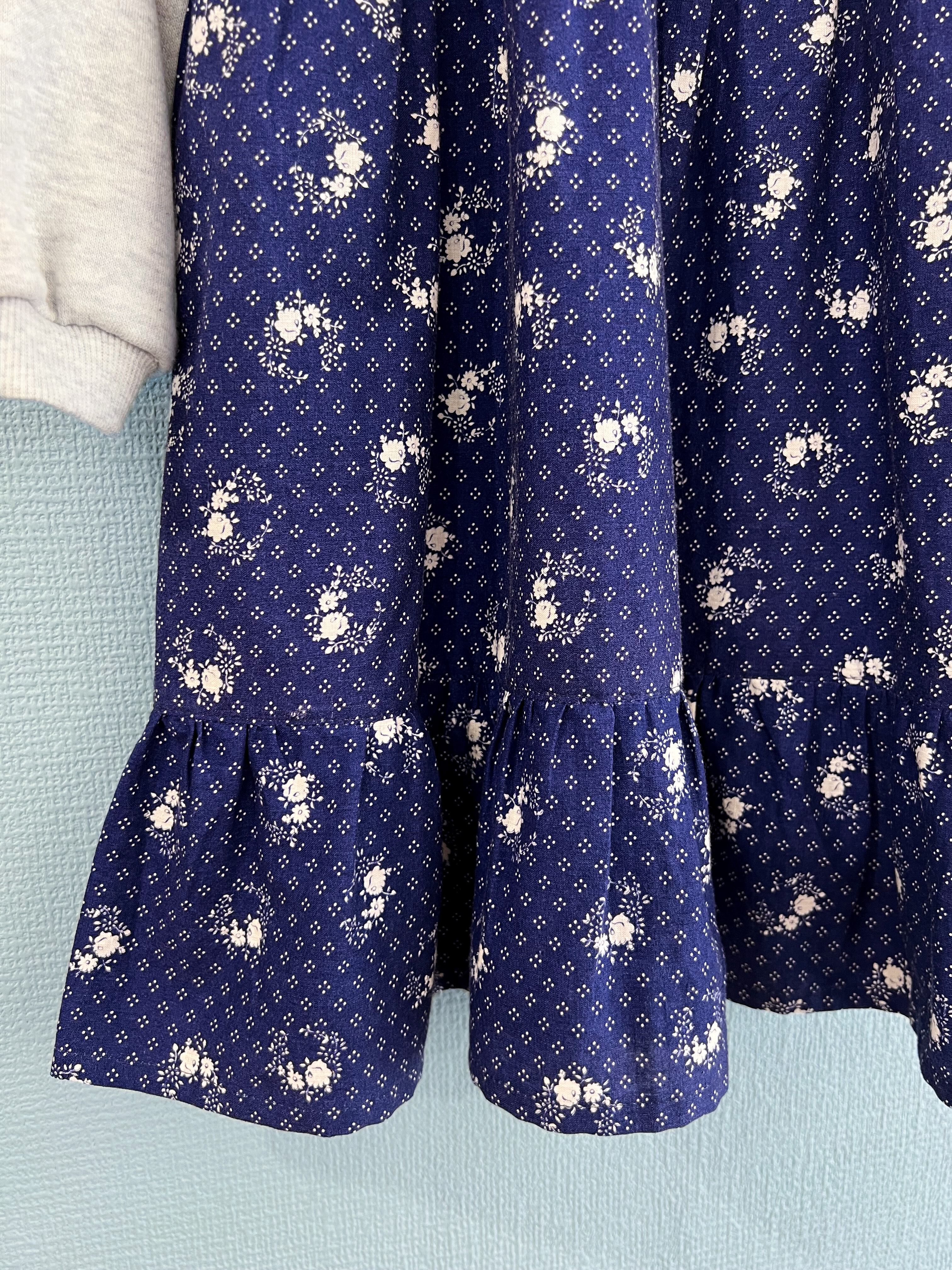 70'sのフレアスカートから生地を取った、ネイビーのフラワープリント生地と、柔らかな質感の裏毛スウェット生地をミックスして、