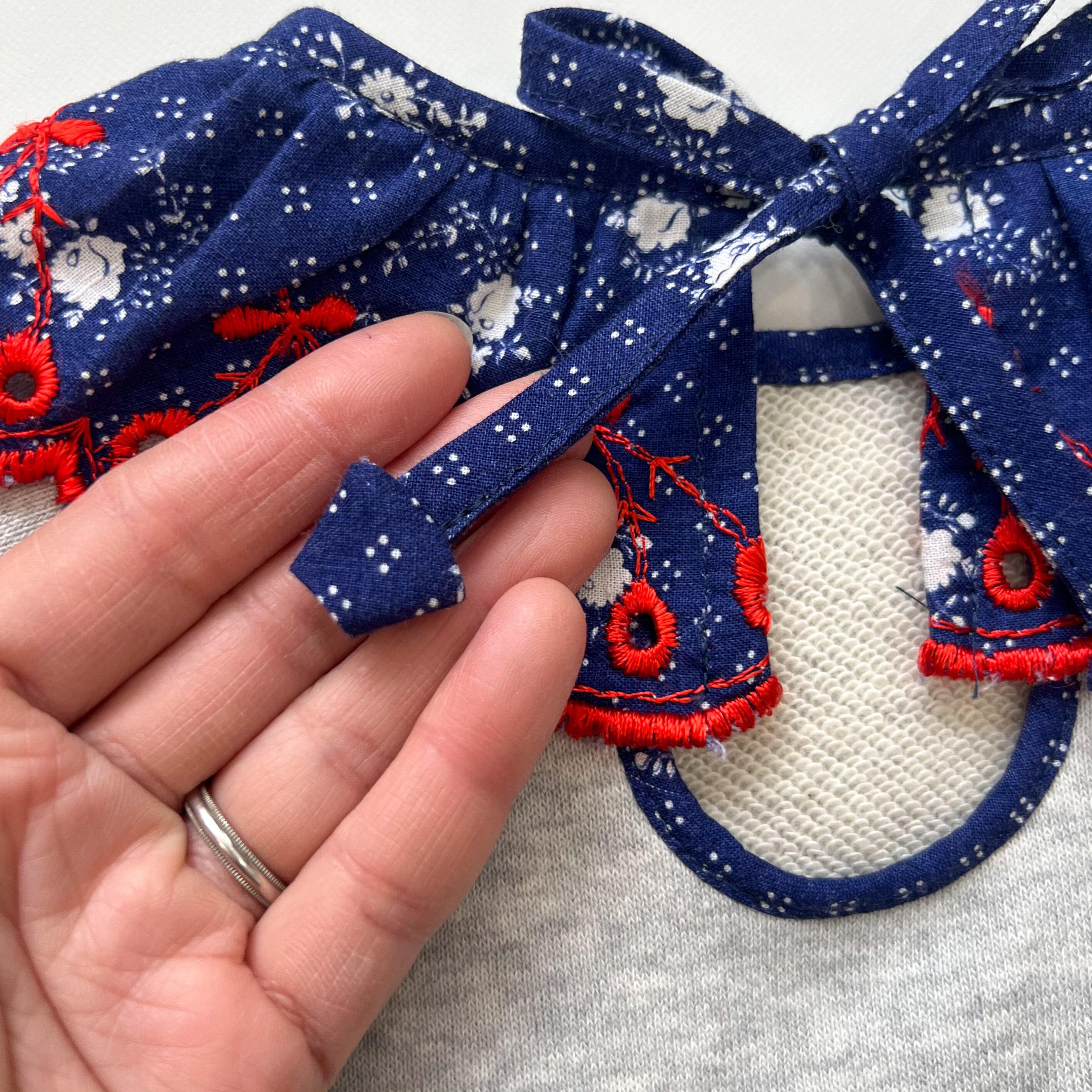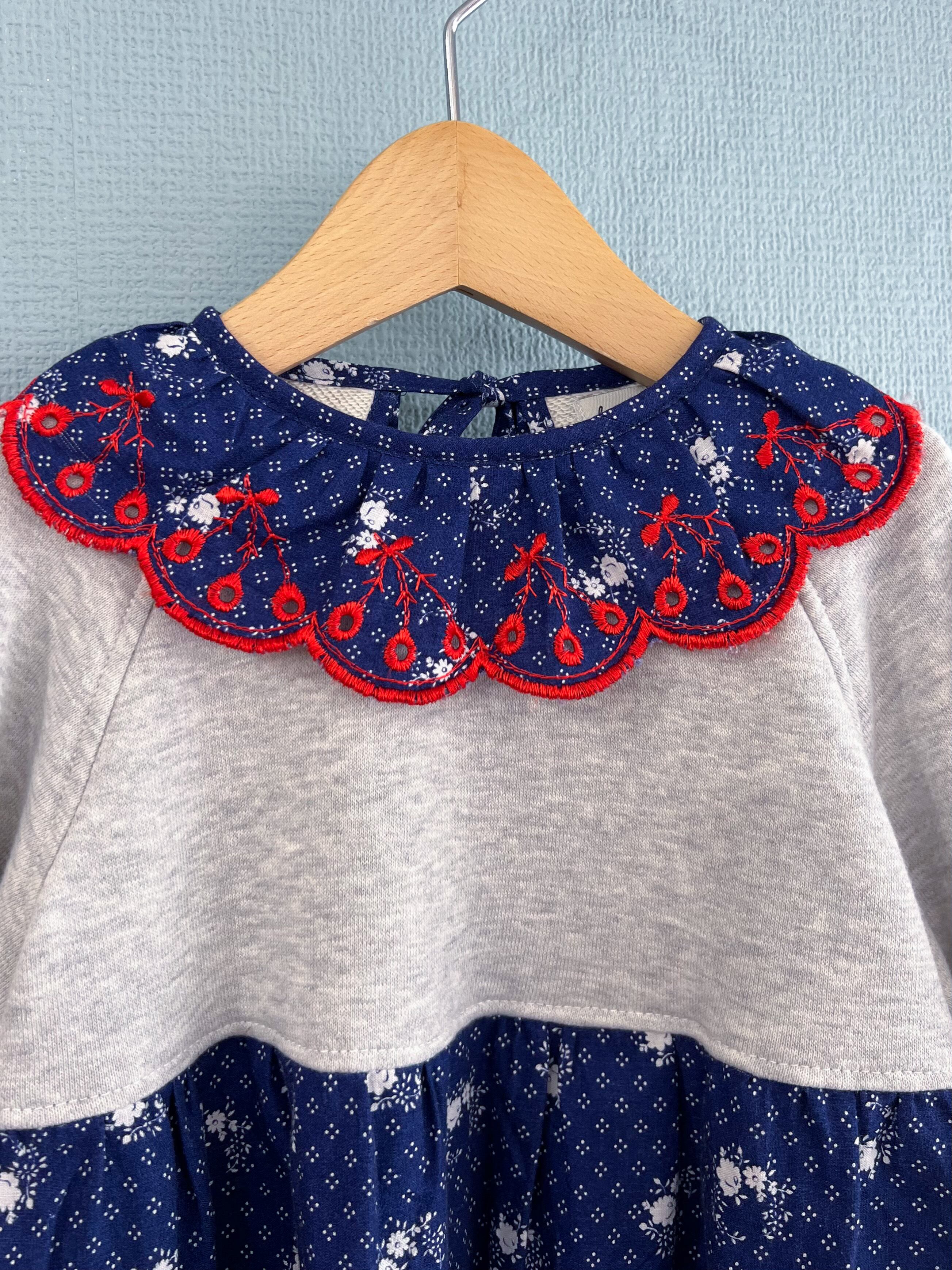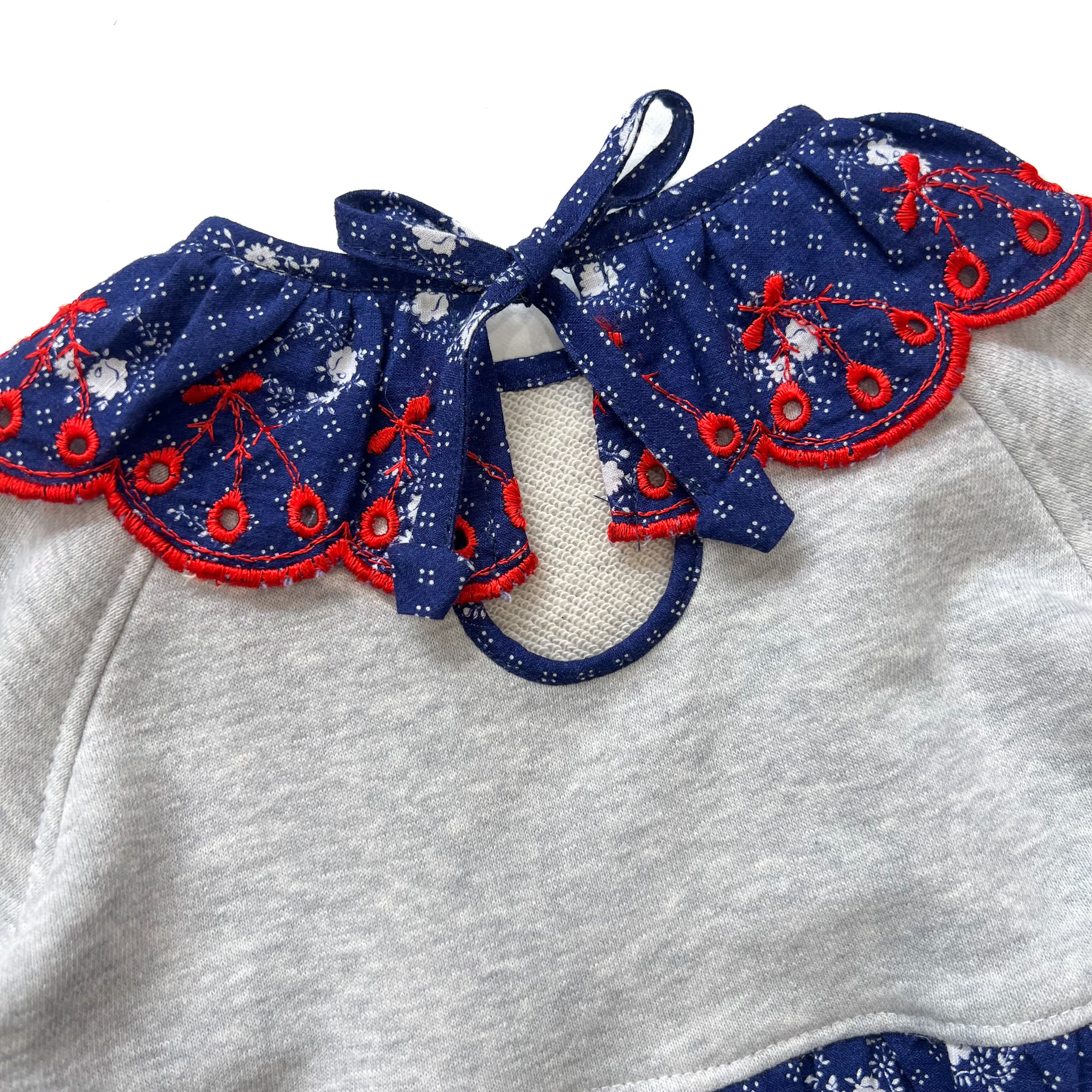 ラッフルカラーの部分は元々のスカートの裾の刺繍をそのまま襟元に活かしました。