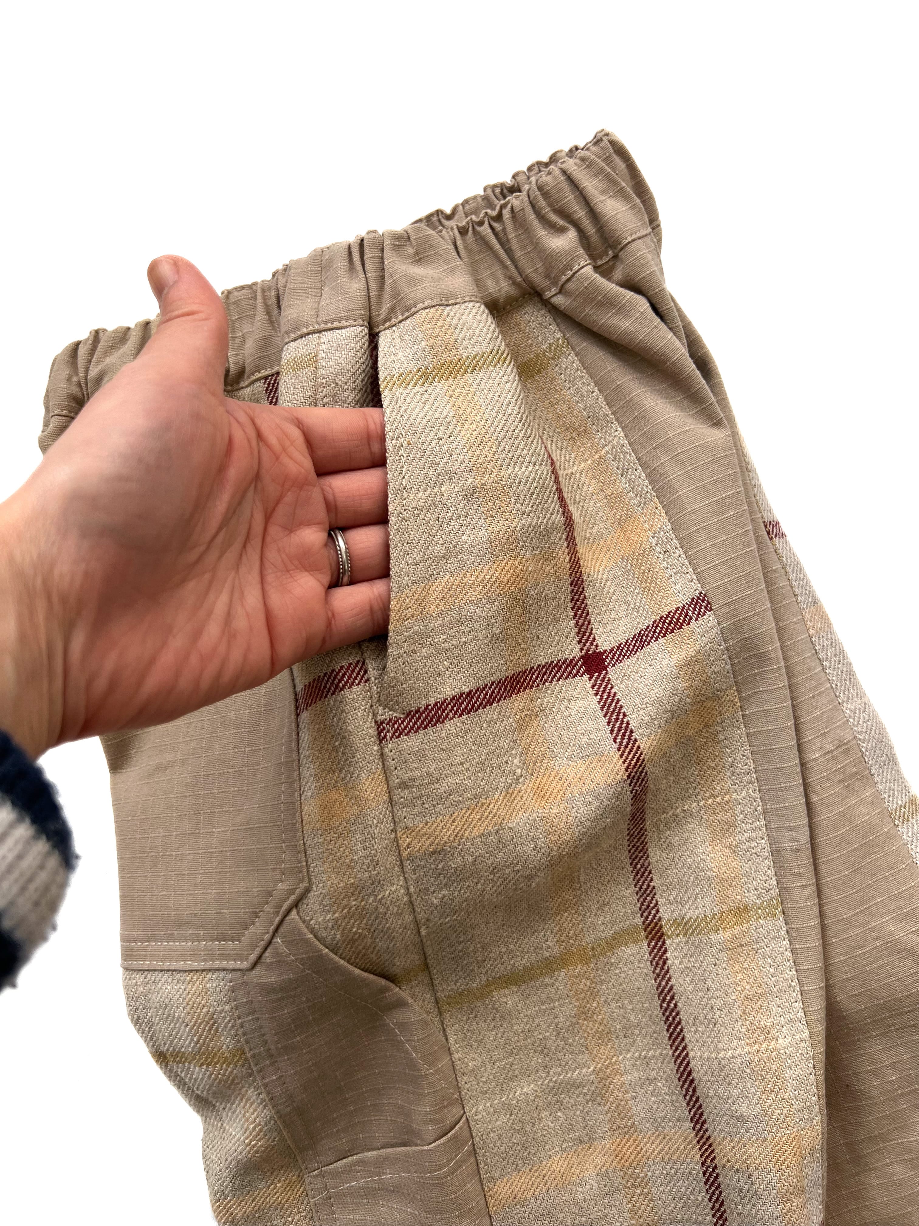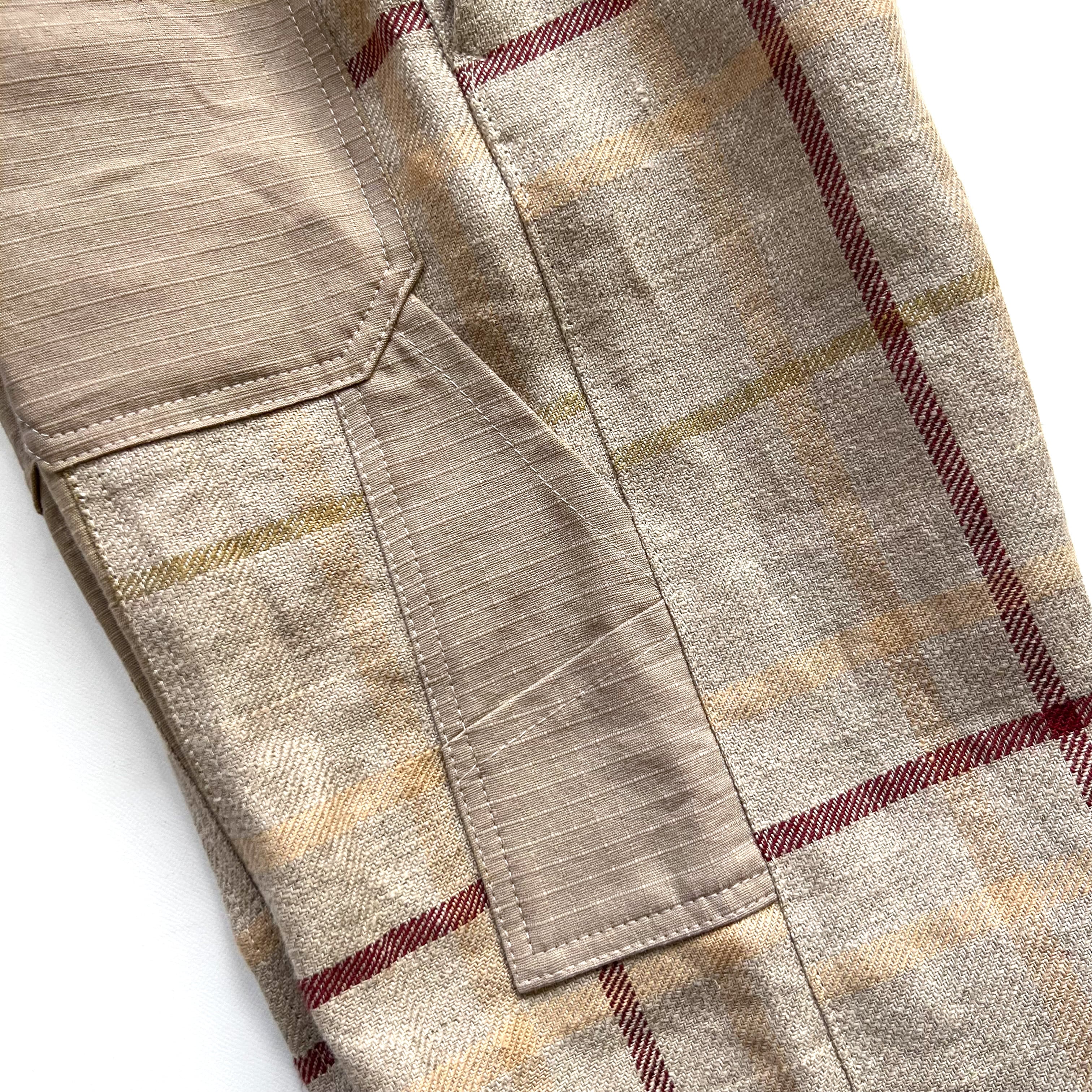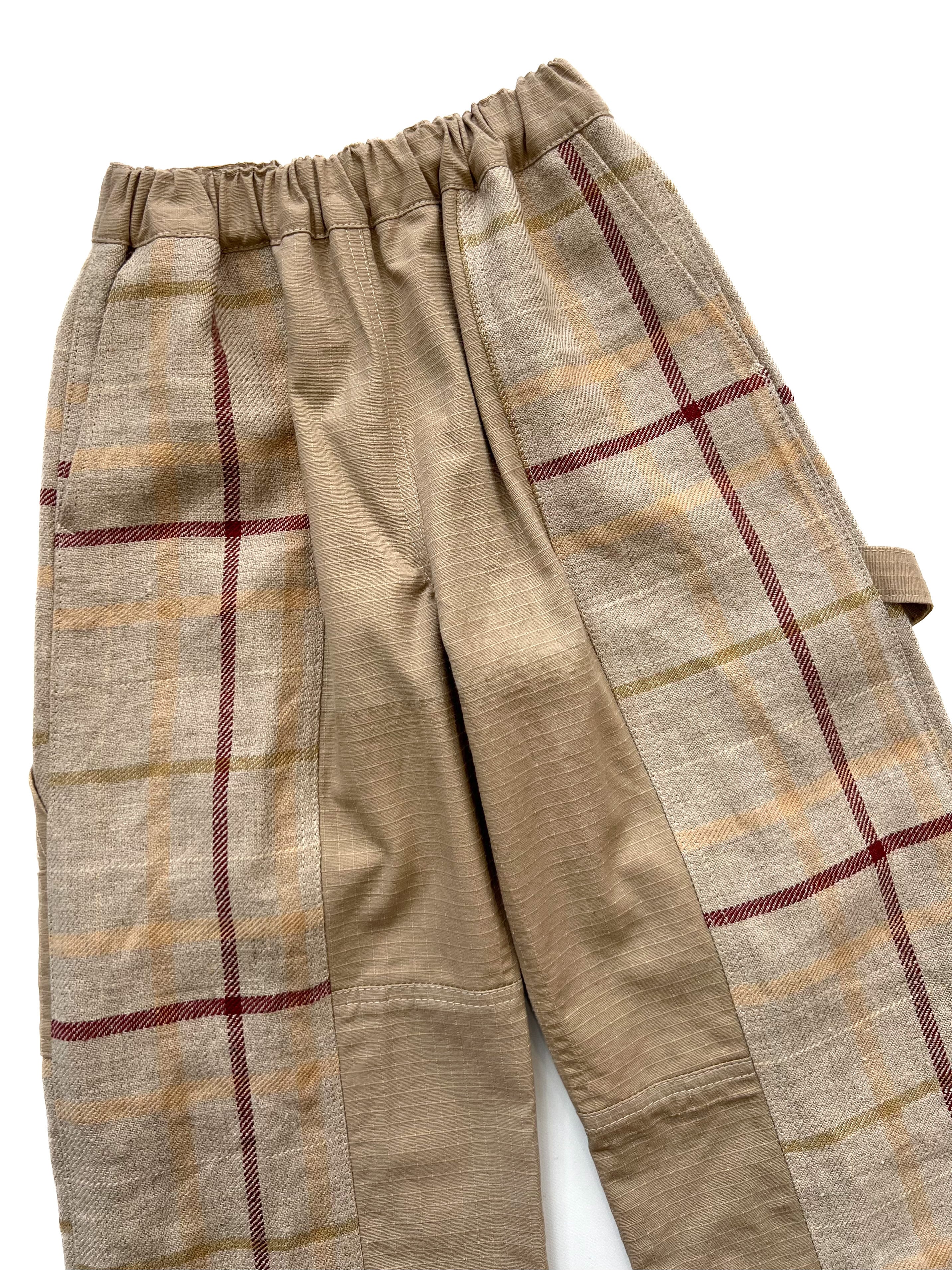 usedのミリタリーシャツジャケットを解体し、生地を取った、薄手だけど耐久性のあるリップストップ生地と、肉厚なリネンのチェック生地を合わせ、ペインターパンツにリメイクしました。同系色の質感の違った異素材の組み合わせのメリハリが魅力の1着です。