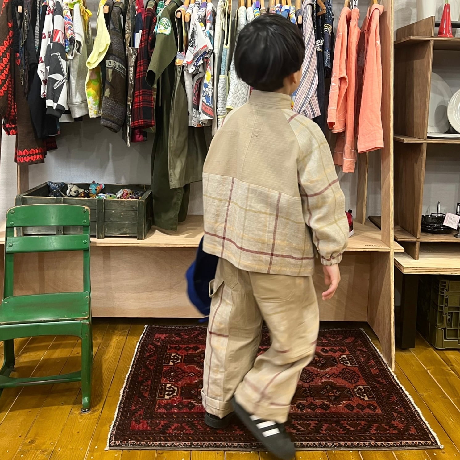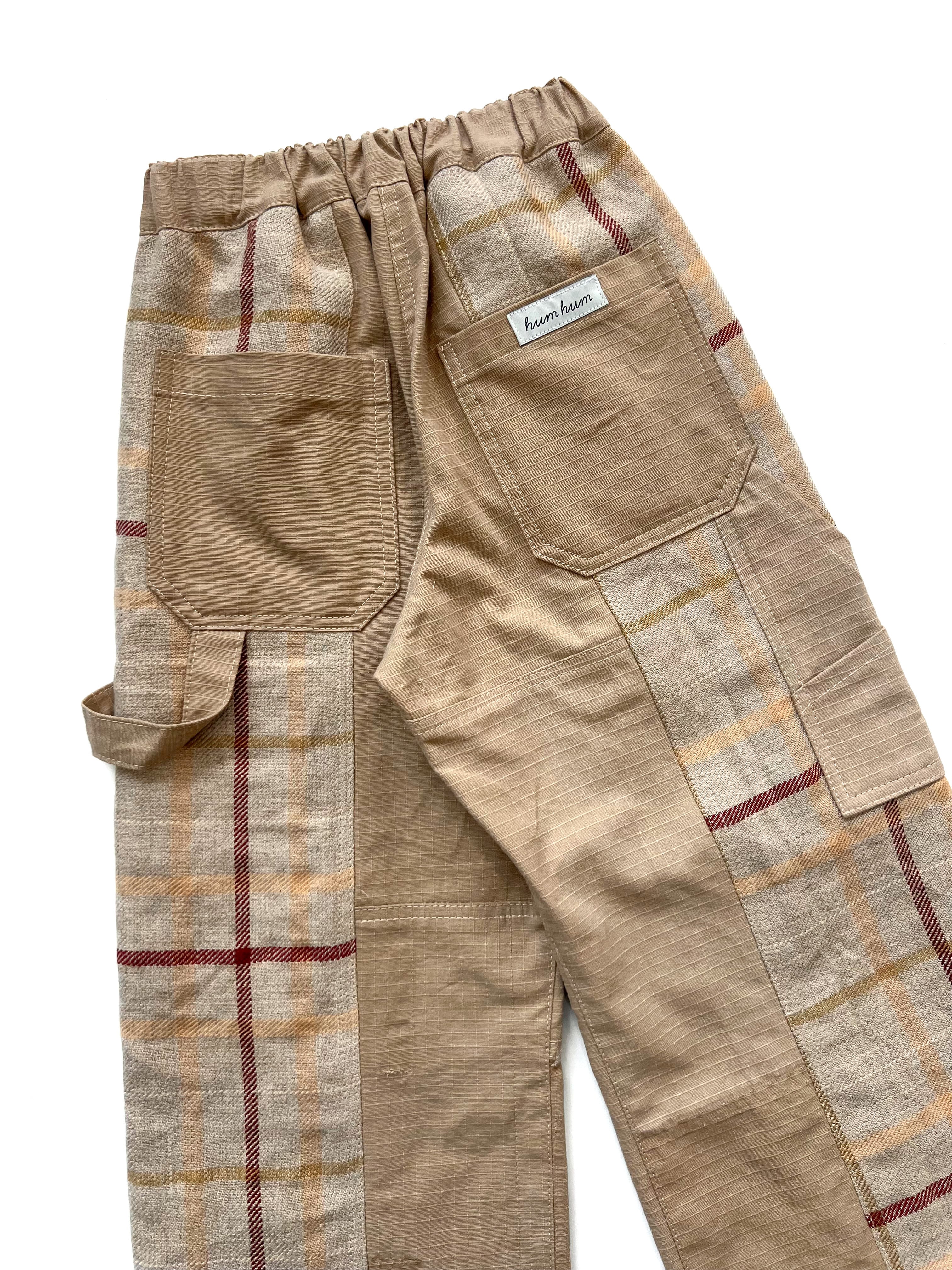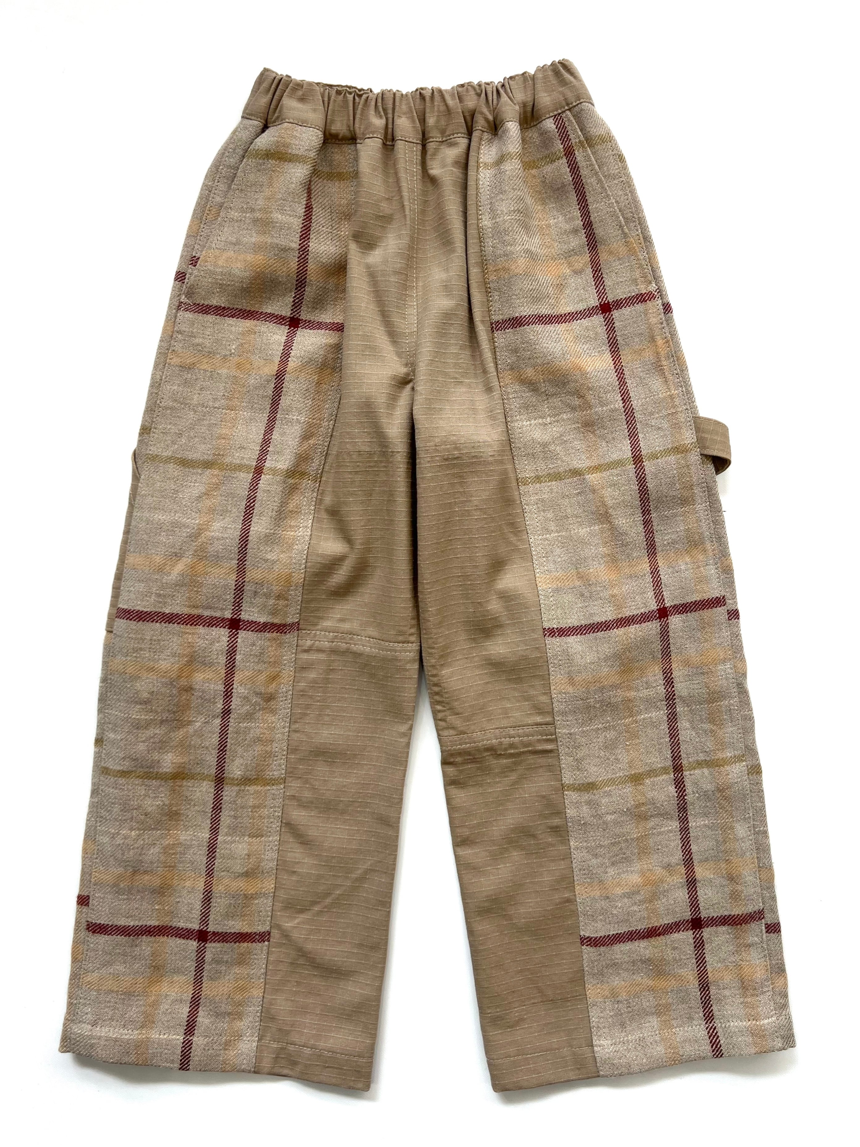 usedのミリタリーシャツジャケットを解体し、生地を取った、薄手だけど耐久性のあるリップストップ生地と、肉厚なリネンのチェック生地を合わせ、ペインターパンツにリメイクしました。同系色の質感の違った異素材の組み合わせのメリハリが魅力の1着です。