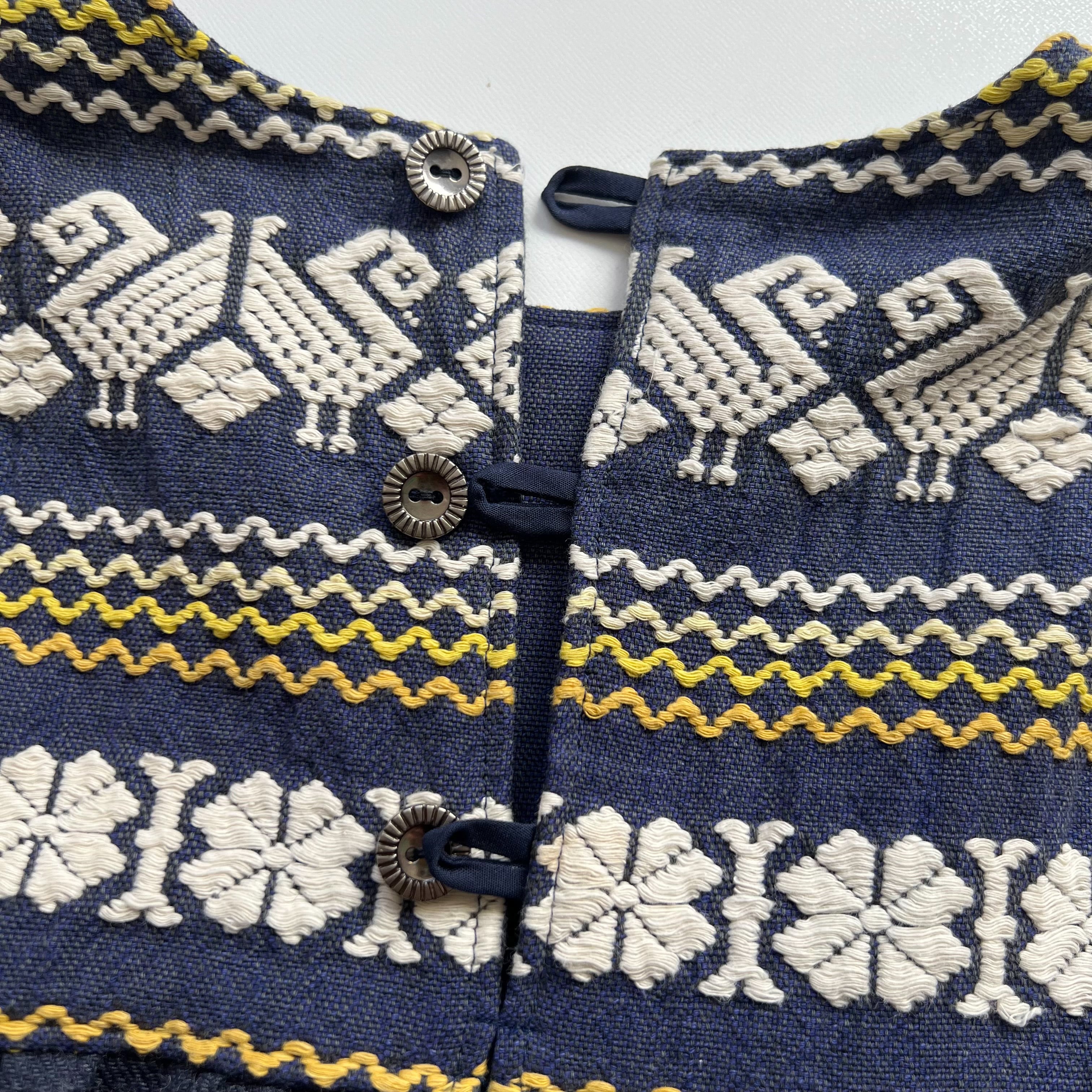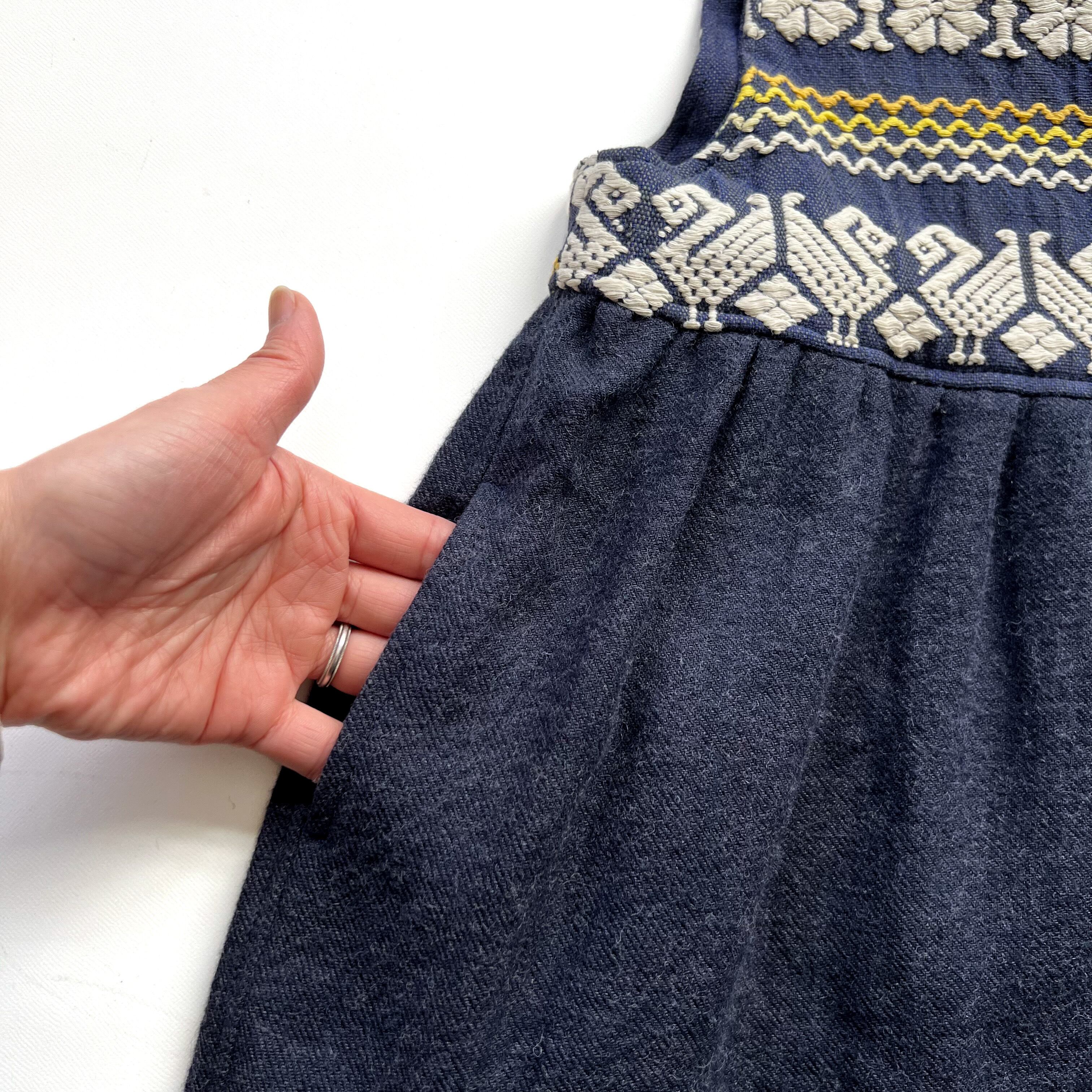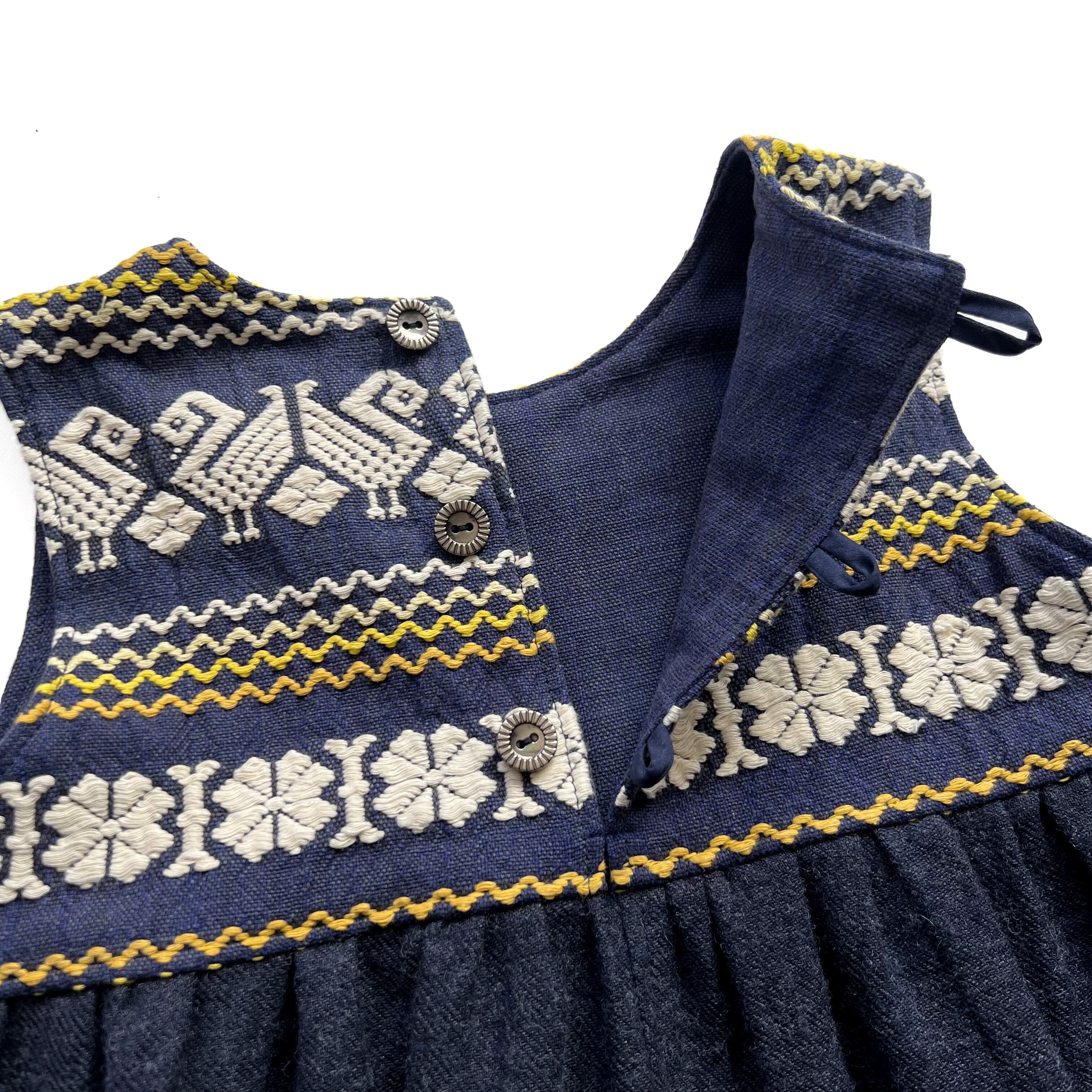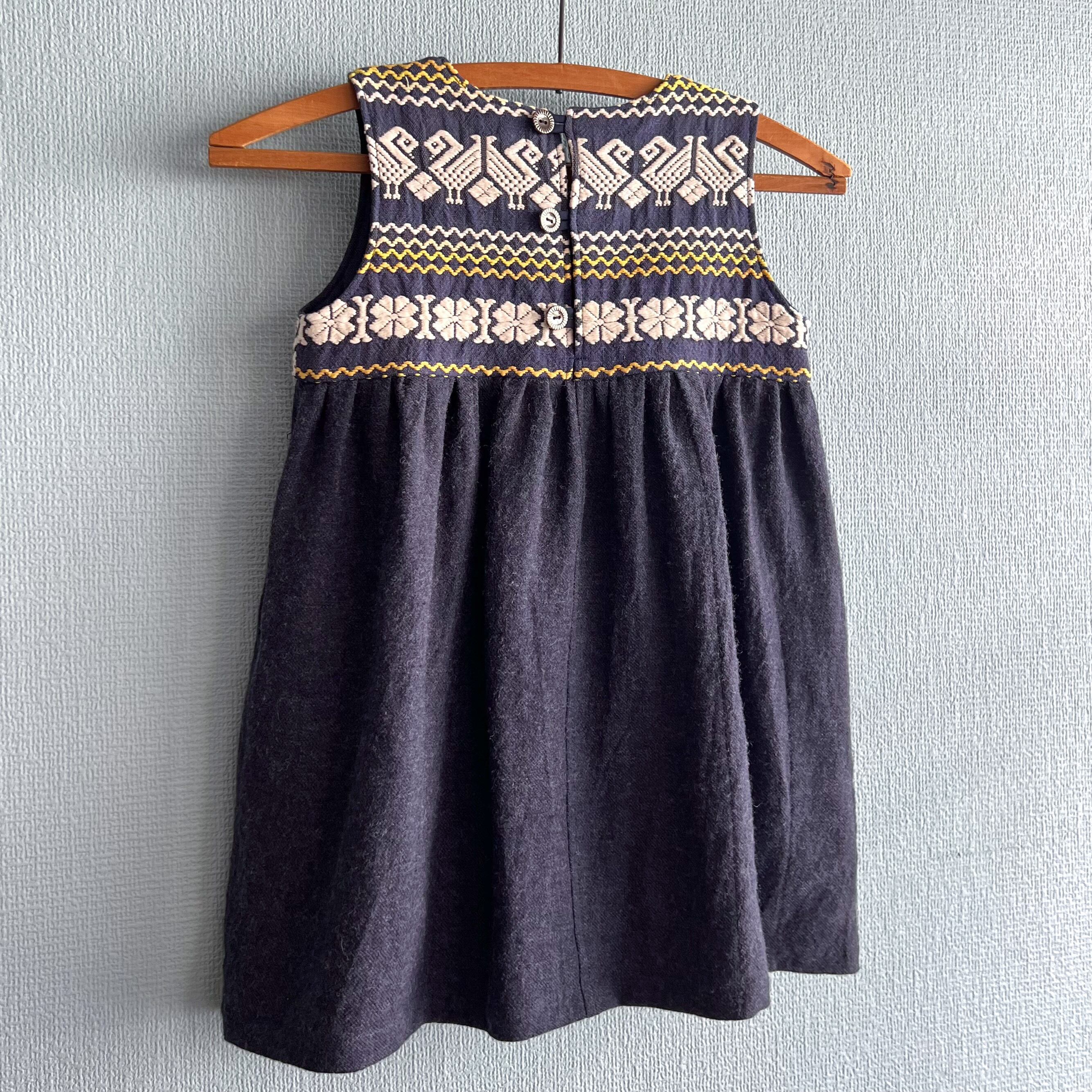 グアテマラの伝統的な美しい手刺繍が施されたヴィンテージスカートを解体し、キッズサイズのノースリーブワンピースにリメイクしました。胸から切り替えて、深みのある少しウールの入った生地を合わせまし。たっぷりとタックを入れて、ボリューム感のある動きのでるシルエット仕上げました。