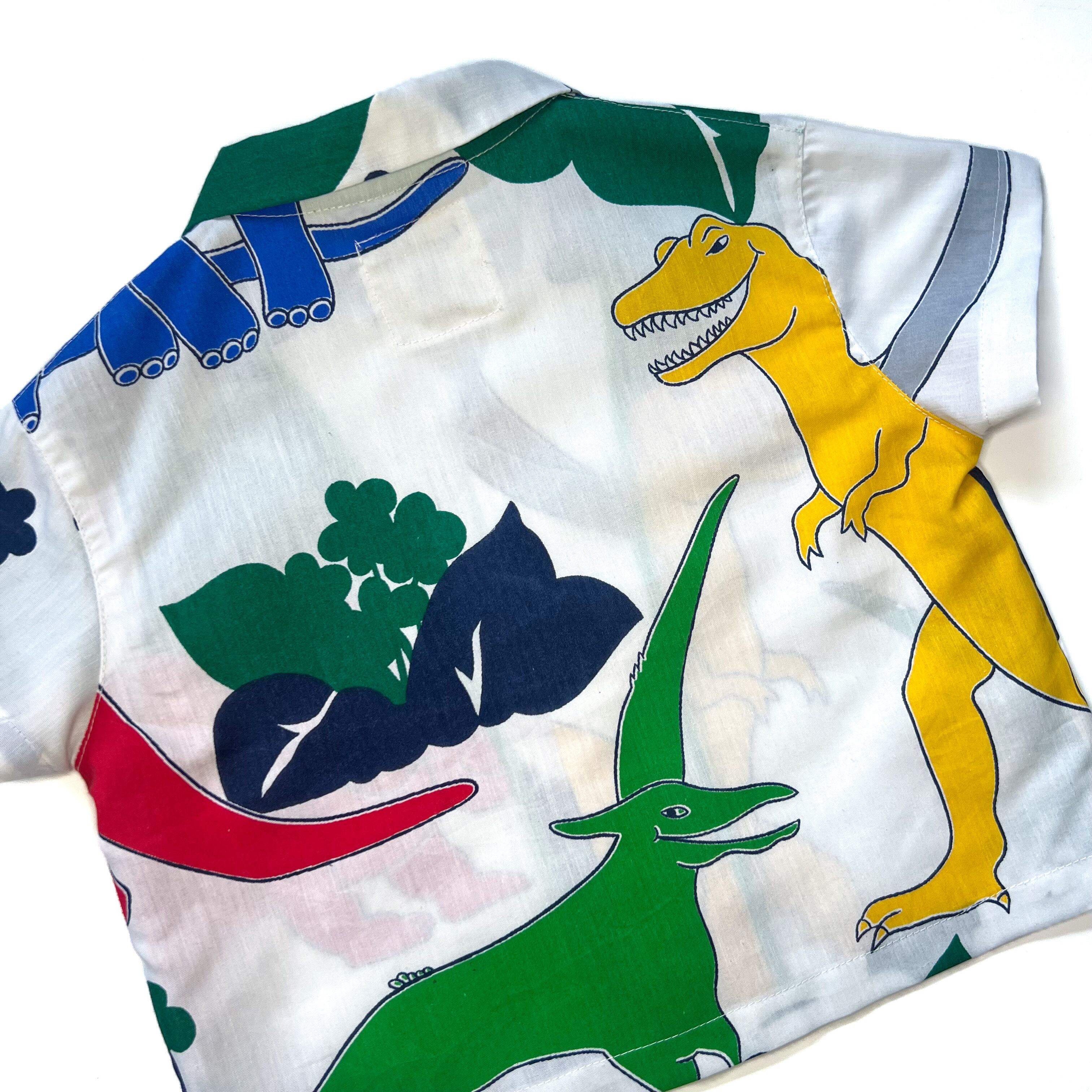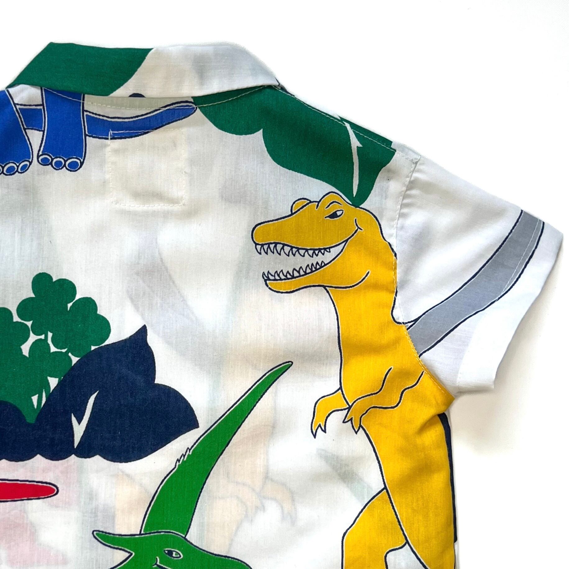 カラフルな恐竜柄のvintageシーツを半袖の開襟シャツにリメイクしました。