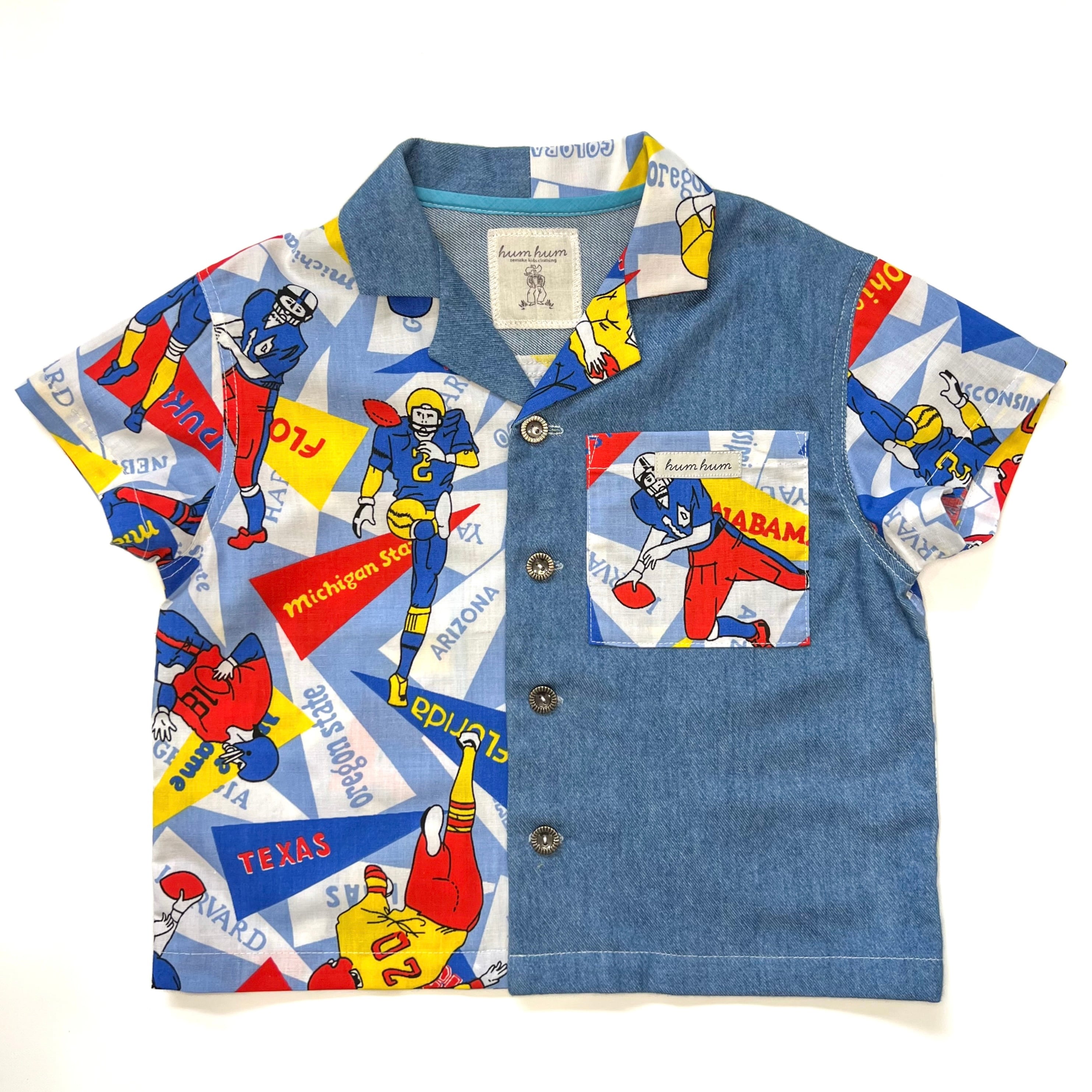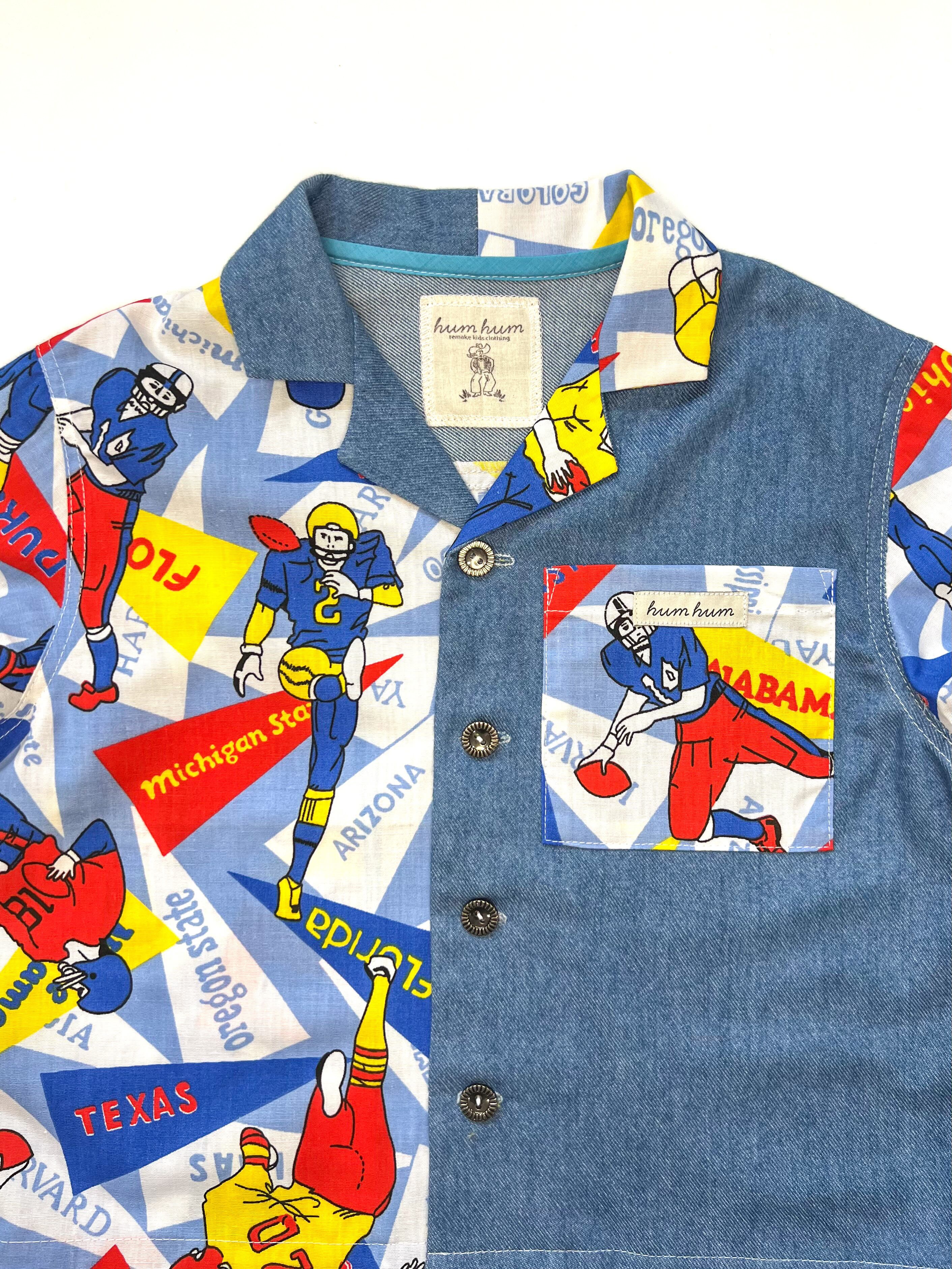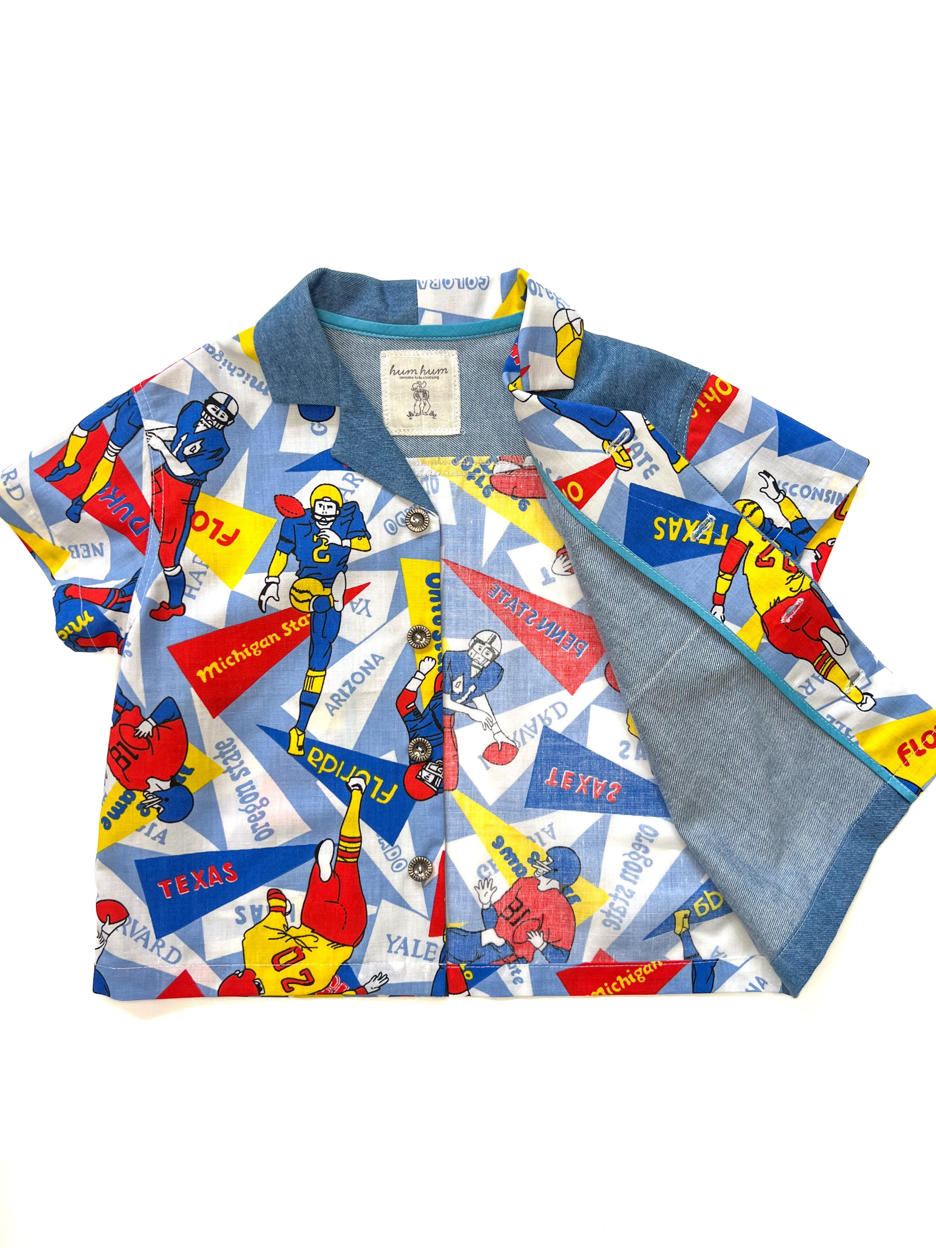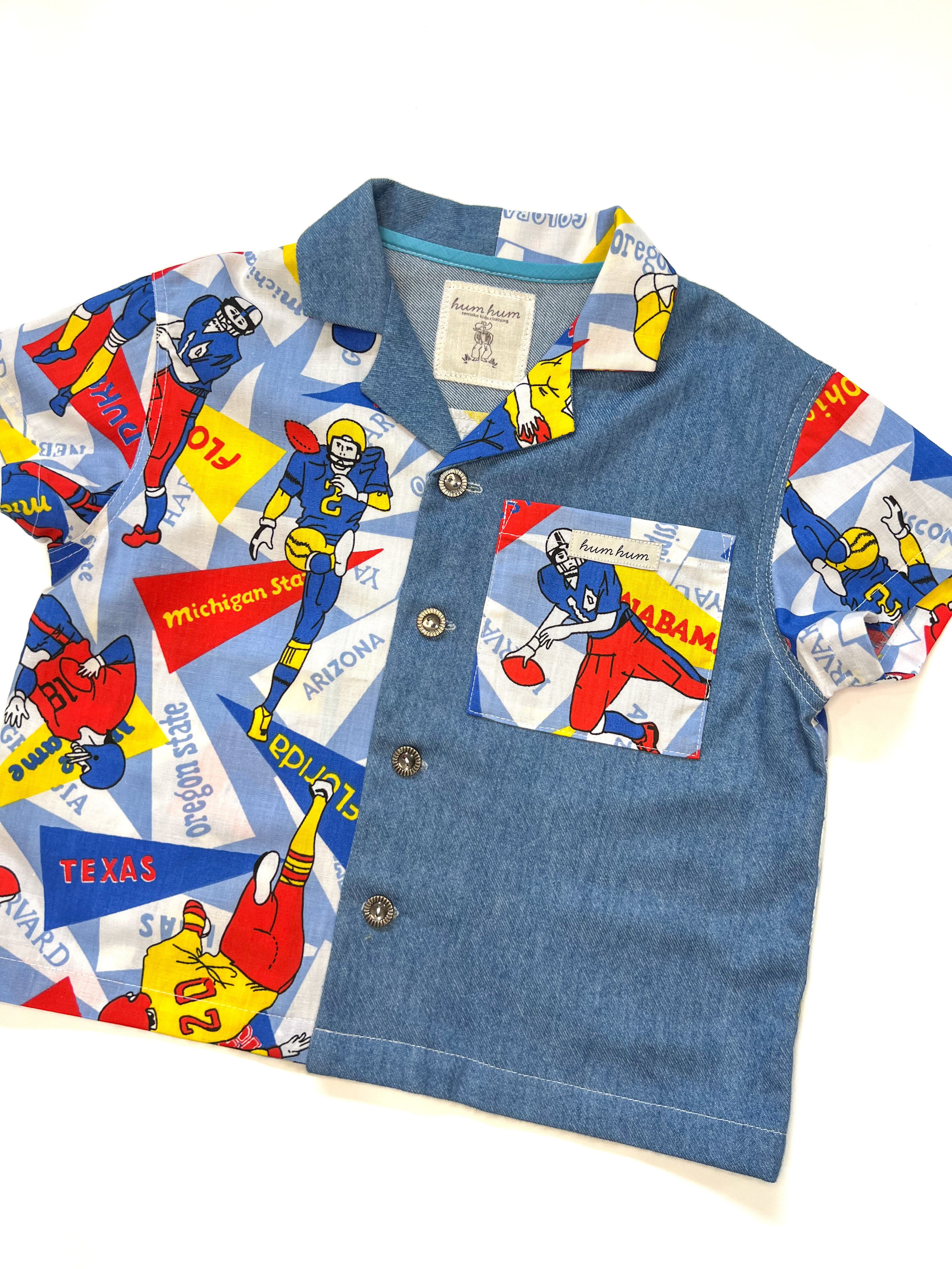 発色が綺麗な柔らかな質感のブルーの生地をミックスして、120サイズの開襟シャンを製作しました。子供服ではなかなか見つけられない柄と生地合わせがとても魅力的な1枚です。