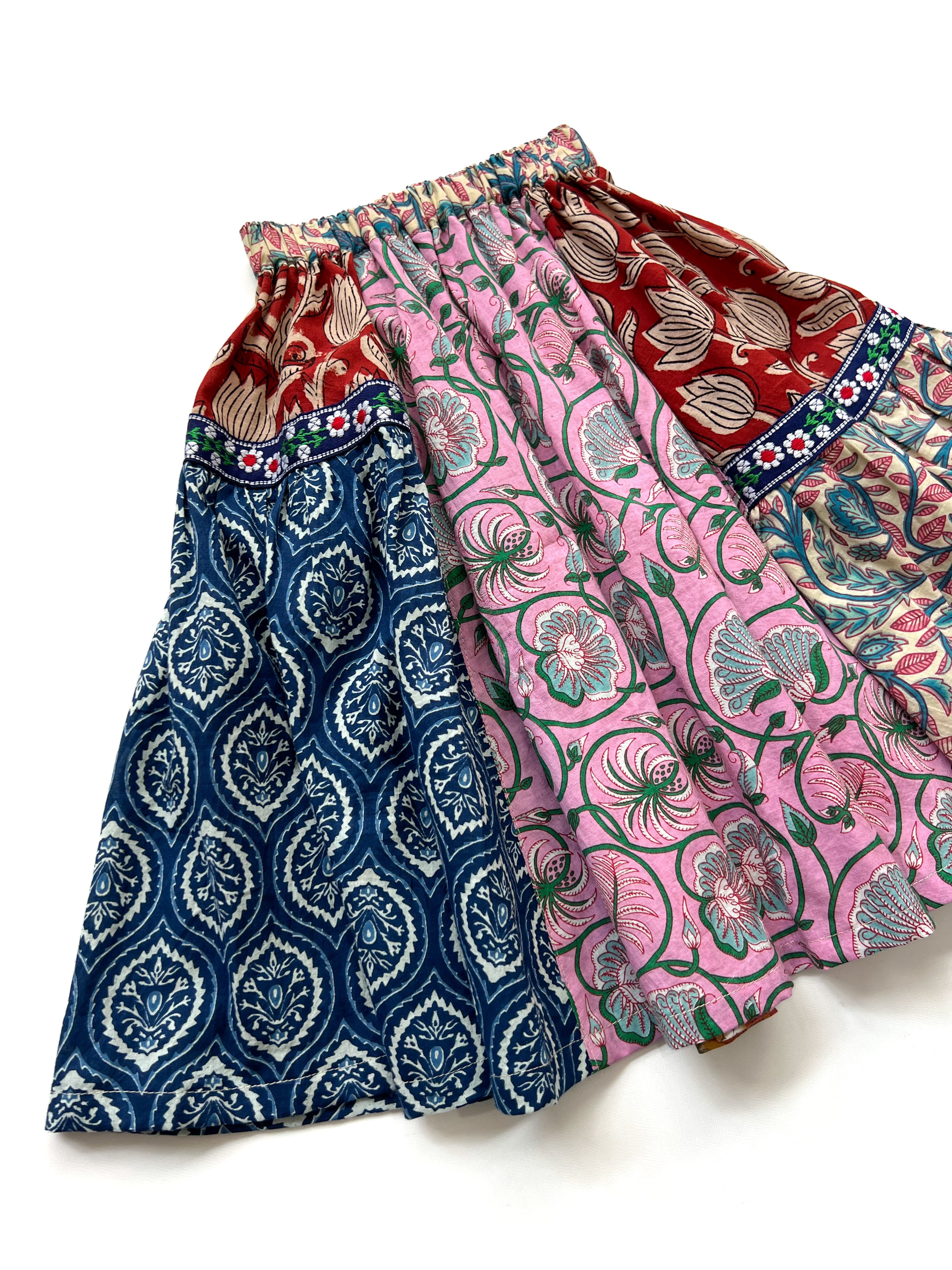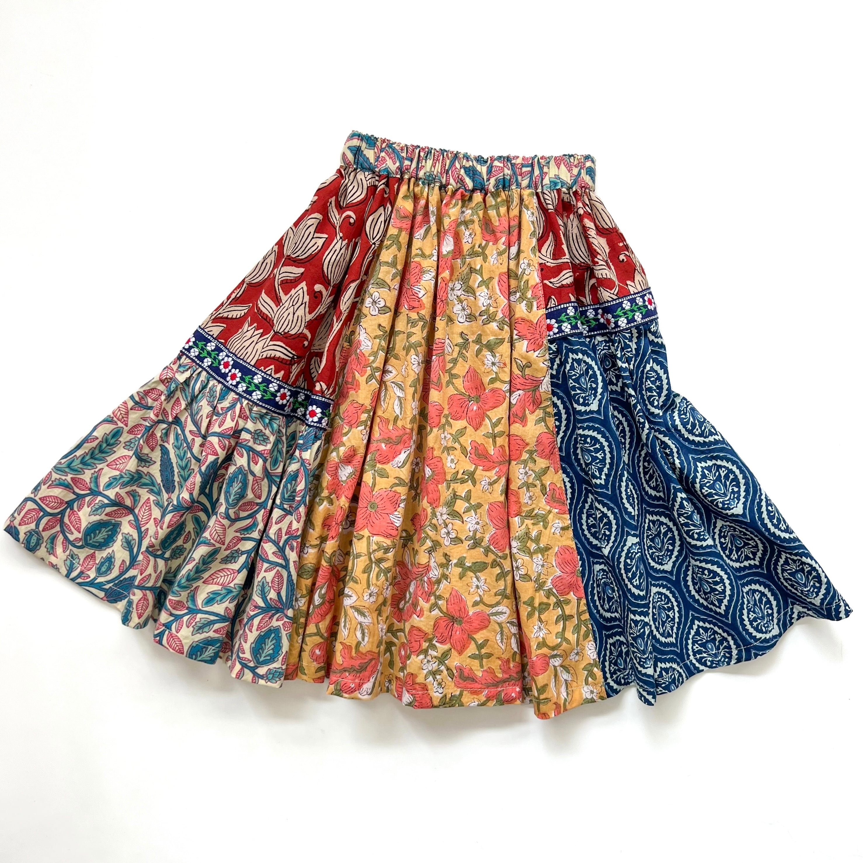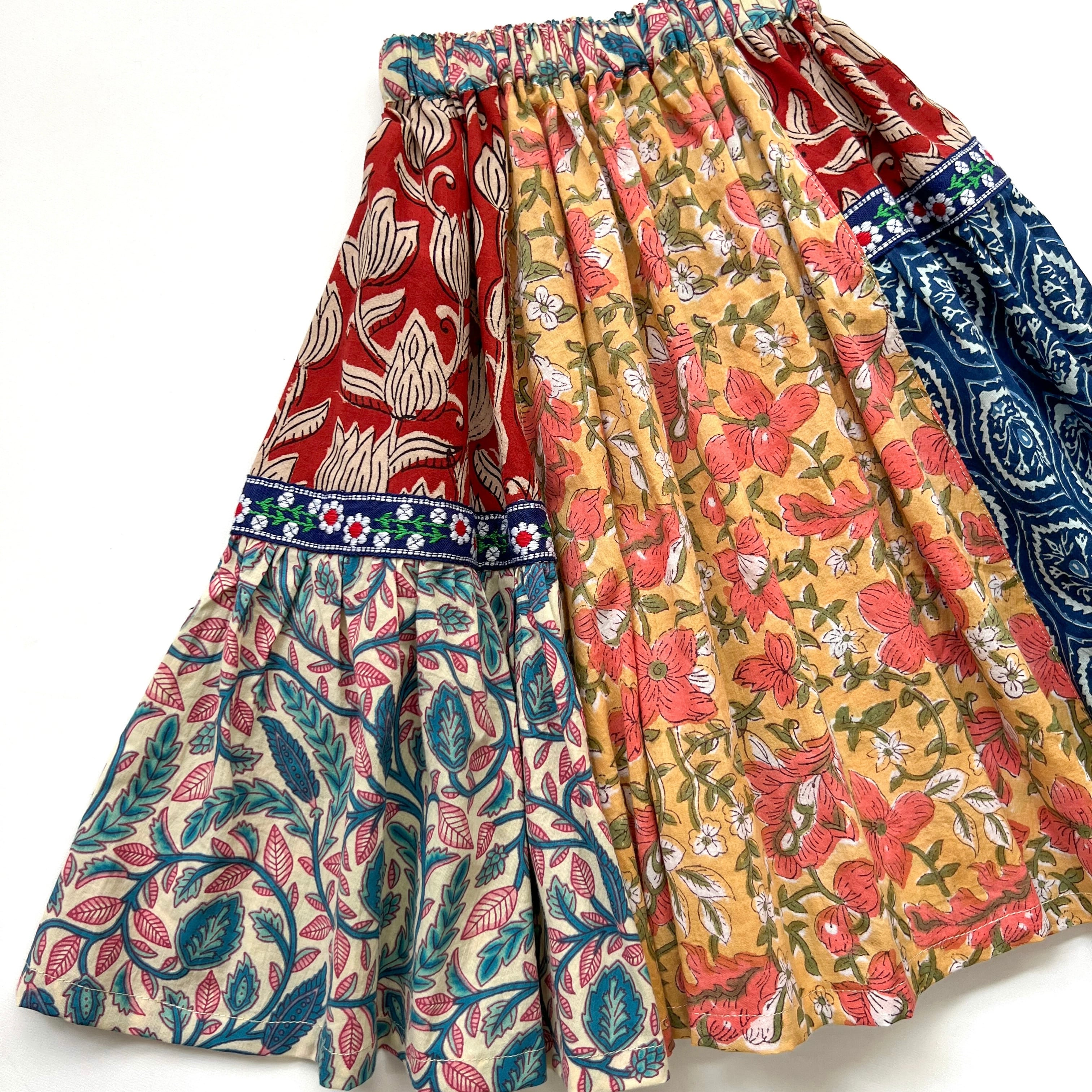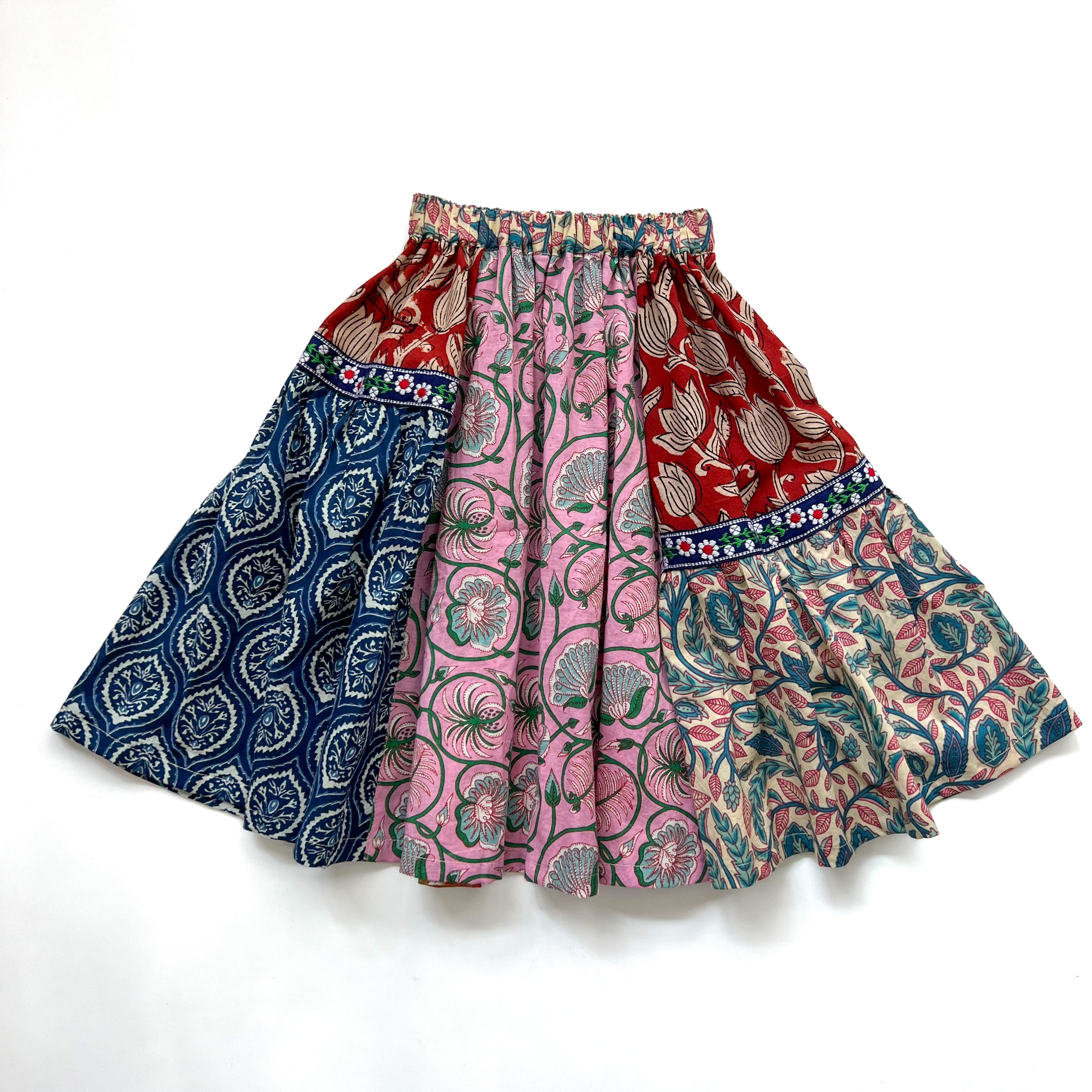 5種類のインド綿をミックスして製作したフレアスカートです。たっぷりと生地を使って、ふわっと動きのでるシルエットに。とても涼しく着ていただけます。ウエストはゴムで脱ぎ着もしやすく、とても楽ちん。