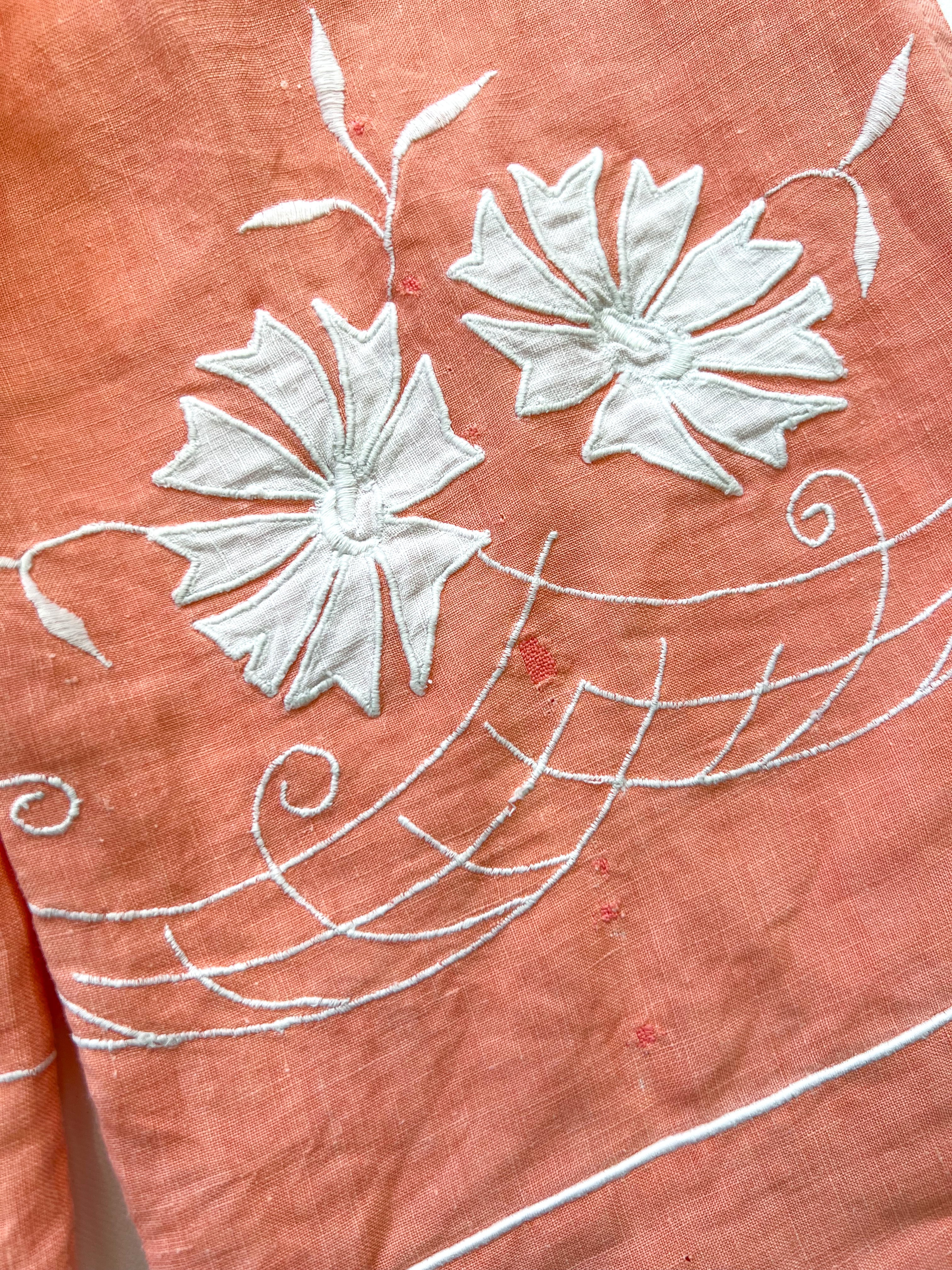 色味がとても珍しいサーモンピンク、アンティークリネンならではの皺感、質感も魅力的な1枚。パンツには元々のクロスの刺繍が絶妙な位置に配置され、大人も思わず着たくなる...リネンパンツです。ウエストはゴムで脱ぎ着もしやすく楽ちん。サラッと涼しく着ていただけるので、これからの季節に活躍するアイテムです。