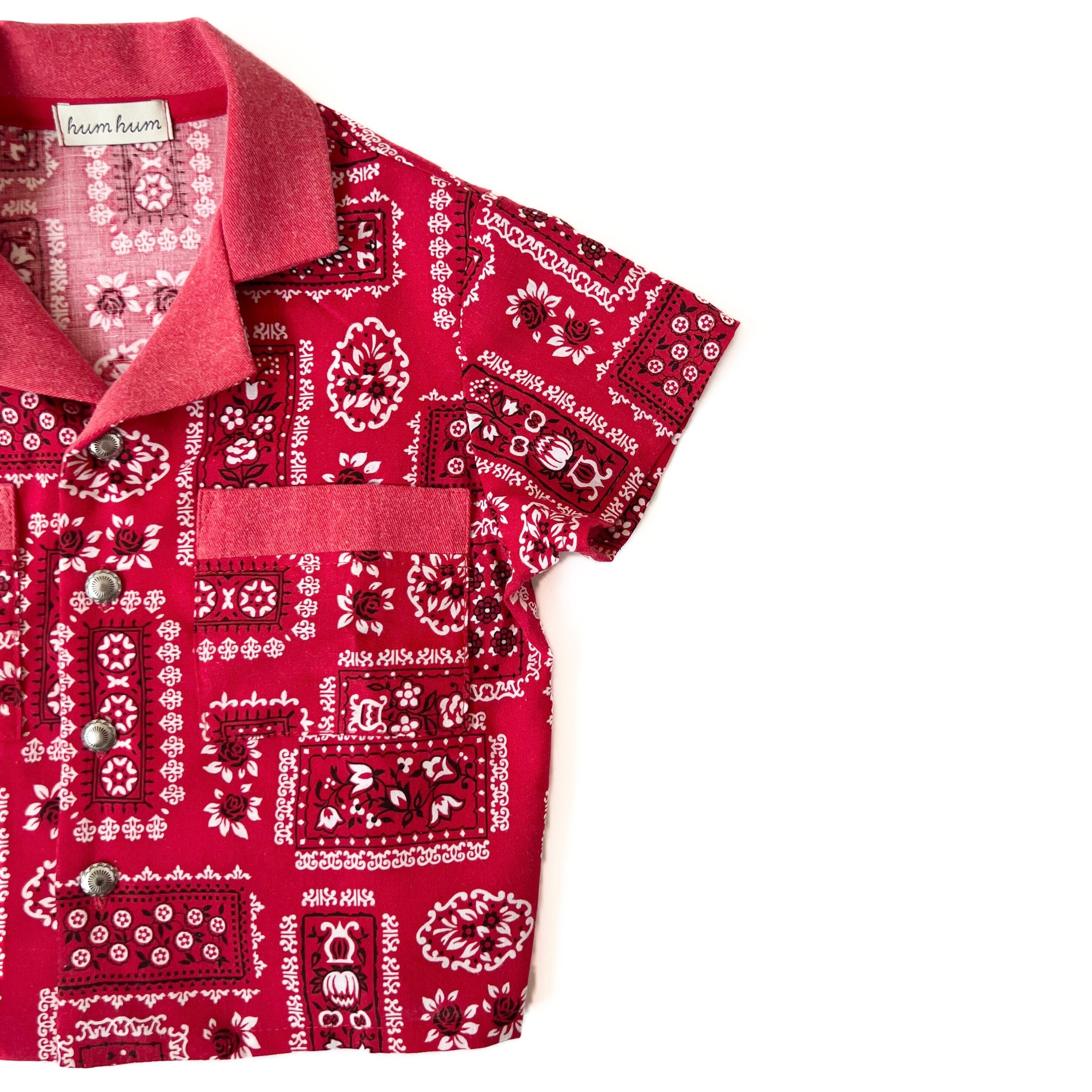大人サイズのUSEDバンダナシャツを、90㎝の半袖開襟シャツにリメイクしました。