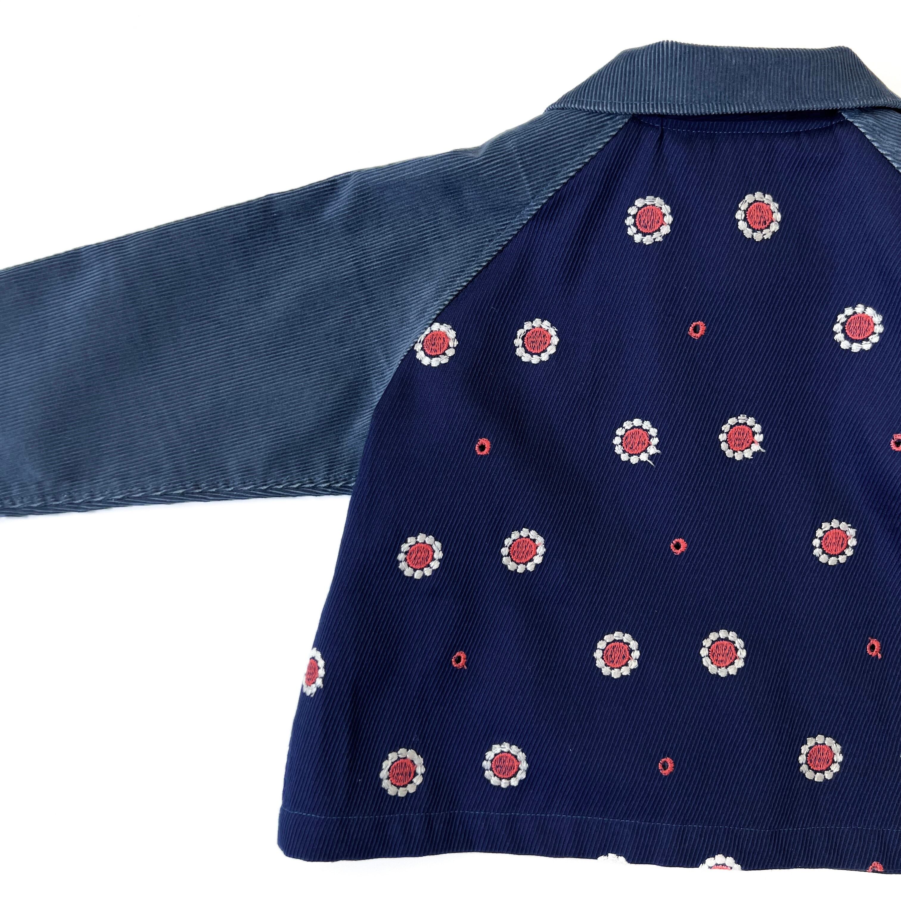 袖は細いコーデュロイ生地で切り替え、前見頃のポケットは、生地の刺繍の柄を活かしパッチポケットにしました。