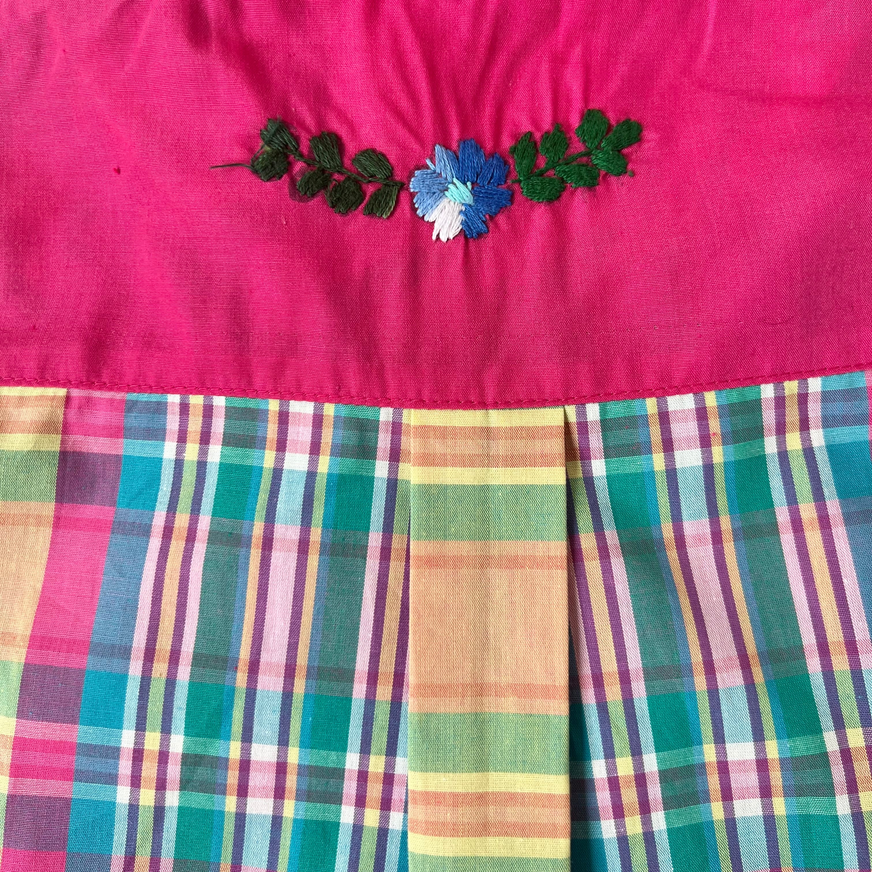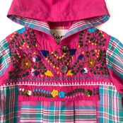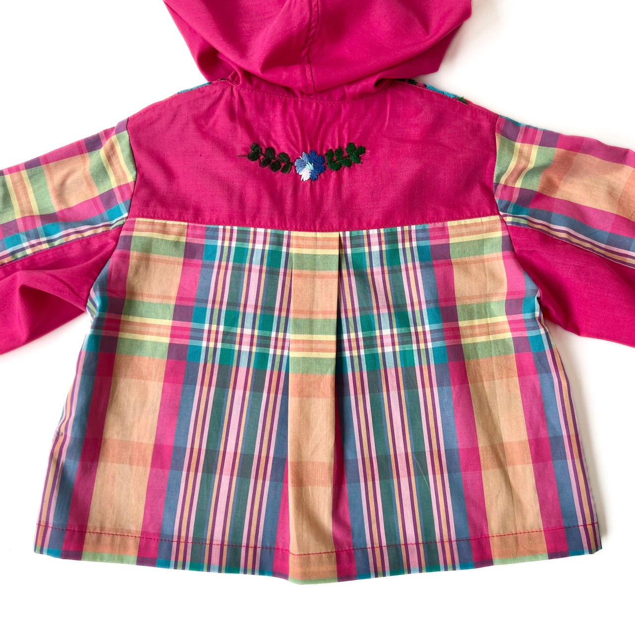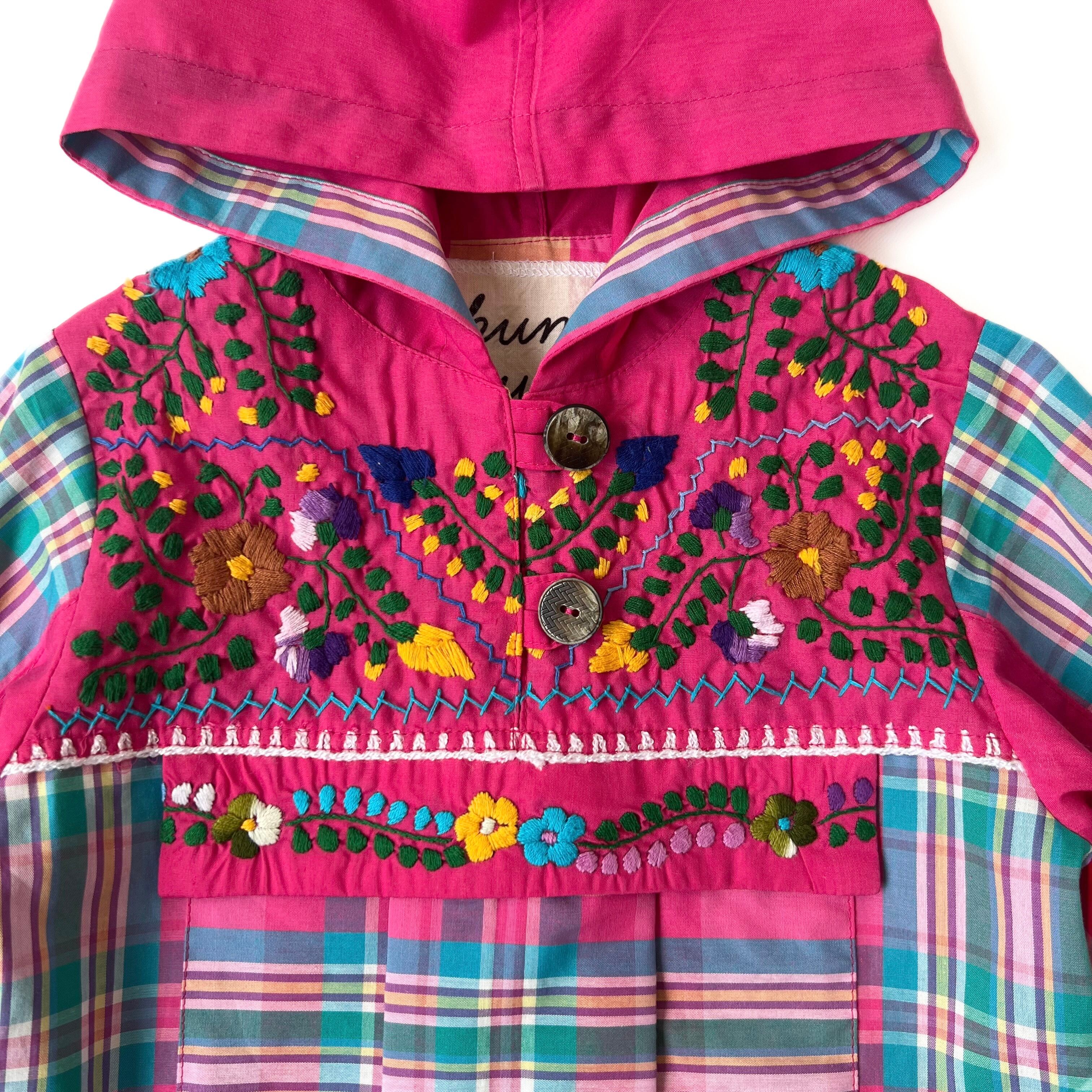 メキシコ刺繍のワンピースをチェック生地とミックスしてフード付きのプルオーバーにリメイクしました。ビビットなピンクとチェックの組み合わせが最強です!!生地感は薄手で軽いので、日除けや、ちょっと肌寒いときにサッと着られるプルオーバーになっております。小さく折りたためるので、鞄に1枚入れておくと、とっっても便利!!