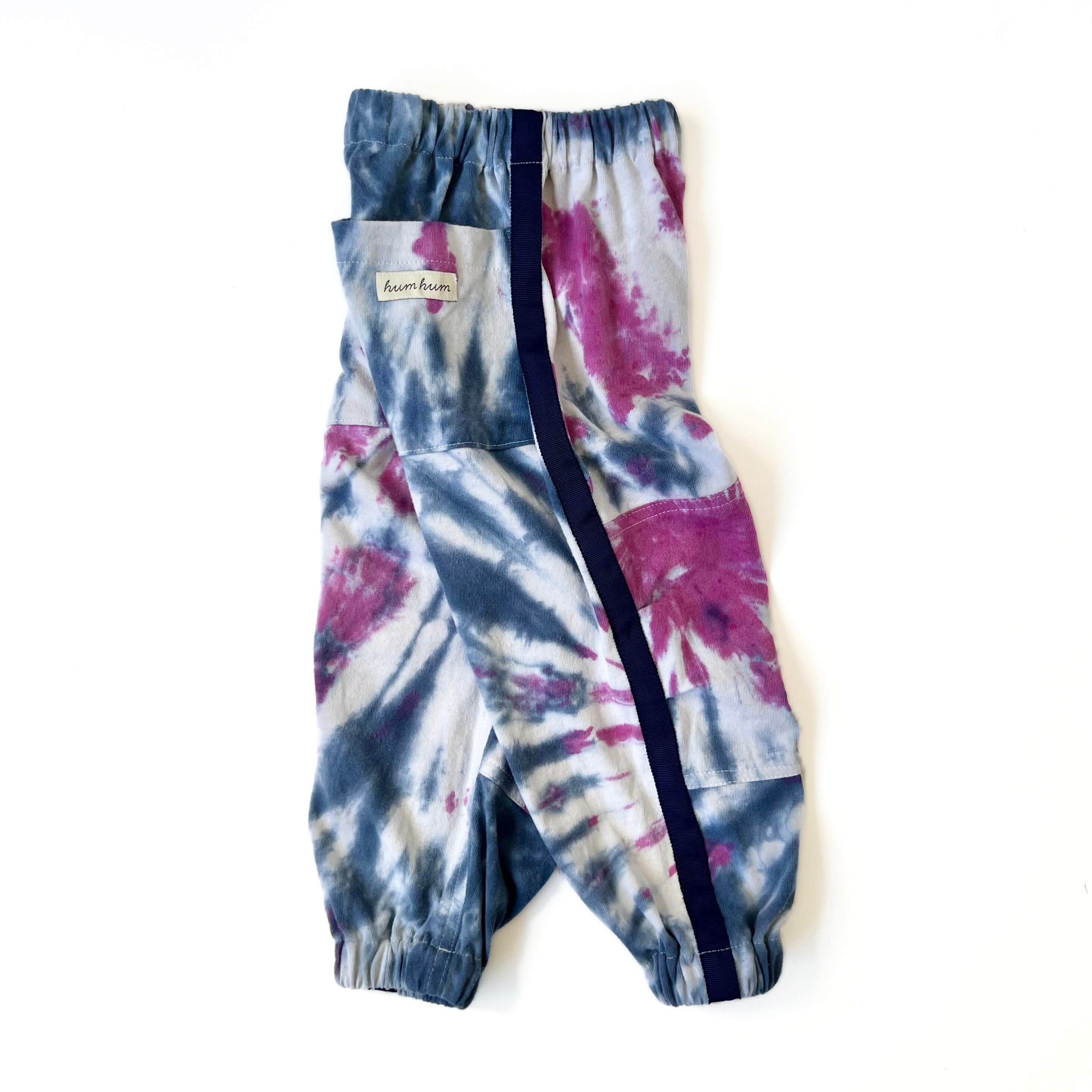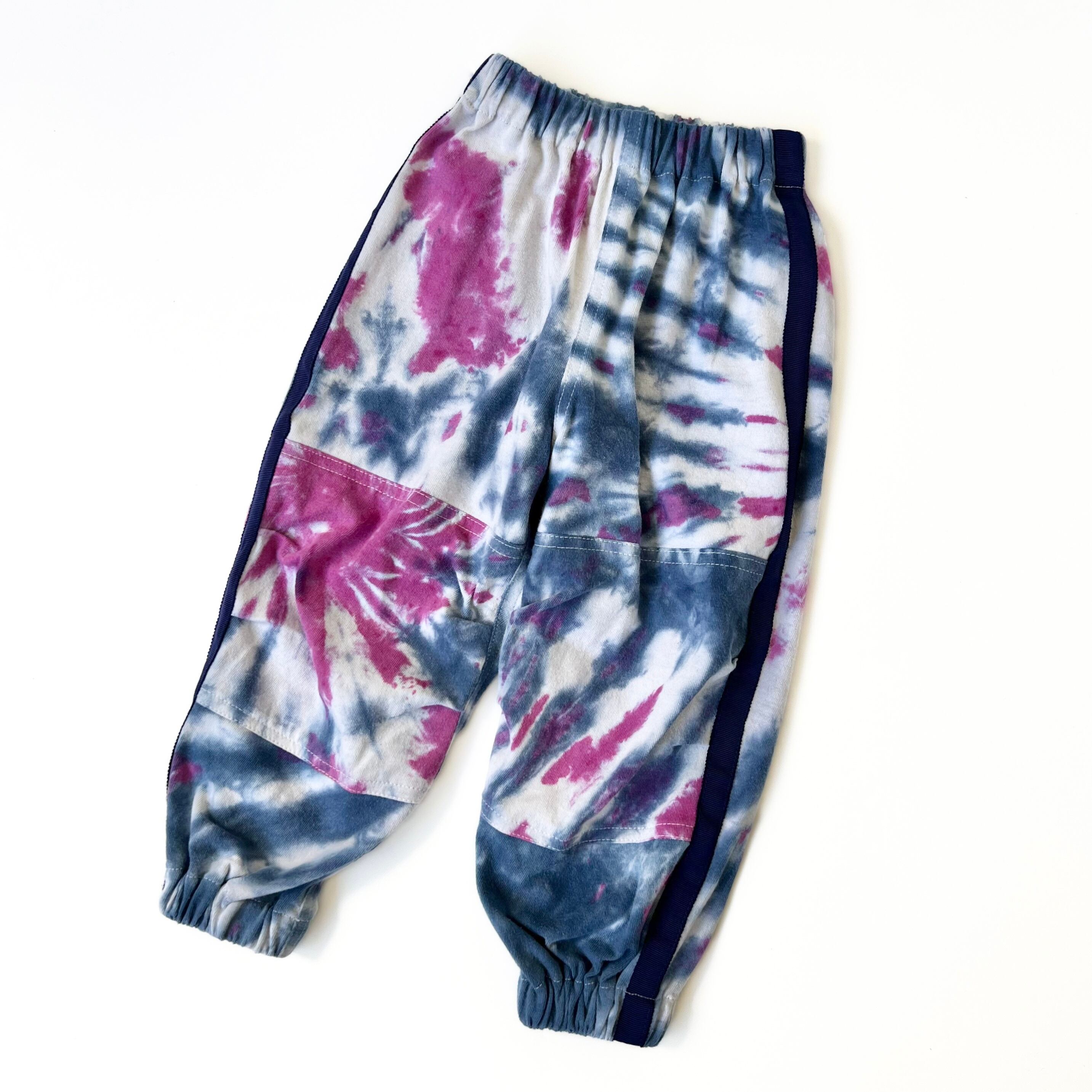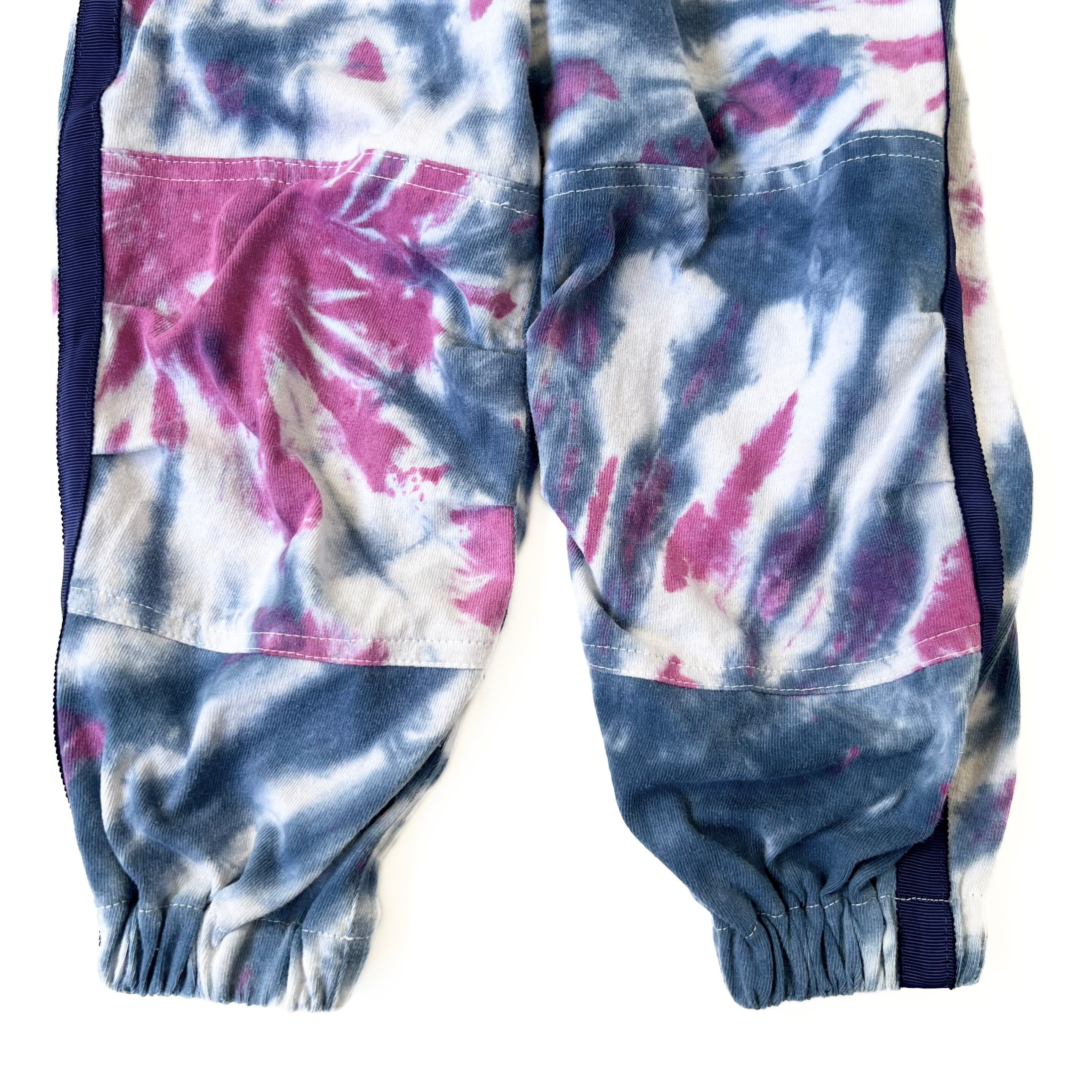 USEDのタイダイのコットン生地をパンツにリメイクしました。ウエストはゴムで履かせやすく、裾はゴムで足首でキュッと止まるので、少し大きめのサイズ感でも履いていただけます。