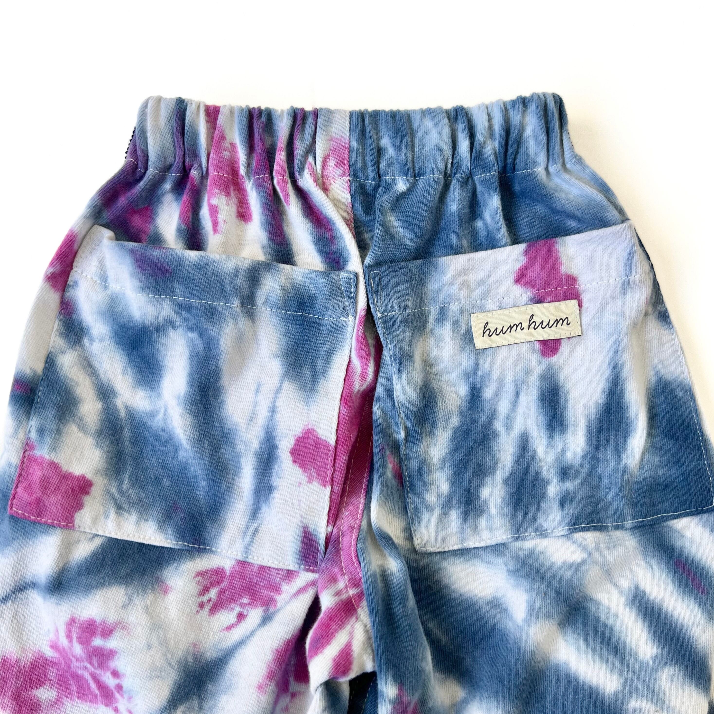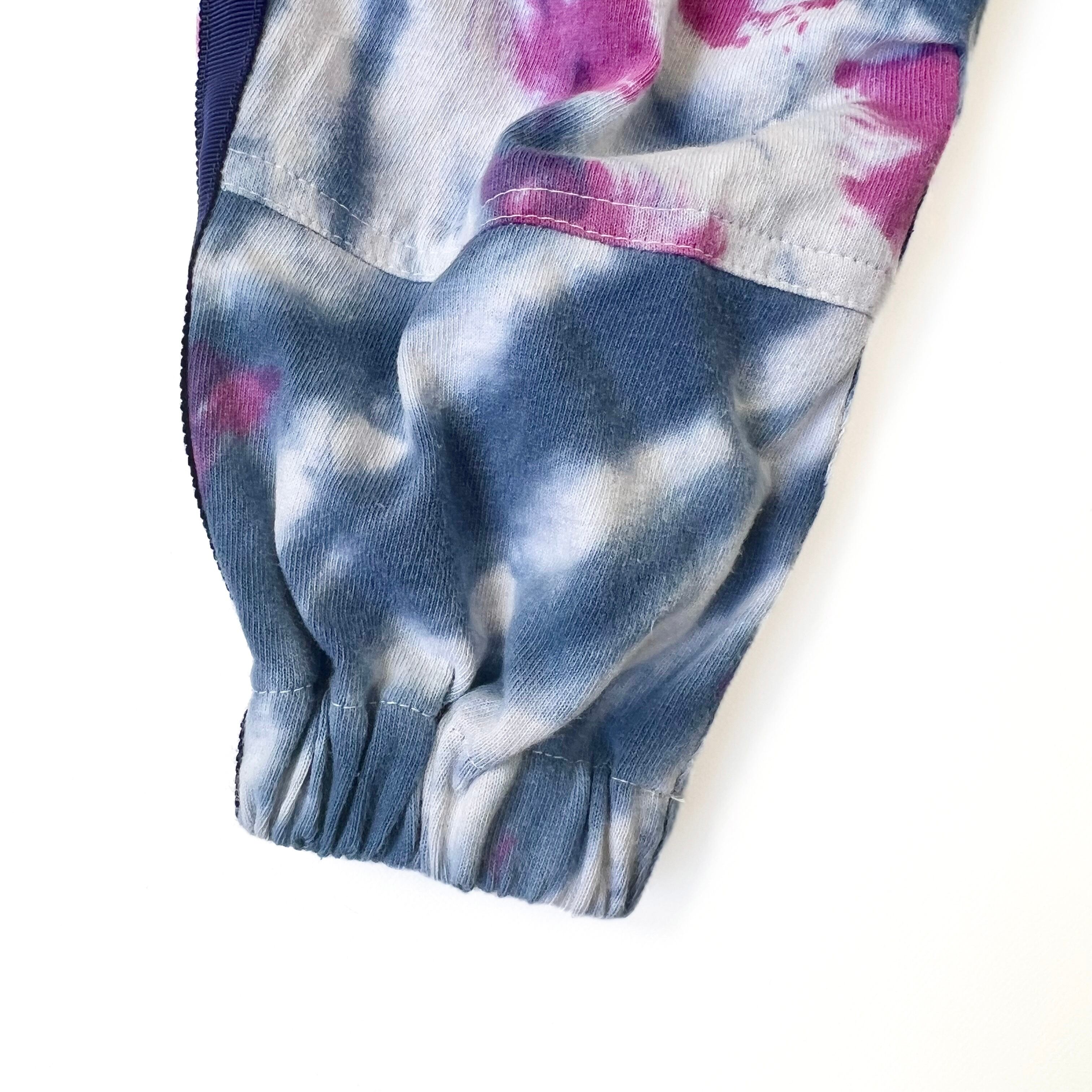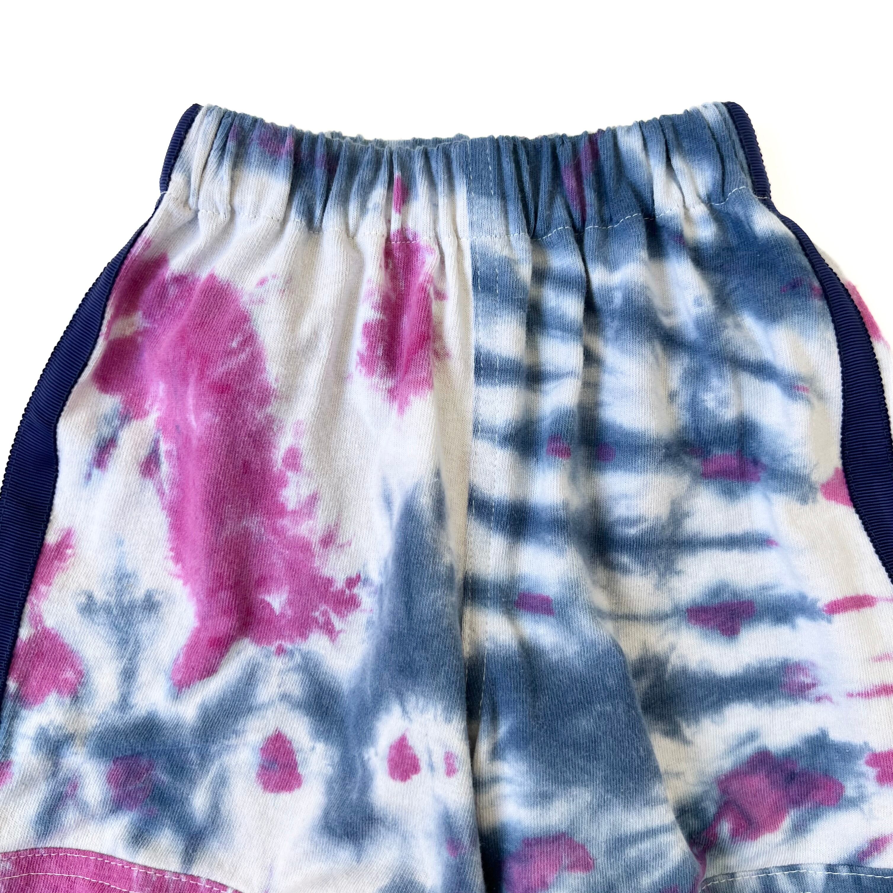 USEDのタイダイのコットン生地をパンツにリメイクしました。ウエストはゴムで履かせやすく、裾はゴムで足首でキュッと止まるので、少し大きめのサイズ感でも履いていただけます。