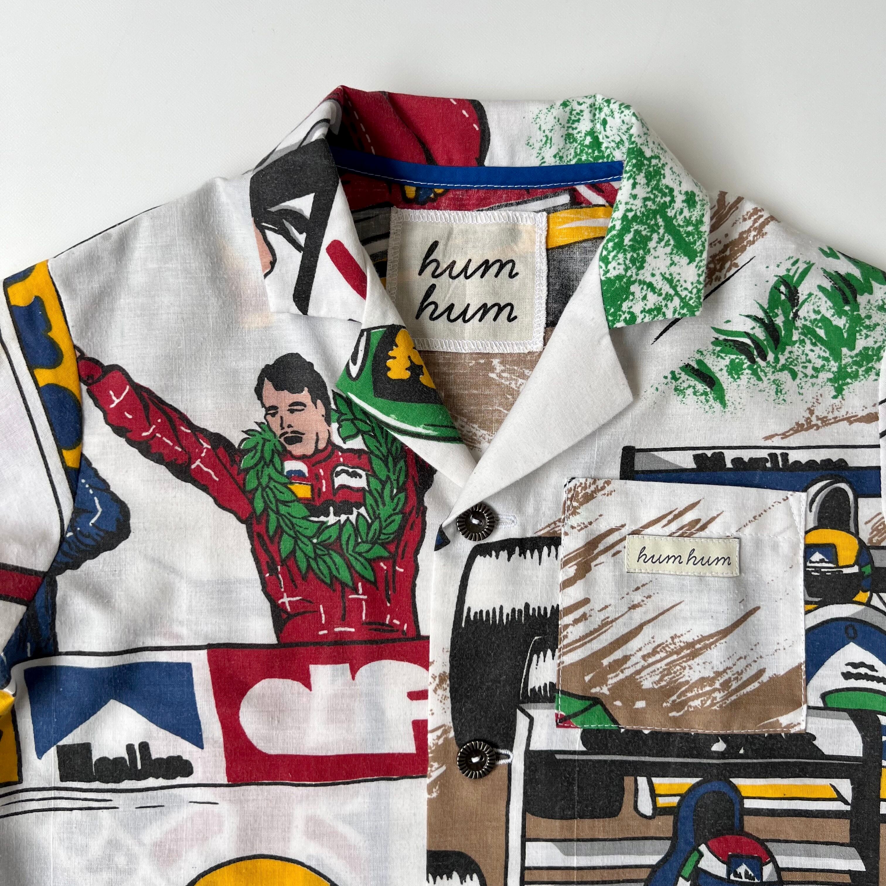 F1レースプリントのvintageシーツを半袖の開襟シャツにリメイクしました。