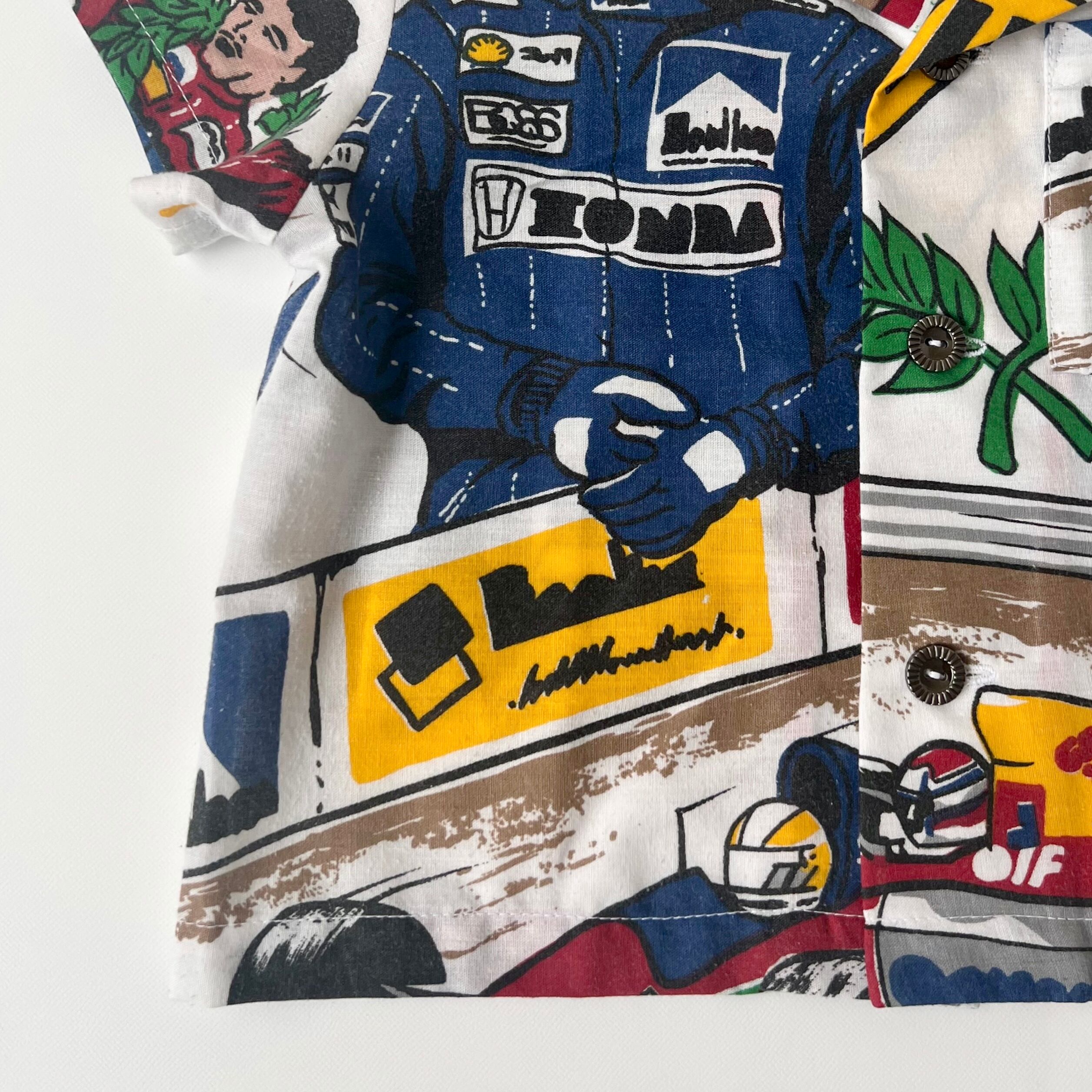 F1レースプリントのvintageシーツを半袖の開襟シャツにリメイクしました。