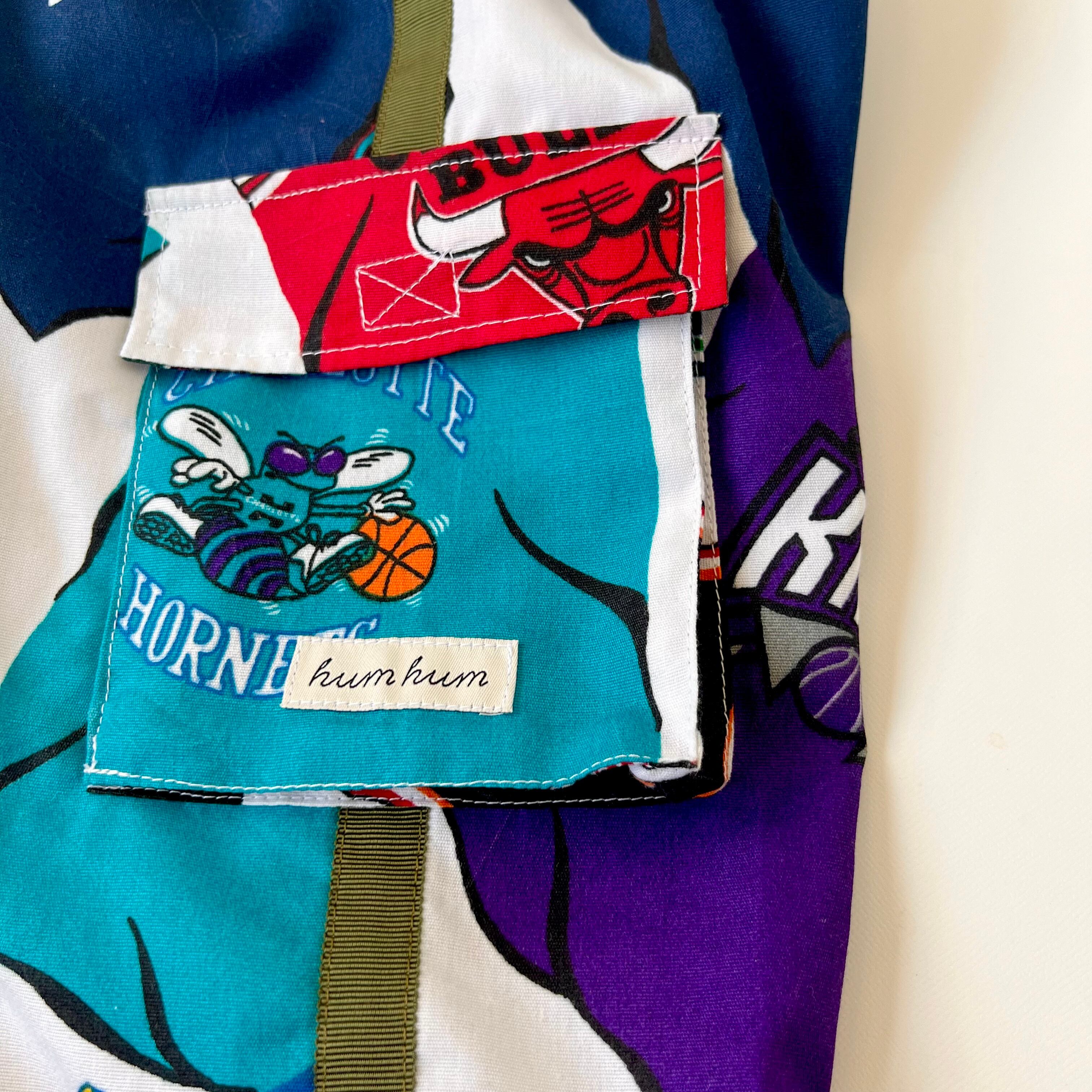 ユニークなプリントがvintage生地の魅力のひとつ。パリッとした張りのある生地感で、汗で肌に張り付かないように、裏地を付けました。汗を吸収してくれるので、快適に履いていただけます。