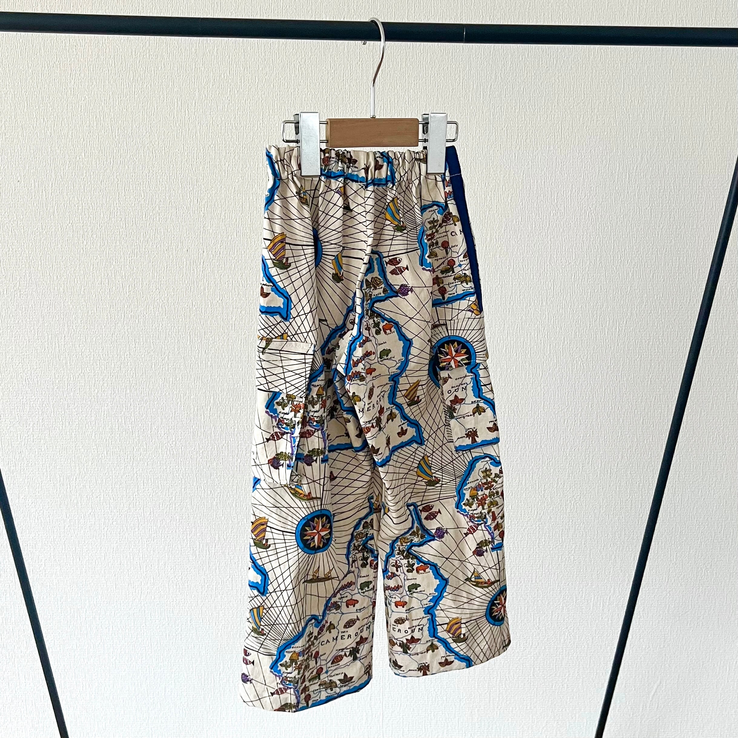 よくみると地図の場所はカメルーンです。船、魚、植物など色んなプリントがはいっていて、見ているだけでとても楽しい1着です。