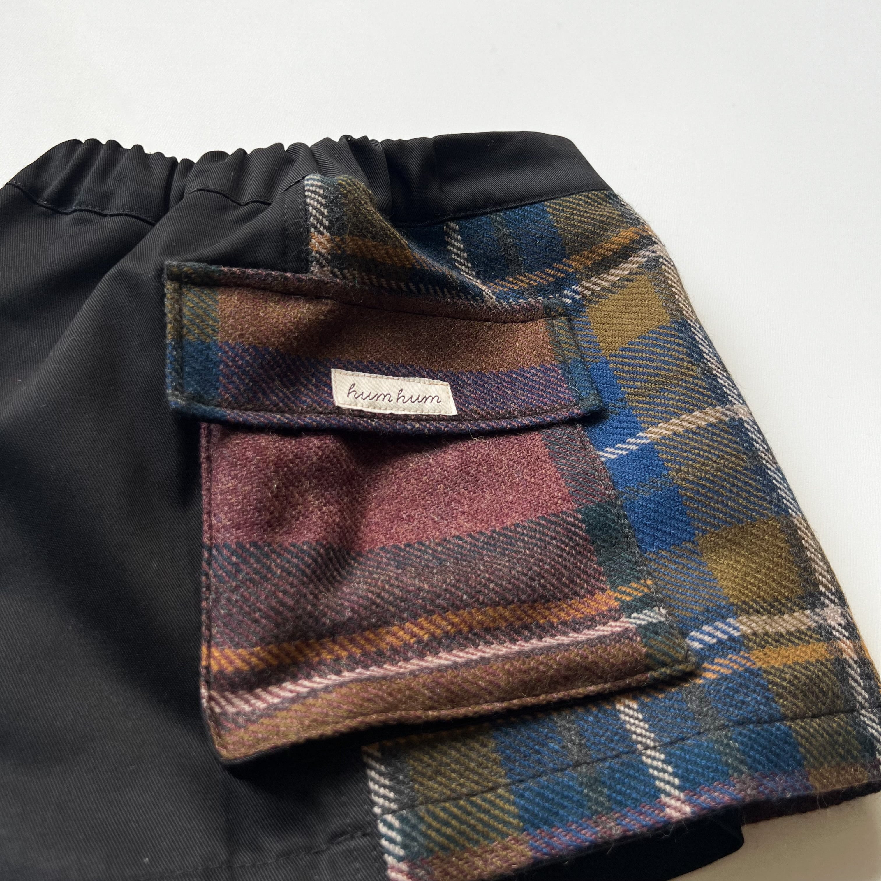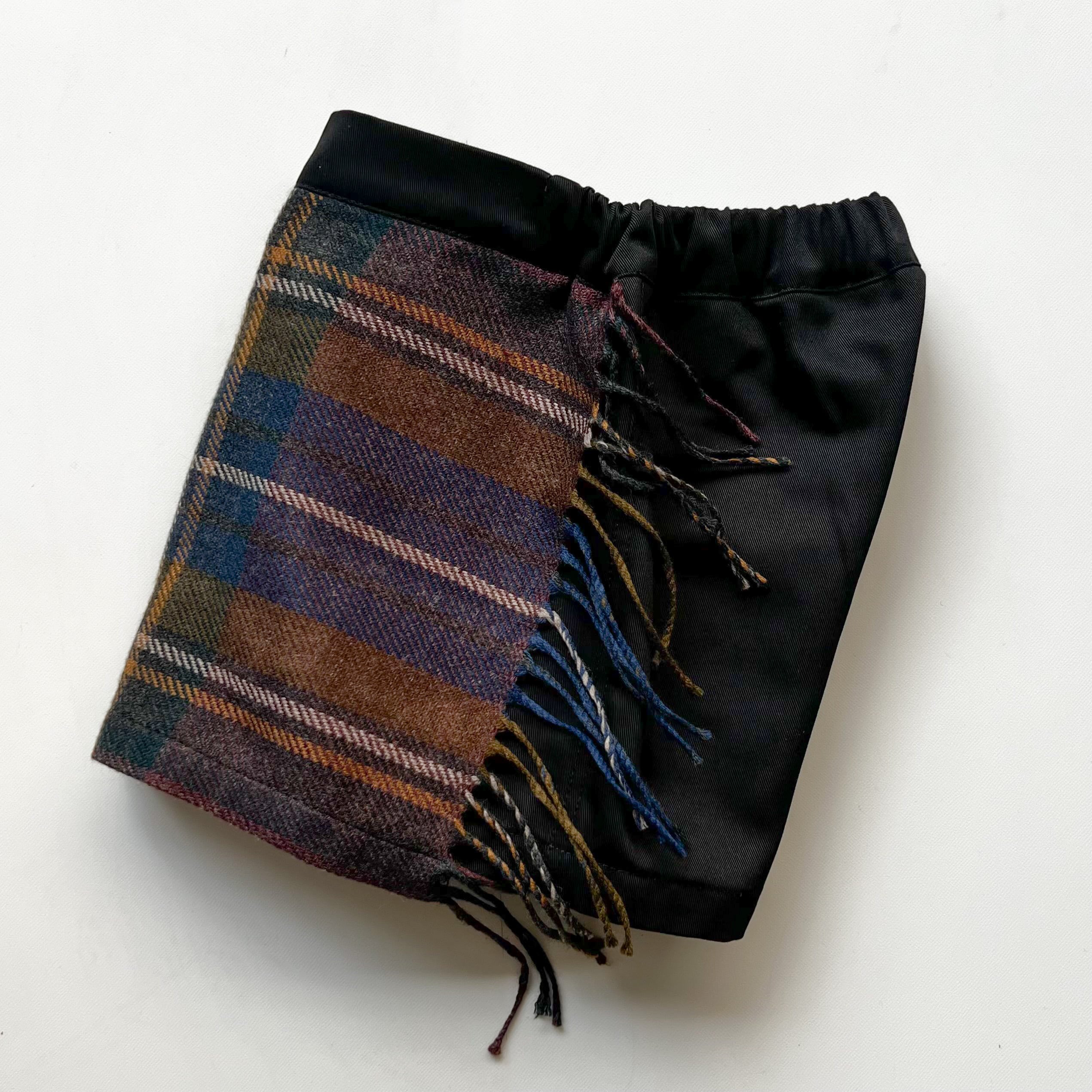 シックな雰囲気に仕上がったチェック柄のラップパンツです。前から見るとスカート、後ろから見るとショートパンツ。デザイン性もありますが、とても動きやすいです。前見頃のスカート部分はUSEDのドイツ製のストールから生地を使い、ストールのフリンジ部分を活かしました。