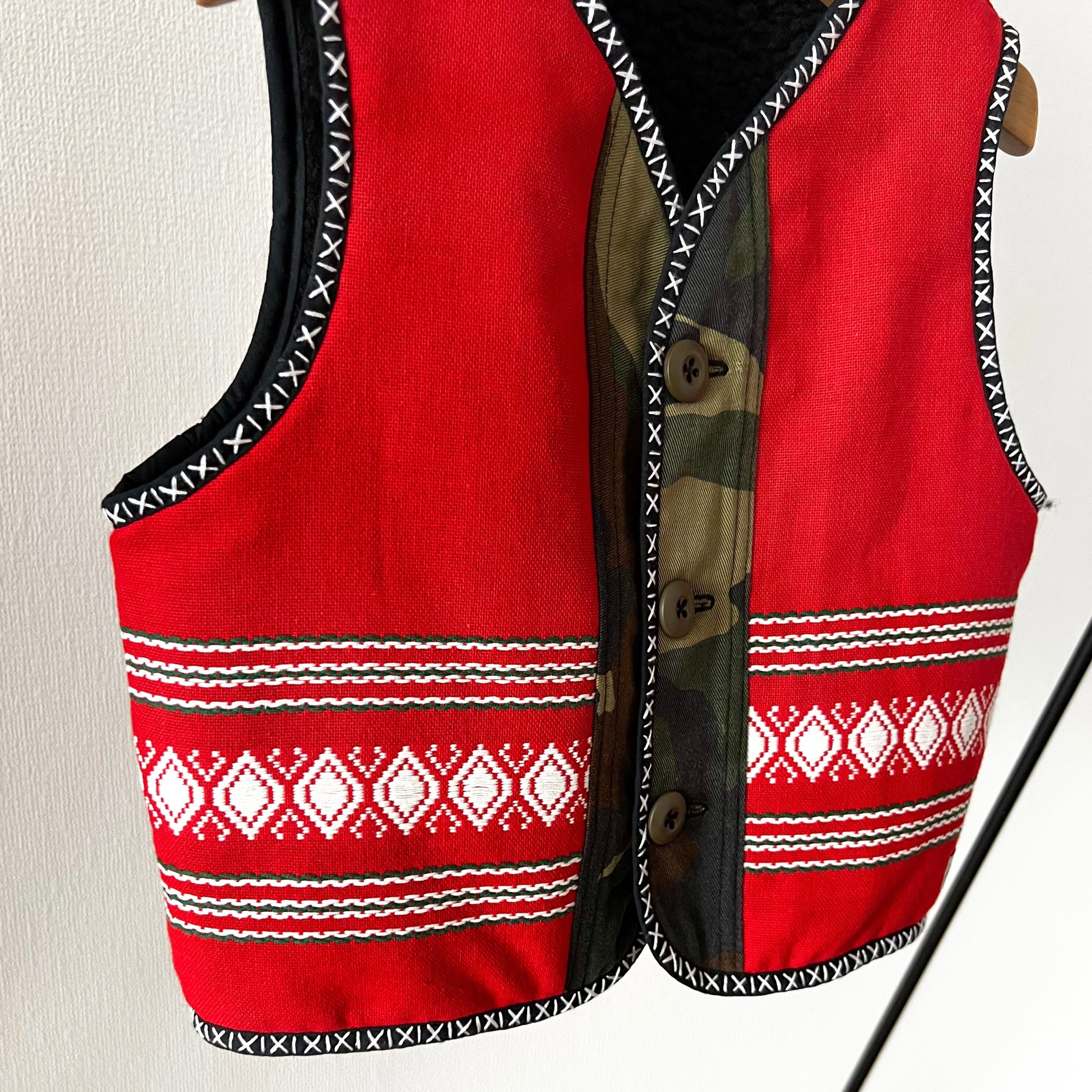 表地は発色と刺繍が綺麗な70年代のスウェーデンのテーブルクロスからリメイク。裏地はふわふわとしたボアを使って、それぞれに魅力のあるリバーシブルベストを製作しました。両面ともまったく雰囲気が違うのでコーディネートが楽しくなりますね!!