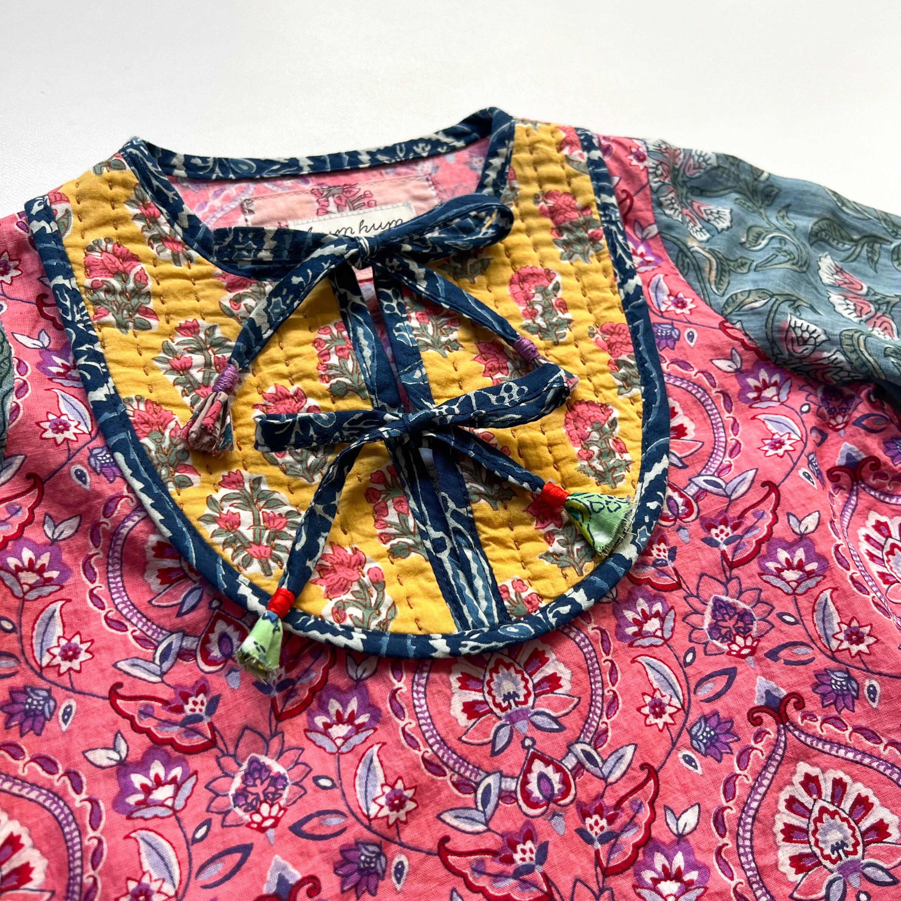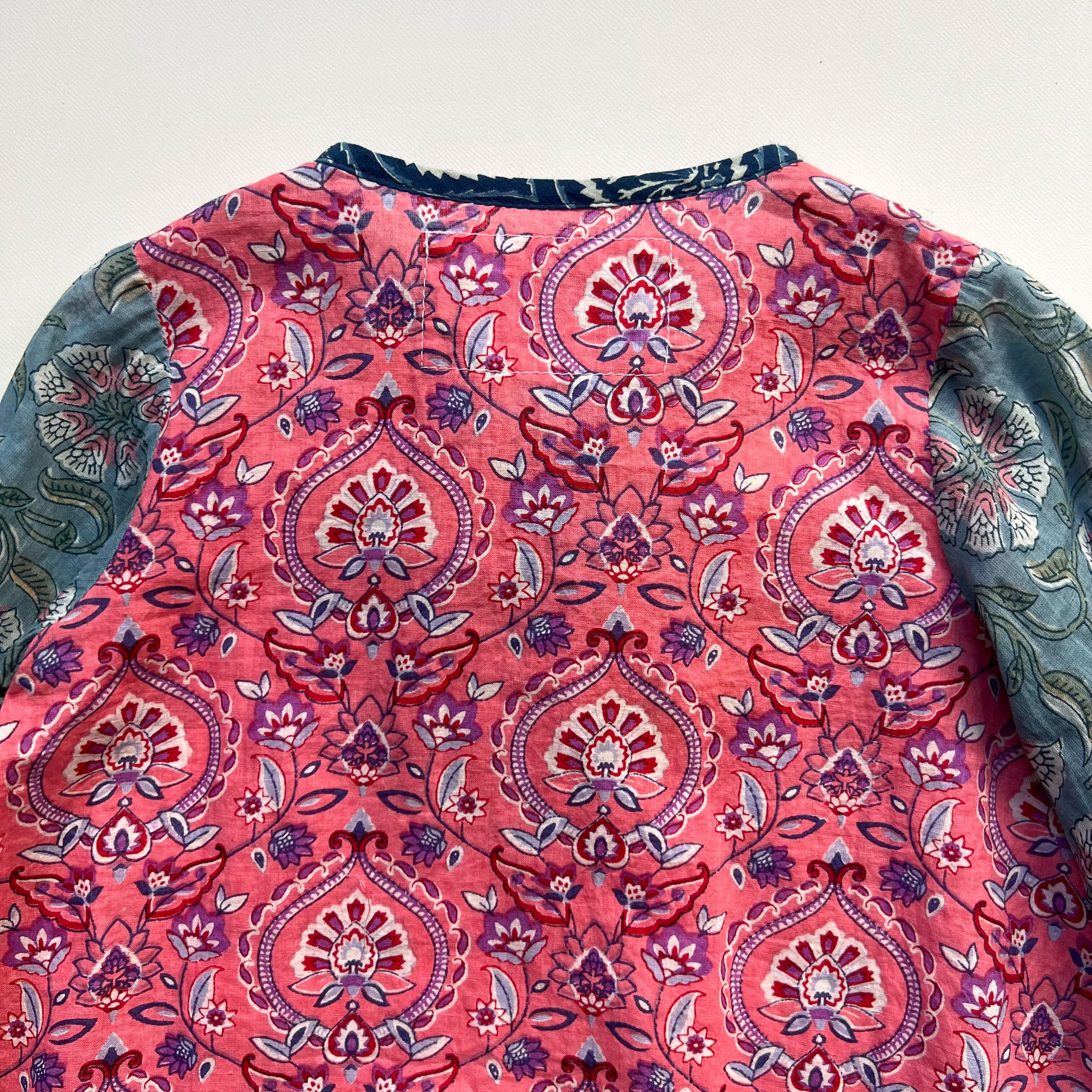 vintageのインド綿ブラウスからインスピレーションを得て、キッズサイズがあったら絶対に可愛い!という思いで、4種類のインド綿をミックスしたブラウスを製作しました。