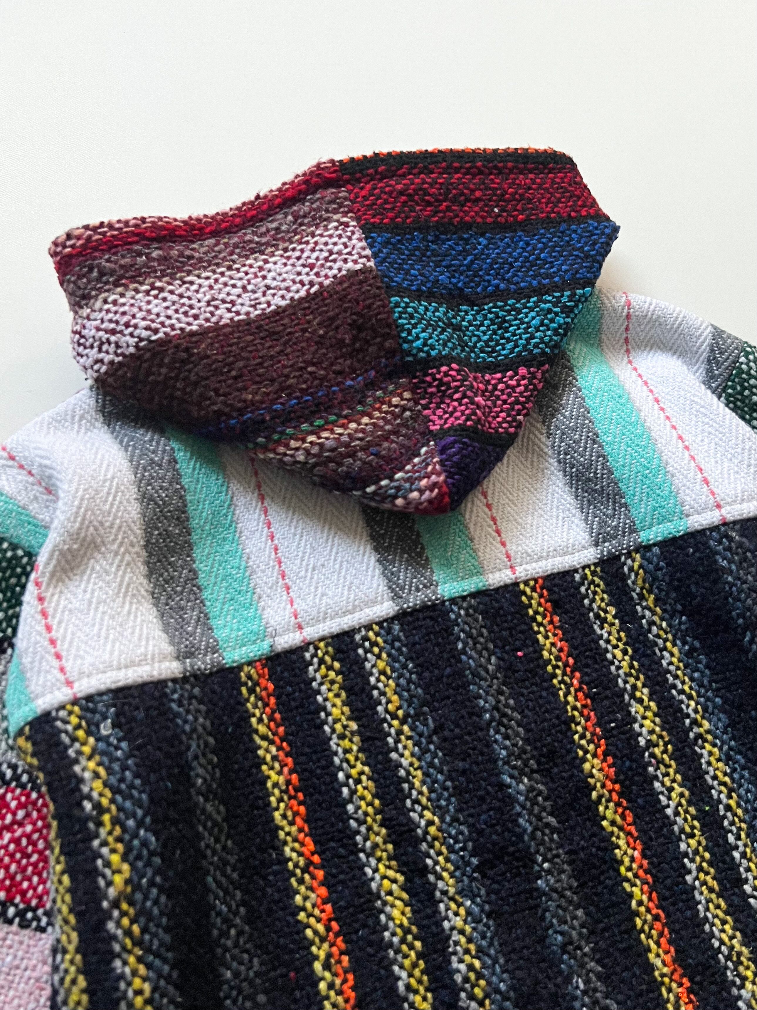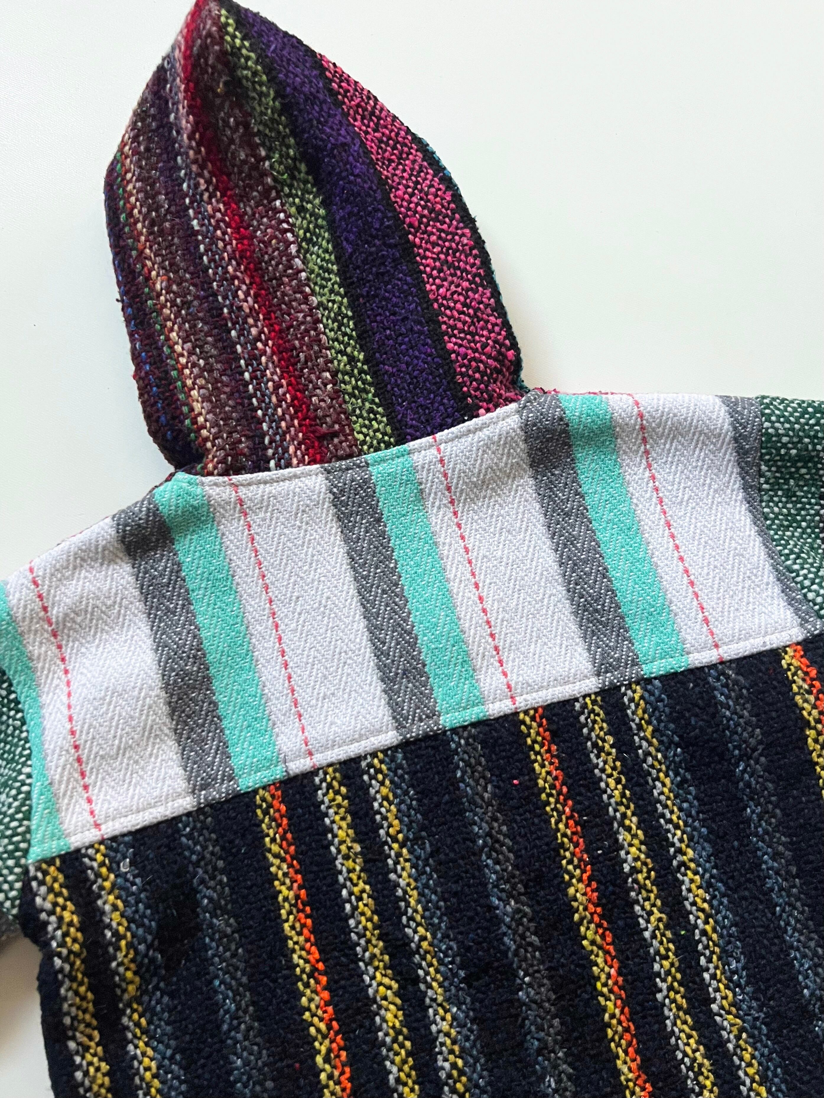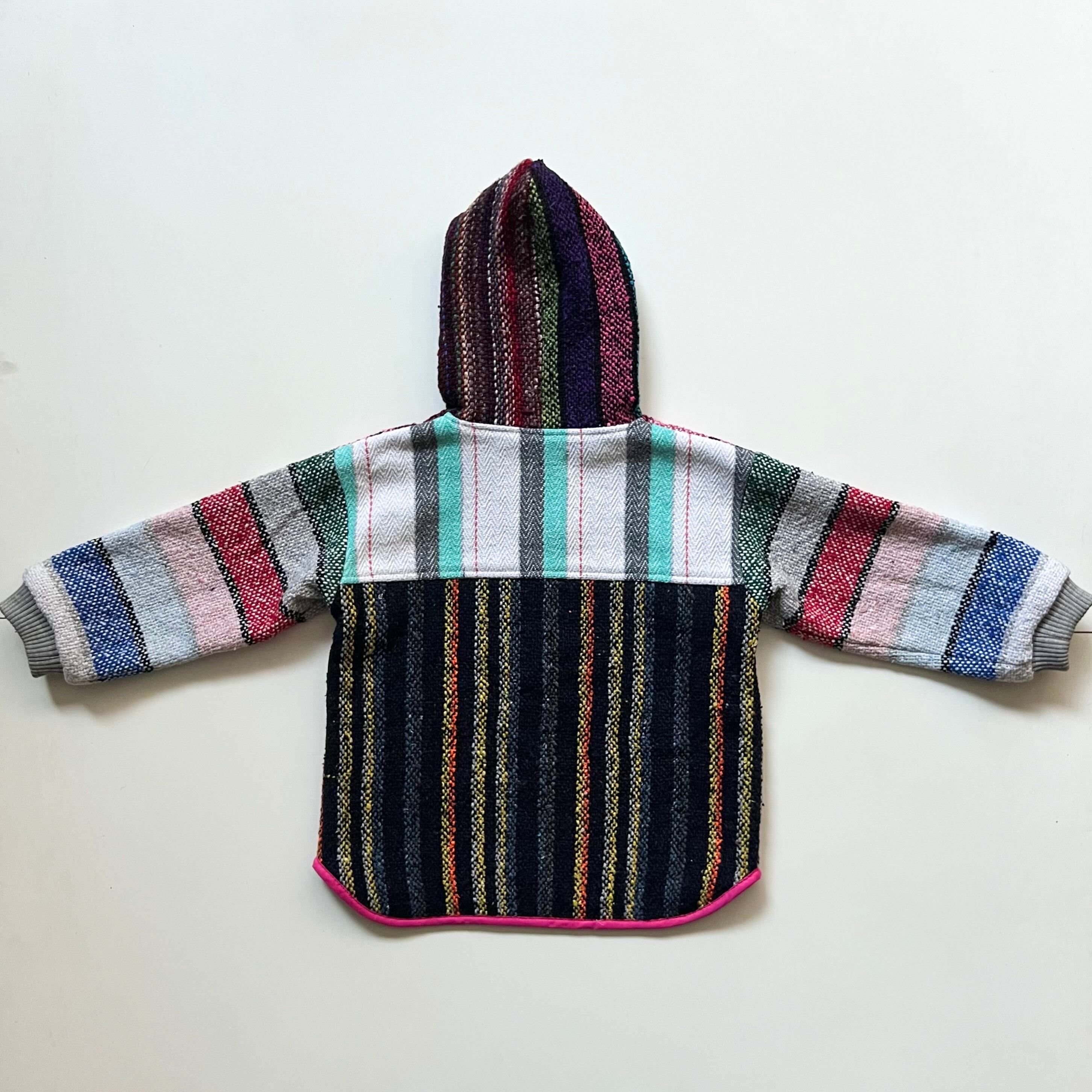 大人サイズのUSEDメキシカンパーカーを1度解体し、110サイズのキッズメキシカンパーカーに再構築しました。7種類のメキシカンパーカーの生地を合わせたミックスバージョンです。