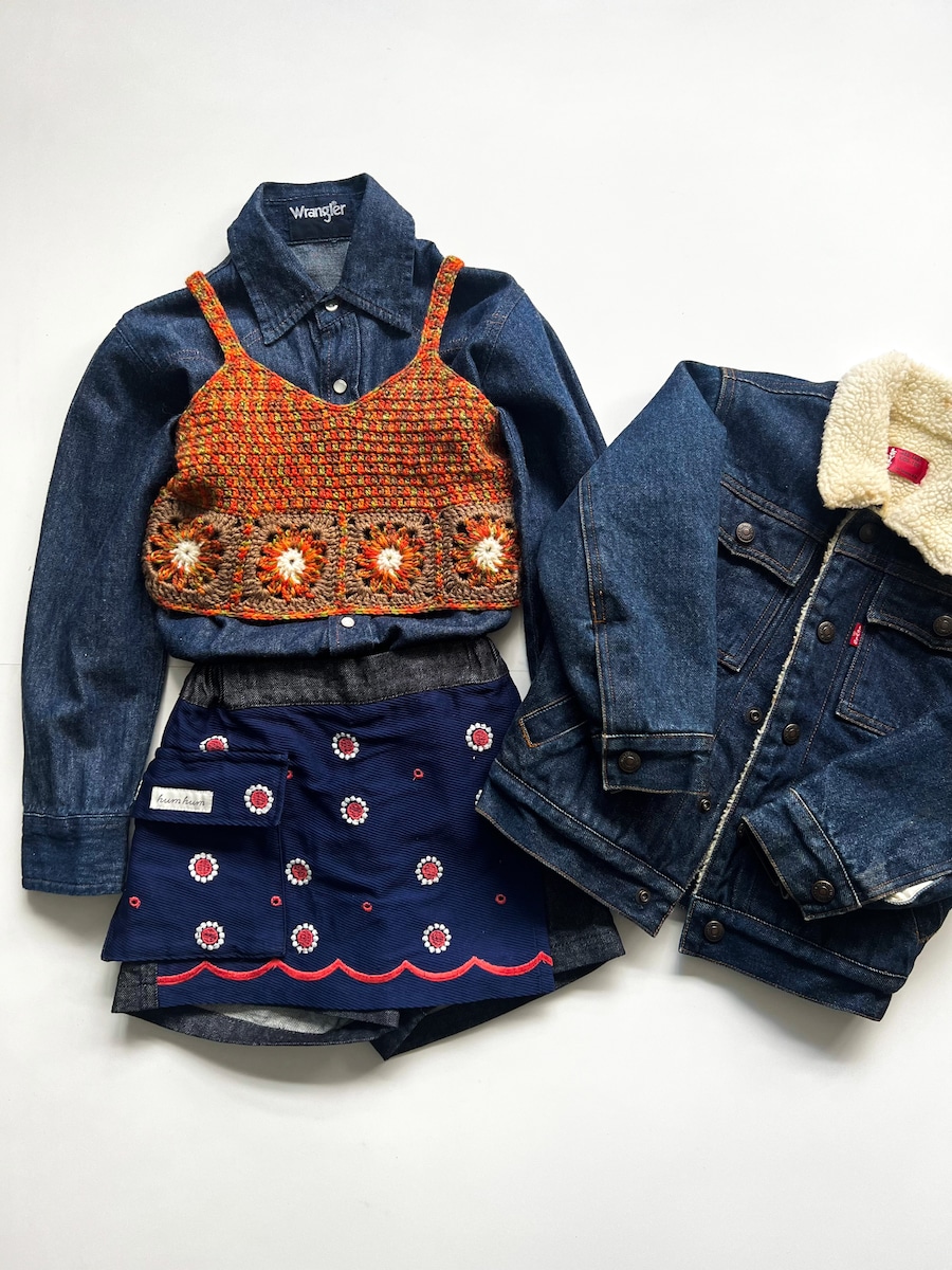 ミックスカラーの毛糸と花柄モチーフがとてもマッチしている1着です。ニットビスチェはスウェットやシャツやロンTなどに重ねるだけで、コーディネートがより可愛いくなるので、とてもおすすめなアイテムです♡